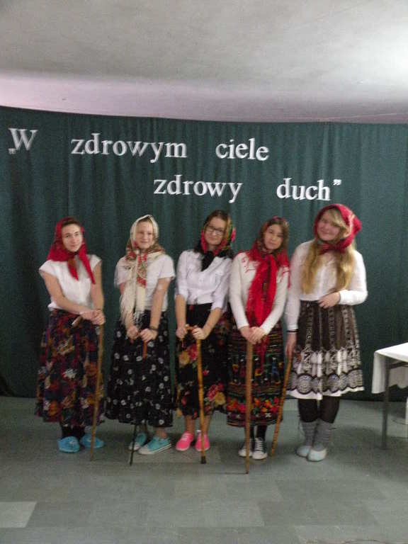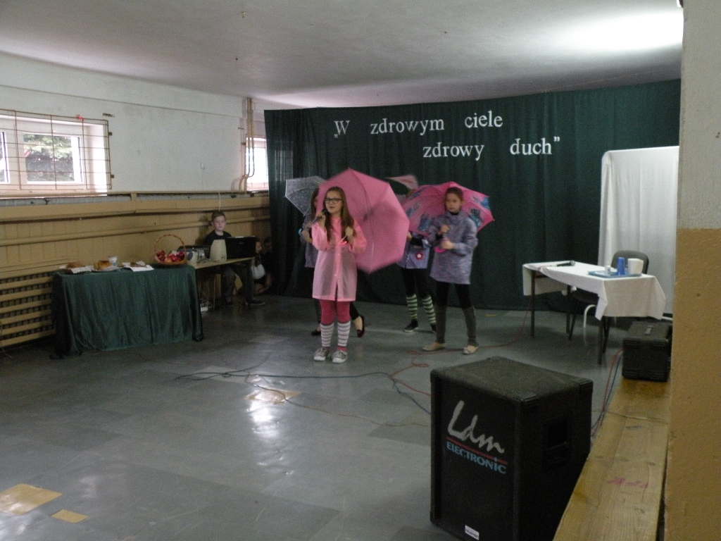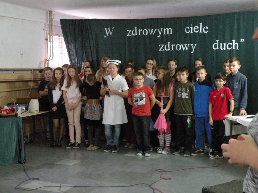 Część artystyczną przygotowali uczniowie klasy V przy niewielkiej pomocy koleżanek z klasy II gimnazjum. W inscenizacji „Wizyta u lekarza..” dzieci przypomniały swoim kolegom i koleżankom zasady zdrowego odżywienia, piramidę żywieniową , zasady zdrowego komponowania posiłków oraz zwrócili uwagę na rolę ruchu w zachowaniu zdrowia. Przedstawienie uświetniły wiersze, śmieszne i wesołe piosenki oraz tańce. Mamy nadzieję, że wszyscy obecni wezmą sobie do serca usłyszane rady i wyrzucą ze swojego jadłospisu przekąski takie jak: chipsy, frytki, coca colę i zastąpią je zdrowymi owocami i warzywami.
