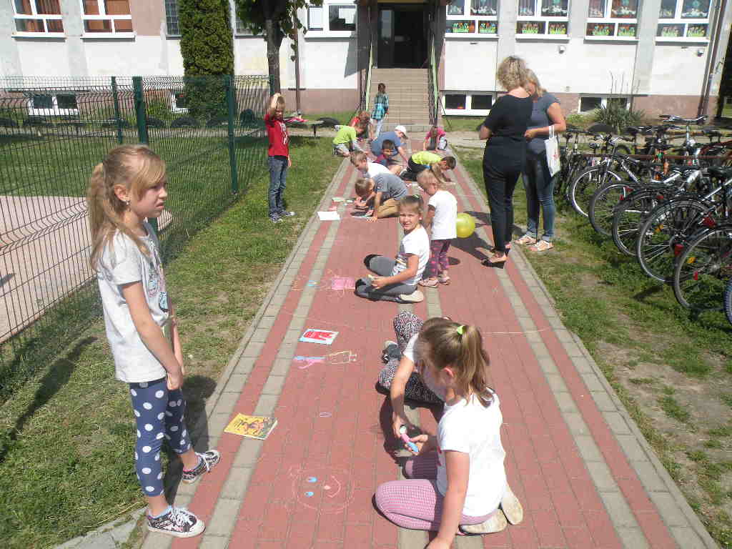 Klasy I, II, III SP – malowały kolorowymi kredami na chodniku bajkowe postacie.