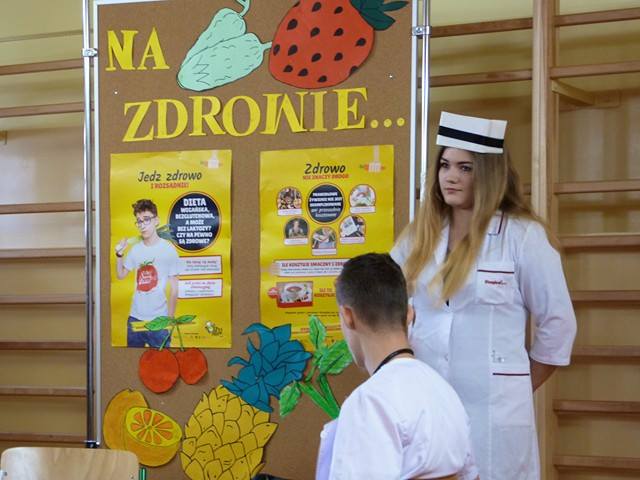 16 lutego br. klasa III gimnazjum pod opieką wychowawczyni przedstawiła uczniom naszej szkoły inscenizację dotycząca zdrowego odżywiania. Celem apelu była zmiana nawyków żywieniowych dzieci i młodzieży, poprzez zwiększenie udziału owoców i warzyw w ich codziennej diecie. Przedstawienie uświetniły wesołe piosenki i tańce. Dziewczęta zaprosiły wszystkich zebranych na degustacje ziołowych herbatek i zdrowych przekąsek, które same przygotowały. Mamy nadzieję, że wszyscy obecni wezmą sobie do serca usłyszane rady i wyrzucą ze swojego jadłospisu niezdrowe przekąski i zastąpią je owocami i warzywami