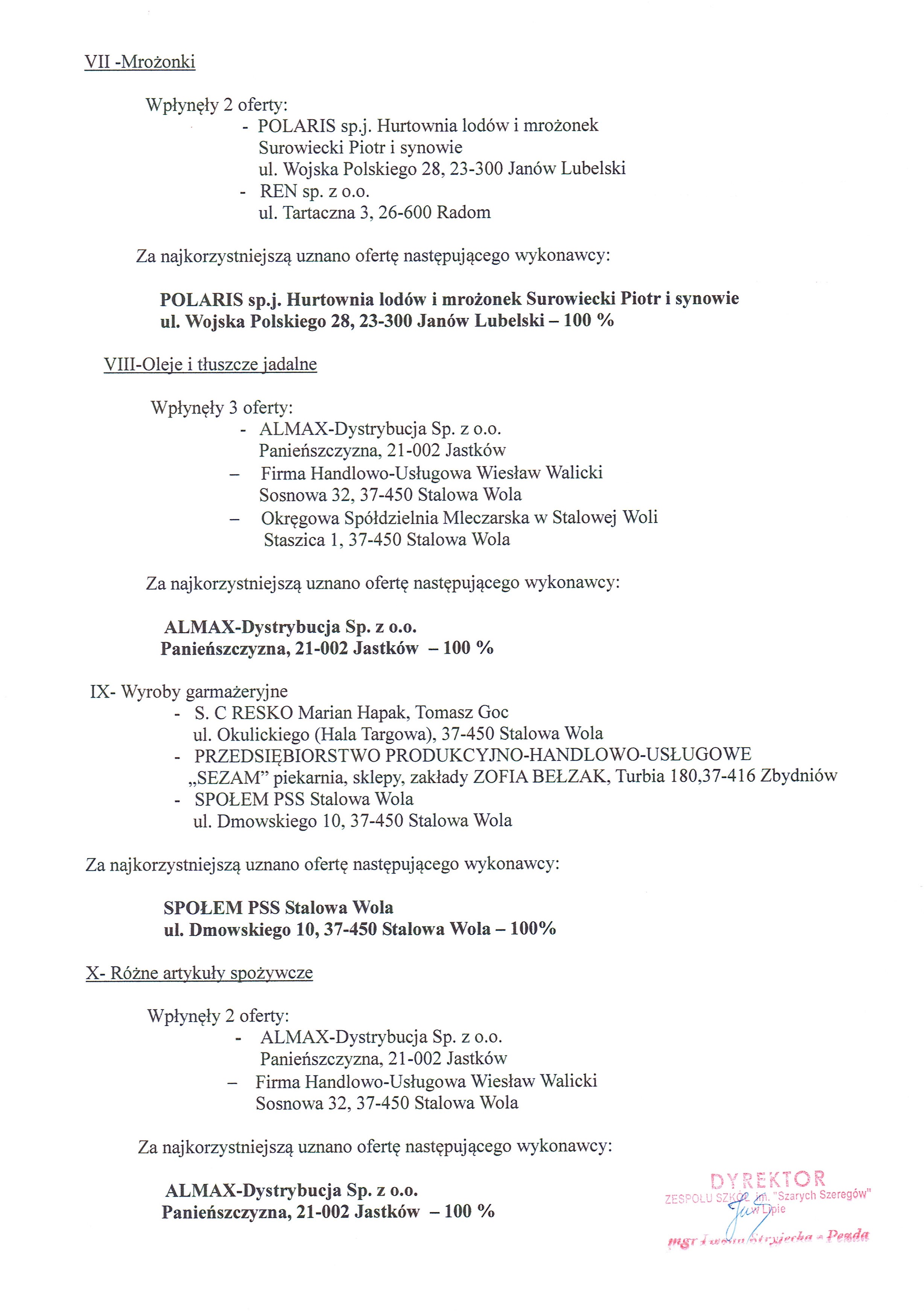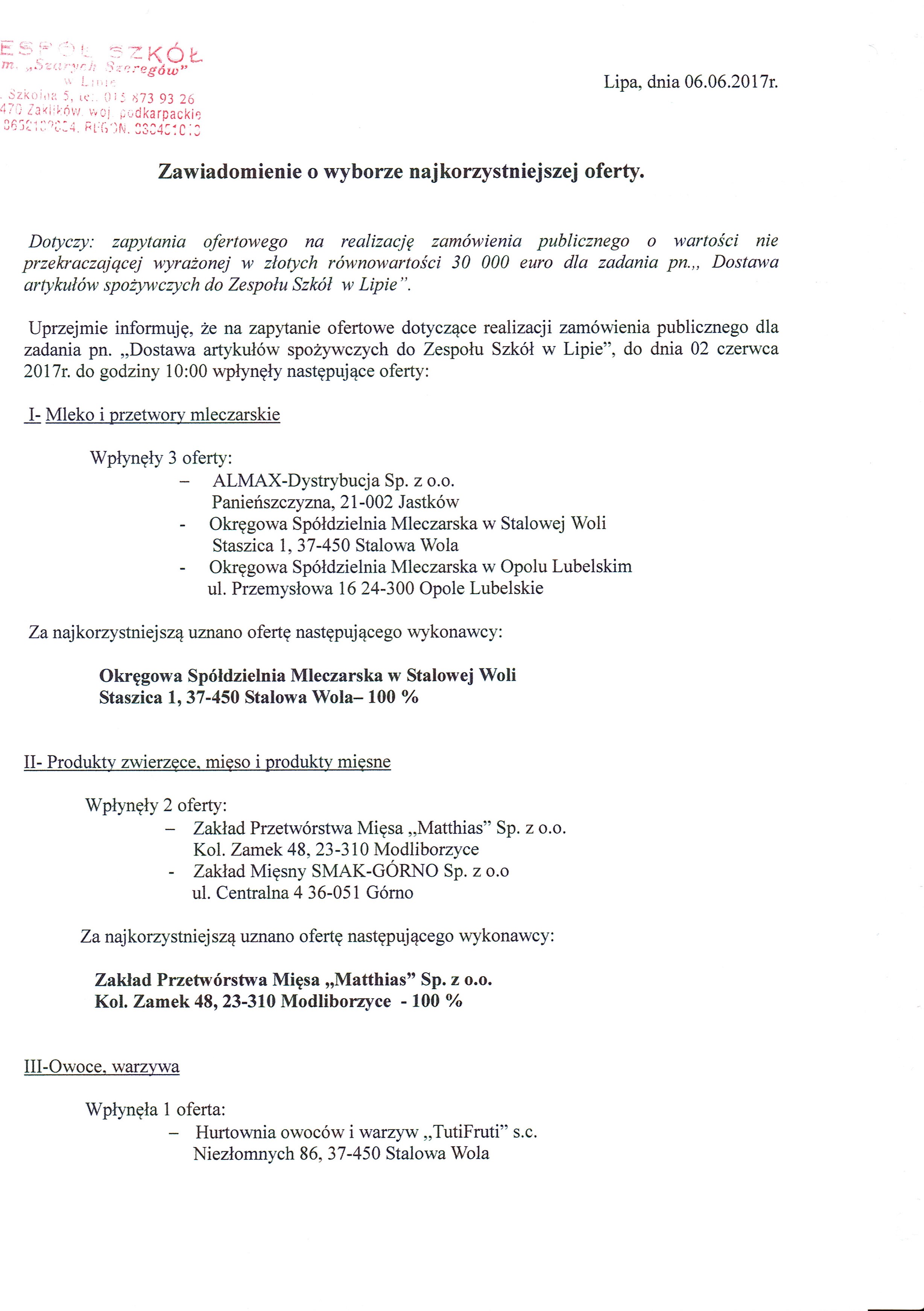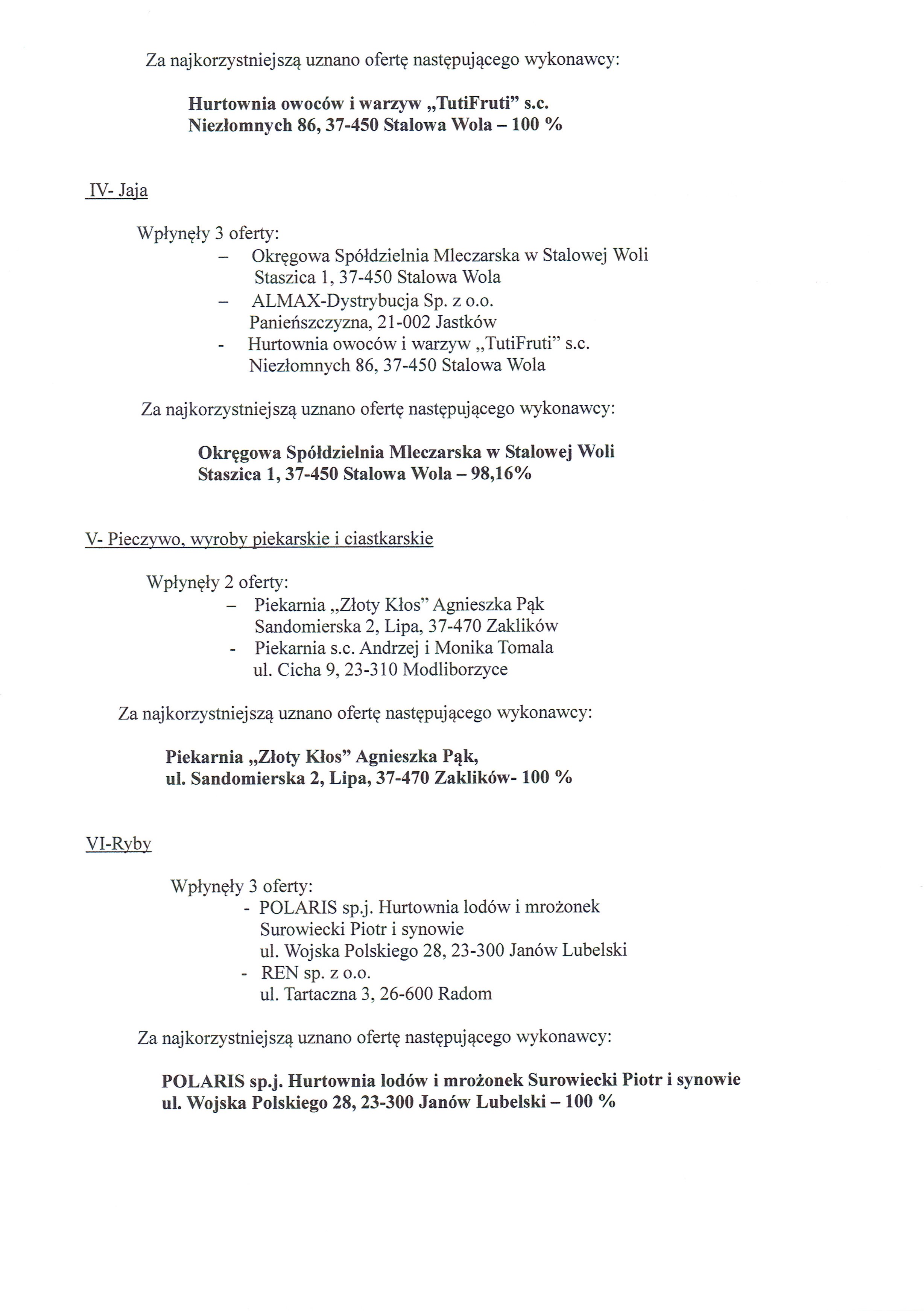 Zawiadomienie o wyborze najkorzystniejszej oferty na artykuły spożywcze