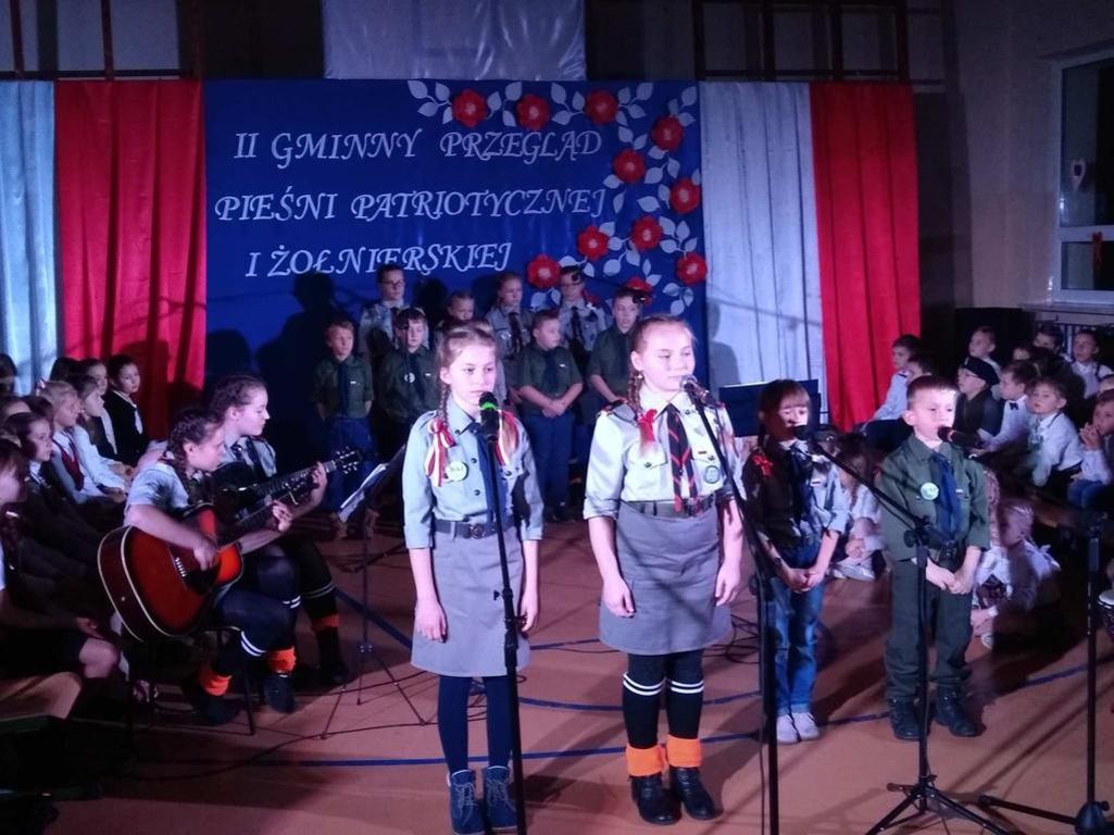 W dniu 18.12.2018 r. w Zespole Szkół w Zdziechowicach odbył się II Gminny Przegląd Pieśni Patriotycznej i Żołnierskiej. W imprezie wzięły udział zespoły i soliści z całej gminy. Byli to m.in.: uczniowie z klas 1 – 3 oraz 4 – 6 SP z ZSO w Zaklikowie, Zespół Wokalny z Zespołu Szkół w Zdziechowicach, Harcerska Grupa Muzyczna z 5 Szczepu Harcerskiego „Brzask” w Zaklikowie. Ze swoim programem muzycznym wystąpili także harcerze z 66 Wielopoziomowej Drużyny Harcerskiej "Ogniki” z Lipy oraz Zespół Wokalny „Nutki”. Zespół zaprezentował dwie pieśni patriotyczne : „Zagrajcie nam dzisiaj wszystkie srebrne dzwony” - pieśń z repertuaru Stana Borysa, którą wraz z chórem wykonała Julia Rzepczyńska oraz pieśń „Uwierz Polsko” z repertuaru grupy Soul Sanok wykonaną przez uczennice : Martynę Chamerę oraz Zofię Pyć . Piękna, patriotyczna impreza zakończyła się wręczeniem pamiątkowych statuetek oraz wspólnym odśpiewaniem pieśni : „Legiony”.