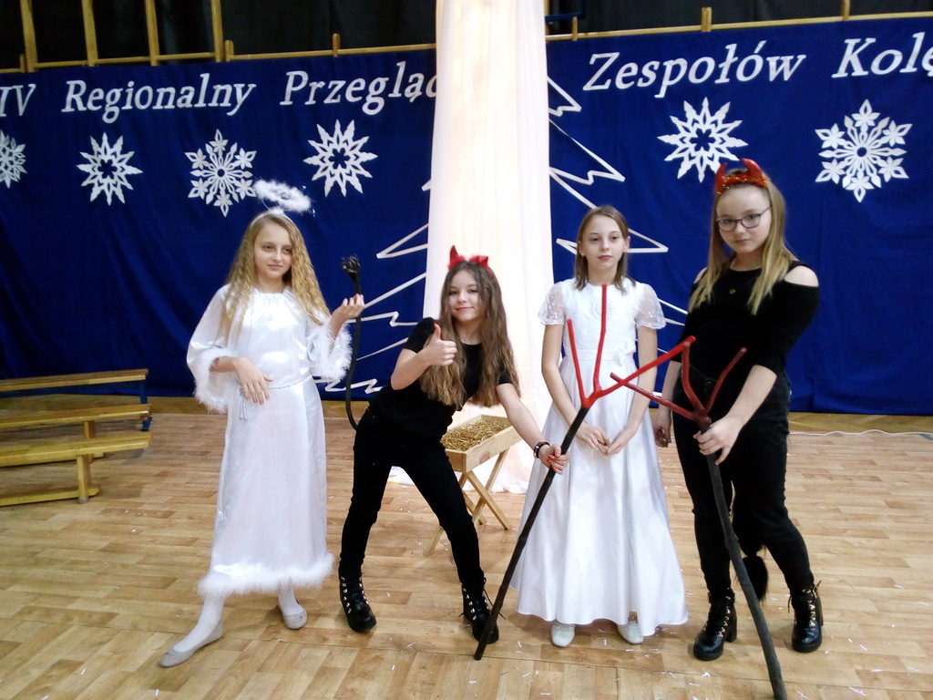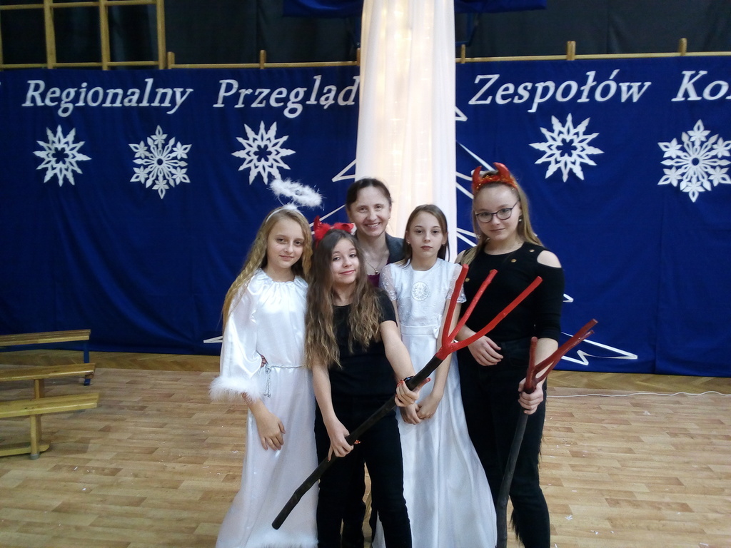 Dnia 12 stycznia 2020roku uczniowie kl. VI Szkoły Podstawowej w Lipie wzięli udział w IV Regionalnym Przeglądzie Zespołów Kolędniczych w Zaklikowie. Do pielęgnowania tradycji przyczyniły się również zespoły ze Zdziechowic, Zaklikowa i Stalowej Woli. Młodzi artyści z wielkim zaangażowaniem zaprezentowali swe umiejętności aktorskie w przedstawieniu pod nazwą „Hej, kolęda, kolęda”. Odważnie jako pierwszy wszedł na scenę Jakub S., niosąc gwiazdę. Jego sposób mówienia wzbudzał respekt. Towarzyszyły mu anioły - Martyna P., Kacper S. i Weronika D. Zapowiedziały nadejście Syna Bożego i złożyły zebranym życzenia. Tuż przy nich znalazł się Michał D.- świetnie wcielił się w rolę Żyda. Wielkie brawa należą się Jakubowi H. i Alicji Z. za oryginalne wykreowanie postaci Heroda i śmierci. Nie można też zapomnieć o kolejnych adeptach sztuki teatralnej- Amelii S. i Amelii T.- zagrały postacie diabłów i dopilnowały, by Herod nie uniknął kary. Każdy z młodych aktorów starał się przezwyciężyć tremę i przedstawić swoją postać jak najciekawiej. Wszyscy zasługują na uznanie. Życzę im sukcesów na teatralnej niwie i dużo, dużo odwagi. Wszystkim uczestnikom, ich rodzicom i organizatorom przeglądu należą się podziękowania za wkład pracy w przygotowanie tego niezwykłego wydarzenia związanego z upowszechnianiem i kultywowaniem bożonarodzeniowych tradycji.