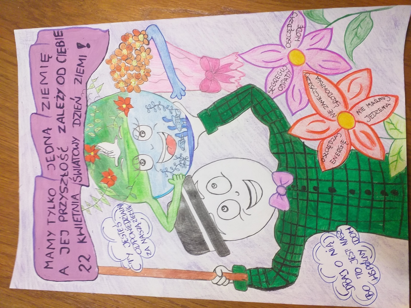 22 kwietnia obchodziliśmy Światowy Dzień Ziemi, którego celem było zwrócenie uwagi na kwestie ochrony środowiska naturalnego, w tym promowanie zachowań proekologicznych. Hasłem przewodnim tegorocznej edycji święta było „Przywróć Nasza Ziemię". W związku z tym w naszej szkole zorganizowano konkurs plastyczny dla uczniów klas IV-VIII, który polegał na wykonaniu plakatu z własnym hasłem ekologicznym, wkomponowanym w pracę, nawiązujący do obchodów Dnia Ziemi. Oto wyniki: