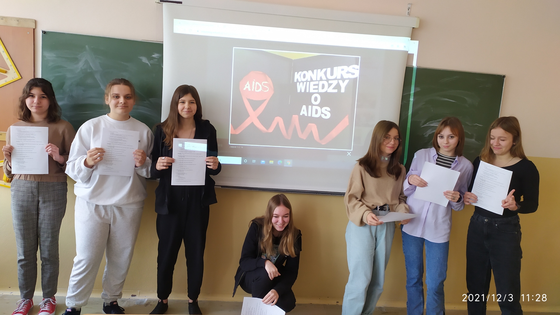 W ramach obchodów Światowego Dnia Walki z HIV/AIDS w naszej szkole odbył się turniej wiedzy o HIV/AIDS, w którym zmierzyli się uczniowie z klas siódmych i ósmych. Uczniowie odpowiadali na pytania testowe. Należało wykazać się wiedzą o wirusie HIV i chorobie AIDS, o sposobach zarażenia się wirusem oraz jego skutkach dla organizmu ludzkiego. Spośród czternastu uczestników laureatami konkursu zostali: