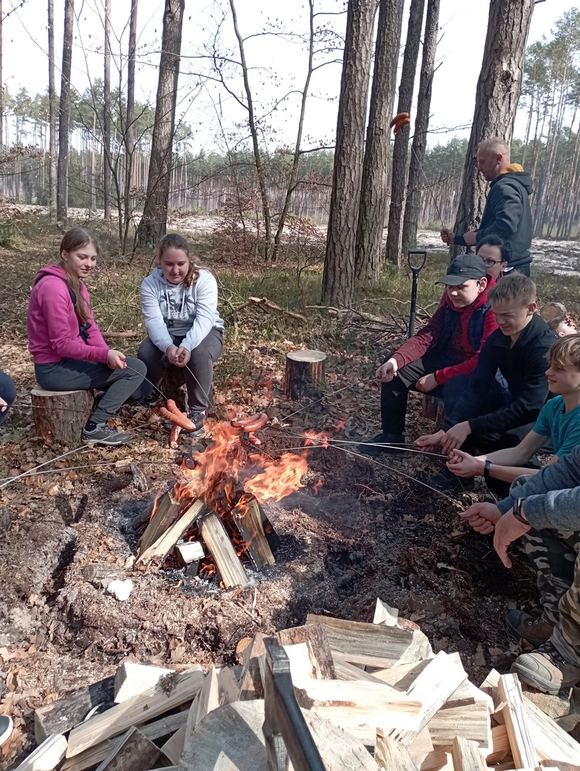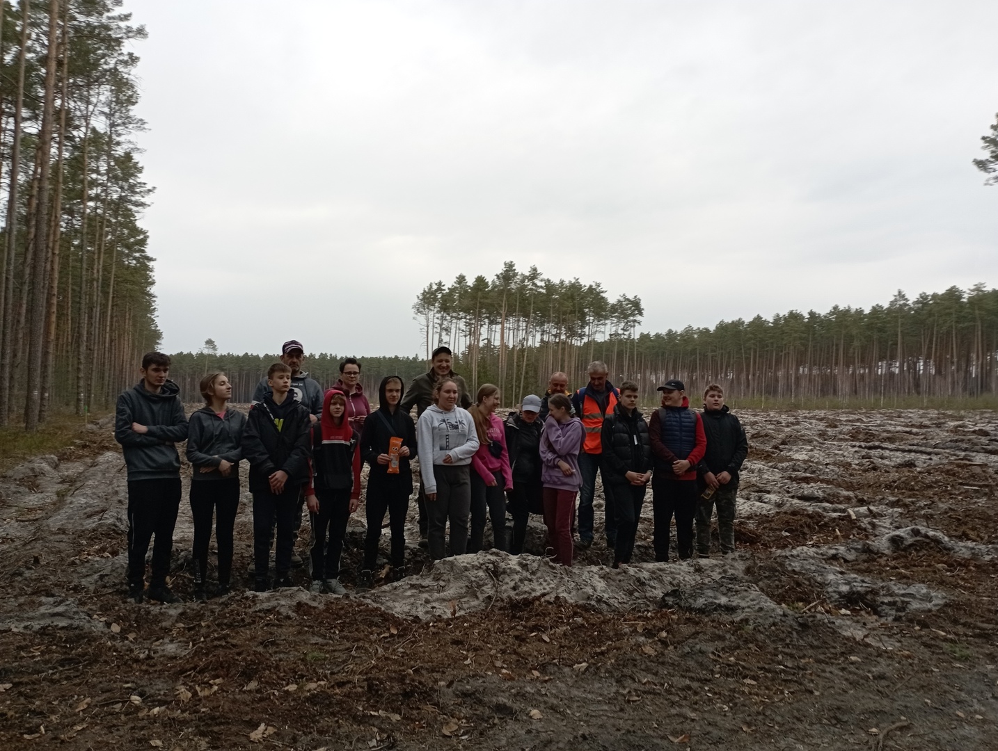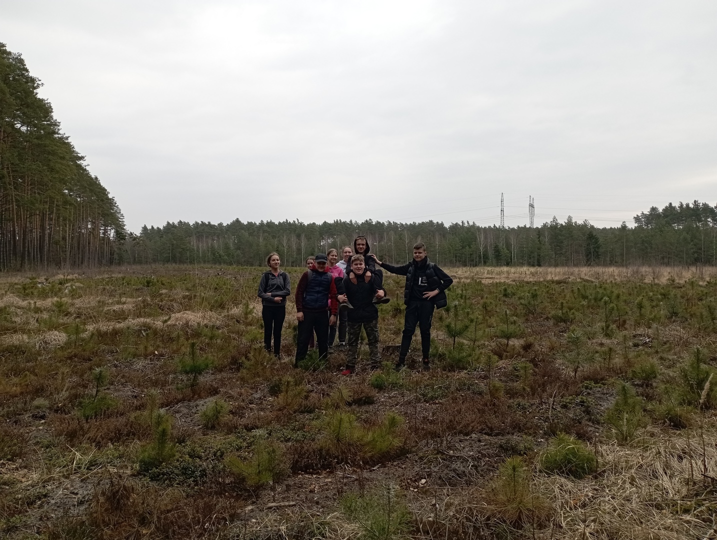 Wyruszyliśmy rowerami o godzinie 8:00. Trasę liczącą 6 kilometrów pokonaliśmy bez większych przeszkód i na wyznaczone miejsce dojechaliśmy po 30 minutach. Za zadanie mieliśmy obsadzenie sosną pospolitą terenu o powierzchni 4 hektarów. Najpierw leśniczy - p. Pomykała zademonstrował nam prawidłowy sposób sadzenia, a potem zajęliśmy miejsca znaczone pasami przeoranej ziemi i z werwą zaczęliśmy naszą pracę. Słoneczna i wietrzna pogoda sprawiła dodatkowo, że każdy z przyjemnością wypełniał to zadanie. I stosunkowo szybko, bo już o godz. 11.00 przyszedł czas na dłuższą przerwę. Pracownicy nadleśnictwa rozpalili ognisko, na którym upiekliśmy kiełbaski. Każdy ze smakiem skonsumował ten przysmak i po chwili odpoczynku wróciliśmy ponownie na stanowiska. Po dwóch godzinach - około 13.30 - dopadło nas zmęczenie, więc wspólnie podjęliśmy decyzję o powrocie. W sumie posadziliśmy ponad 10 tys. małych sosenek. Uważamy, że sporo. Przed odjazdem podziękowaliśmy panu leśniczemu za umożliwienie mam udziału w akcji oraz za otrzymane od niego gadżety. Następnie wsiedliśmy na rowery i wyruszyliśmy w drogę powrotną. W jej trakcie zatrzymaliśmy się w miejscu, gdzie pracowaliśmy przed trzema laty. Przyjemność sprawił nam widok niewielkich jeszcze okazów sosen, które posadziliśmy jako 11-latkowie. Pan leśniczy poinformował nas wcześniej, że niemal wszystkie drzewka się przyjęły. Po tej „wizytacji” wiedliśmy na swoje jednoślady i około godziny 14.00 zameldowaliśmy się w swoich domach.