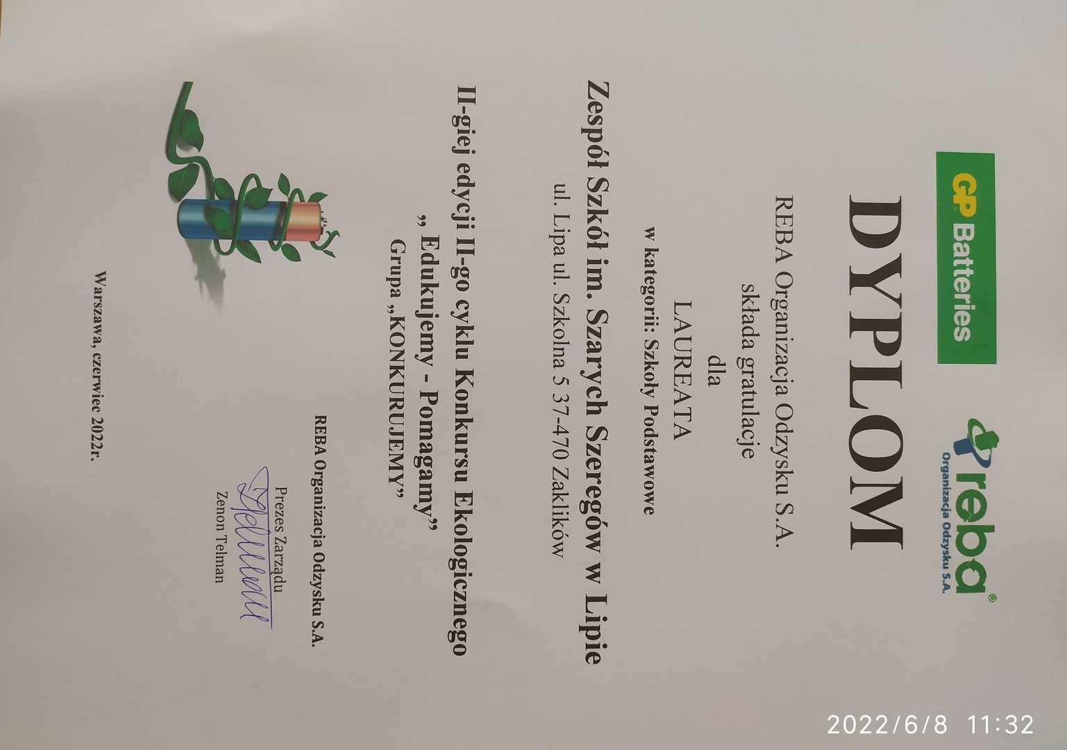 Nasza szkoła w bieżącym roku szkolnym 2021/2022 wzięła udział w II edycji II-go cyklu Konkursu Ekologicznego zbiórki zużytych baterii w placówkach oświatowych i wychowawczych na terytorium Polskipod hasłem „Edukujemy – Pomagamy”. Zbiórka była prowadzona przez firmę REBA S.A. w Warszawie.