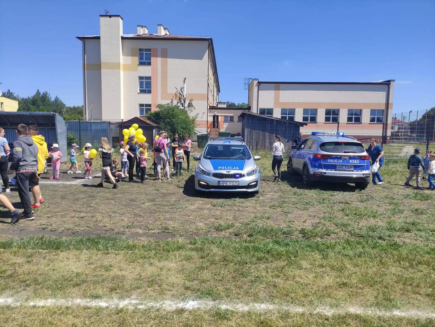 i policjantów w zabawach z najmłodszymi. „Gwoździem programu” okazał się taniec w wykonaniu przedstawicieli naszych służb i przedszkolaków, pod kierunkiem pań animatorek. Jedną z wielu atrakcji były dmuchane zjeżdżalnie, na których można było się bawić do woli oraz spektakularny pokaz Straży Pożarnej. Jako, że pogoda nam dopisywała a słońce mocno grzało, strażacy postanowili nas ochłodzić wodą, polewając co odważniejszych. Nie zabrakło również słodkiego poczęstunku oraz kiełbasek z grilla, którymi wszyscy się z apetytem zajadali. Równolegle z zabawami odbywały się liczne konkursy grupowe