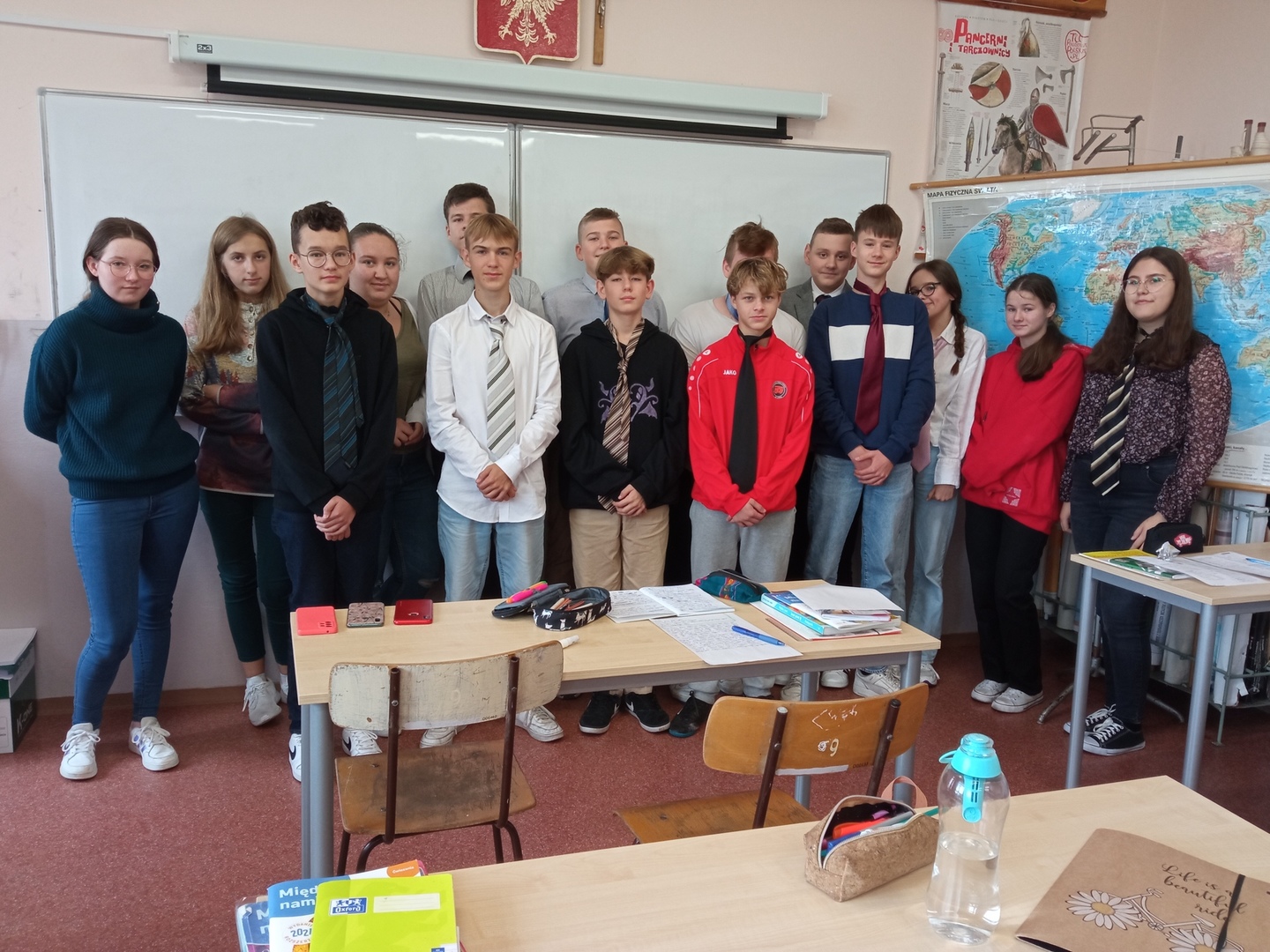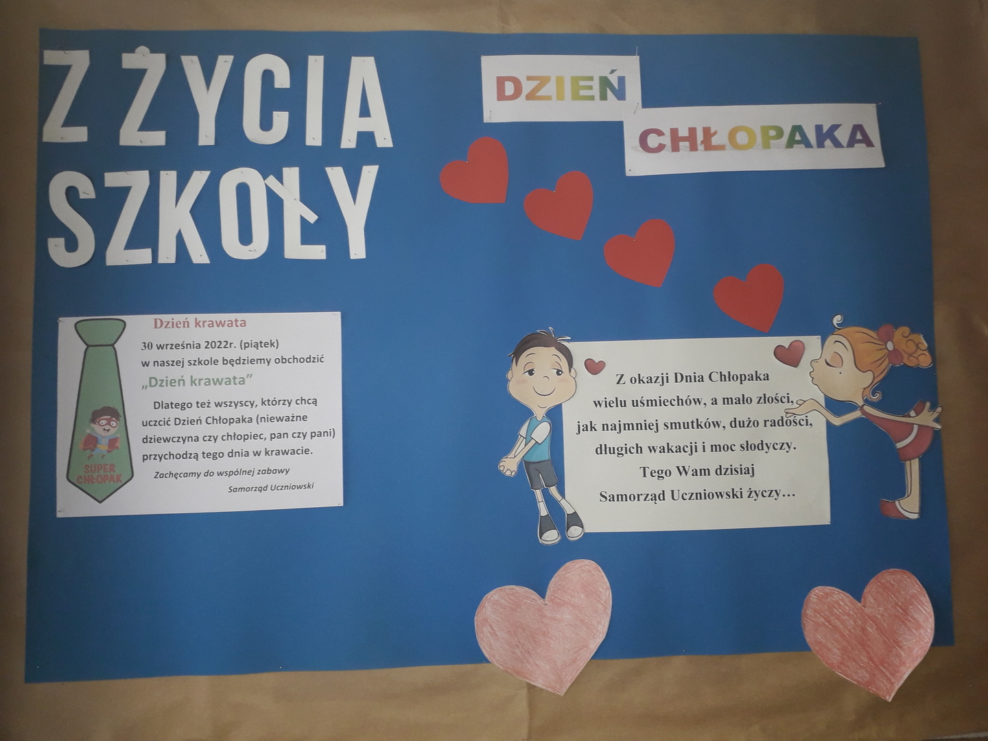 30 września w naszej szkole obchodziliśmy Dzień Chłopaka. Z tej okazji Samorząd Uczniowski zorganizował święto pod hasłem „Dzień krawata”. Wszyscy uczniowie i pracownicy szkoły, w tym dniu założyli krawaty. Dziewczynki z każdej klasy przygotowały niespodzianki dla swoich kolegów, oprócz tradycyjnych życzeń wręczyły im także prezenty. Większość dziewcząt wpadła na ten sam pomysł i obdarowała swoich „super chłopaków” ciepłymi skarpetkami. Prezent praktyczny, ale bardzo miły w o obliczu zbliżającej się zimy. W prezencie znalazł się także słodki podarunek. Ten dzień minął nam w miłej i sympatycznej atmosferze.