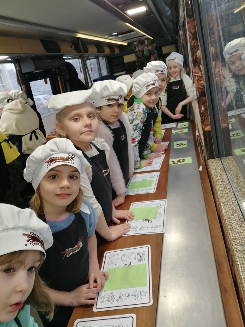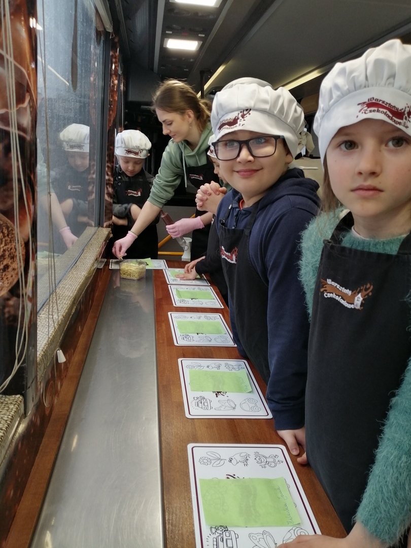 Dnia 03.04. 2023r na parkingu ZS w Lipie zaparkował Czekoladowy Autobus. Uczniowie klasy I odwiedzili ten niezwykły pojazd i brali udział w warsztatach. Dzieci zapoznały się z historią tworzenia smakołyków z czekolady. Uczniowie mieli okazję obejrzeć i dotknąć owoc kakaowca i posmakować różne rodzaje czekolady . Przygotowani do pracy w fartuszkach i czepkach tworzyli i ozdabiali własne przysmaki czekoladowe , które po wystudzeni każde dziecko pakowało do wcześniej przygotowanego ekologicznego opakowania. Na podsumowanie zajęć każdy z uczestników otrzymał dyplom ,, Mistrza Czekolady”. Dla wszystkich uczniów była to ciekawa i niecodzienna lekcja. Opiekun grupy – Beata Chmielewska.