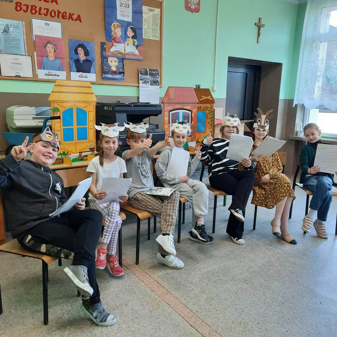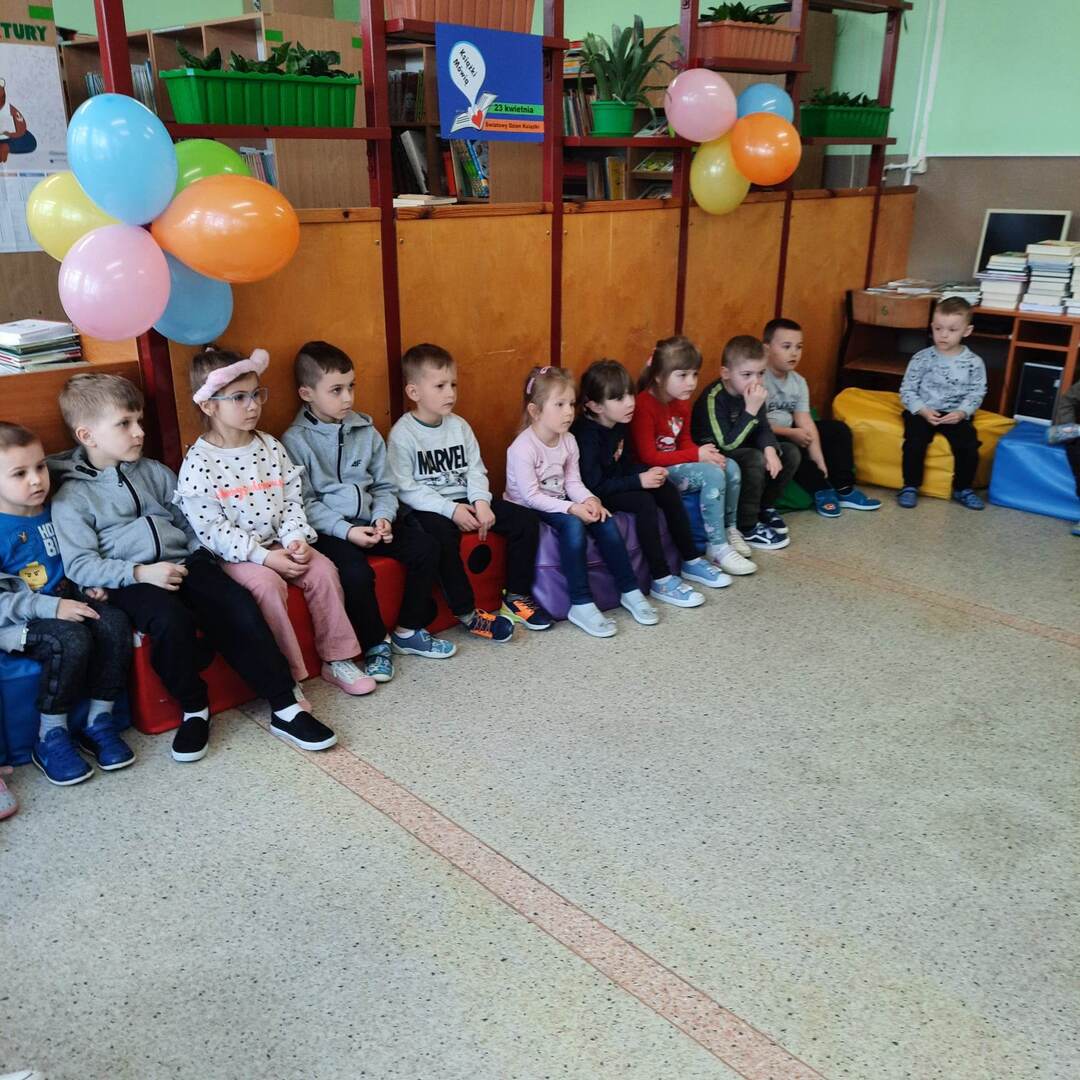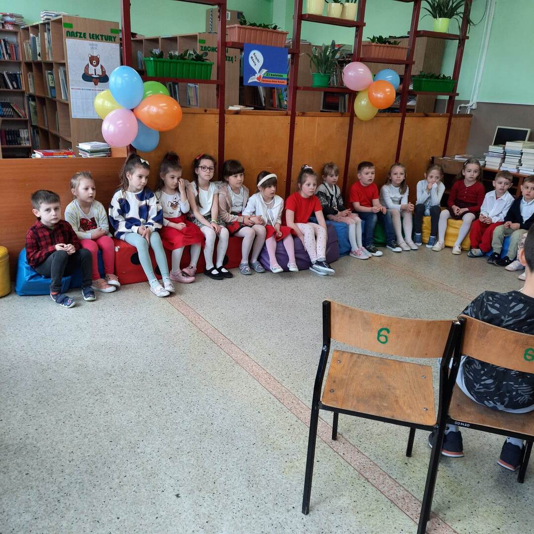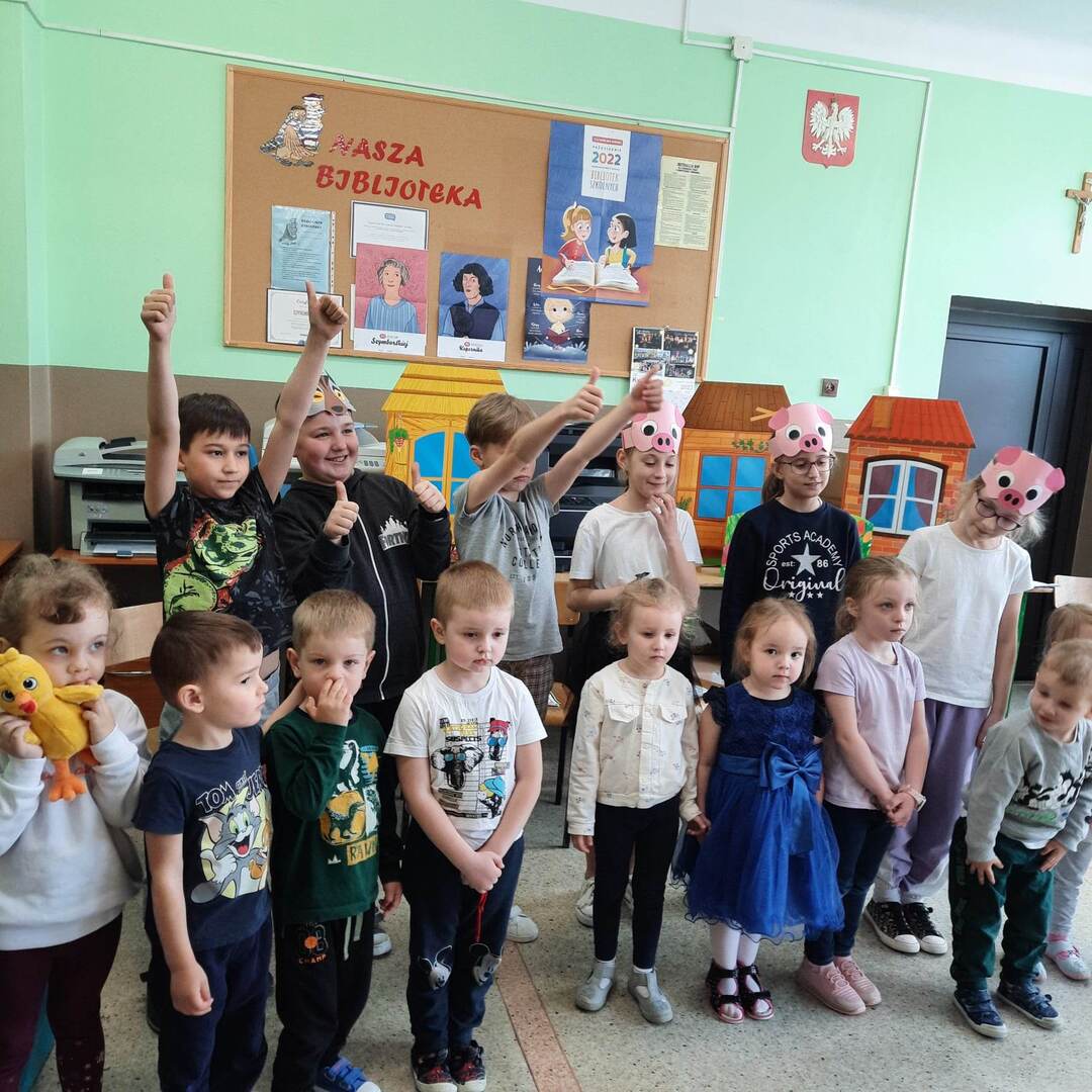Światowy Dzień Książki to coroczne międzynarodowe święto na cześć książek i czytelnictwa obchodzone 23 kwietnia. Z tej okazji uczniowie klasy 3 SP, przygotowali dla przedszkolaków i zerówki czytanie bajek z podziałem na role. Zaprezentowali dwie bajki – dla starszaków, bajkę „Zły wilk i siedem koźlątek”, dla Maluszków – „Trzy małe świnki”. Wizyta przedszkolaków w bibliotece i czytanie bajek przez starszych kolegów okazały się miłym zaskoczeniem i zadowoleniem wśród uczestników. Uczniowie doskonale wczuli się w role bohaterów bajek – czytali płynnie, starając się modelować głosy w trakcie odgrywania ról przypisanych im postaci oraz akcentować smutne i wesołe momenty bajki. Dzieci słuchały z wielkim zainteresowaniem, chętnie odpowiadały na pytania związane z treścią wysłuchanych bajek. Na zakończenie wizyty obiecały wykonać rysunki, przedstawiające poznanych bohaterów bajek, które zostaną zaprezentowane na wystawie w bibliotece.