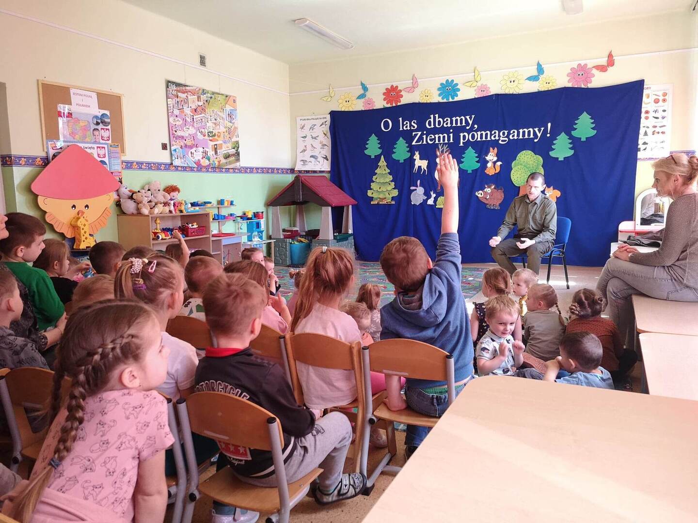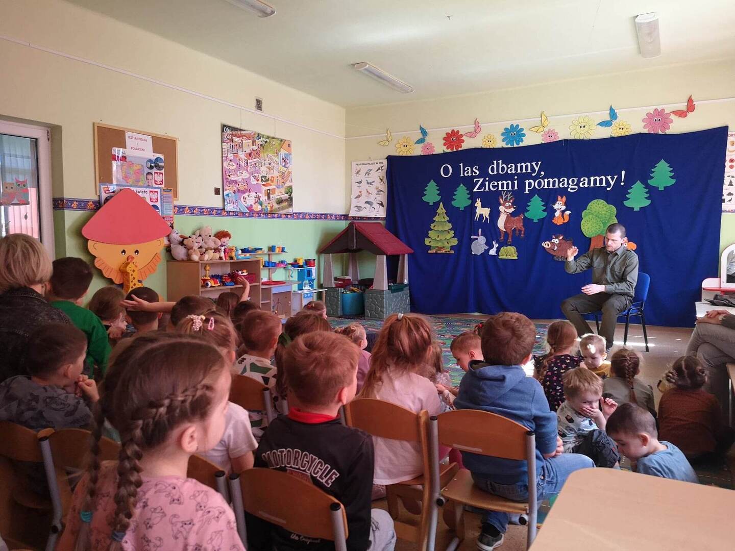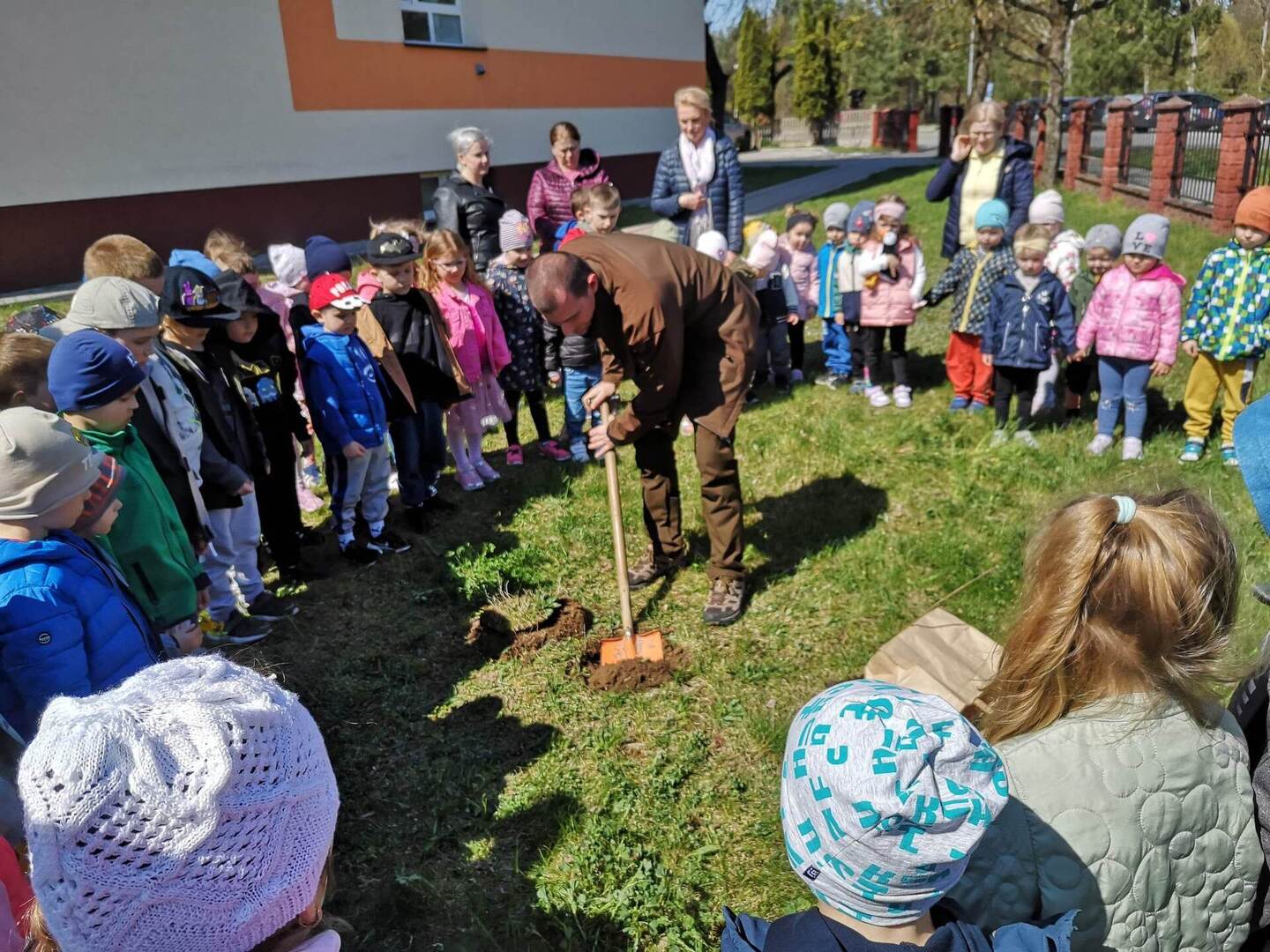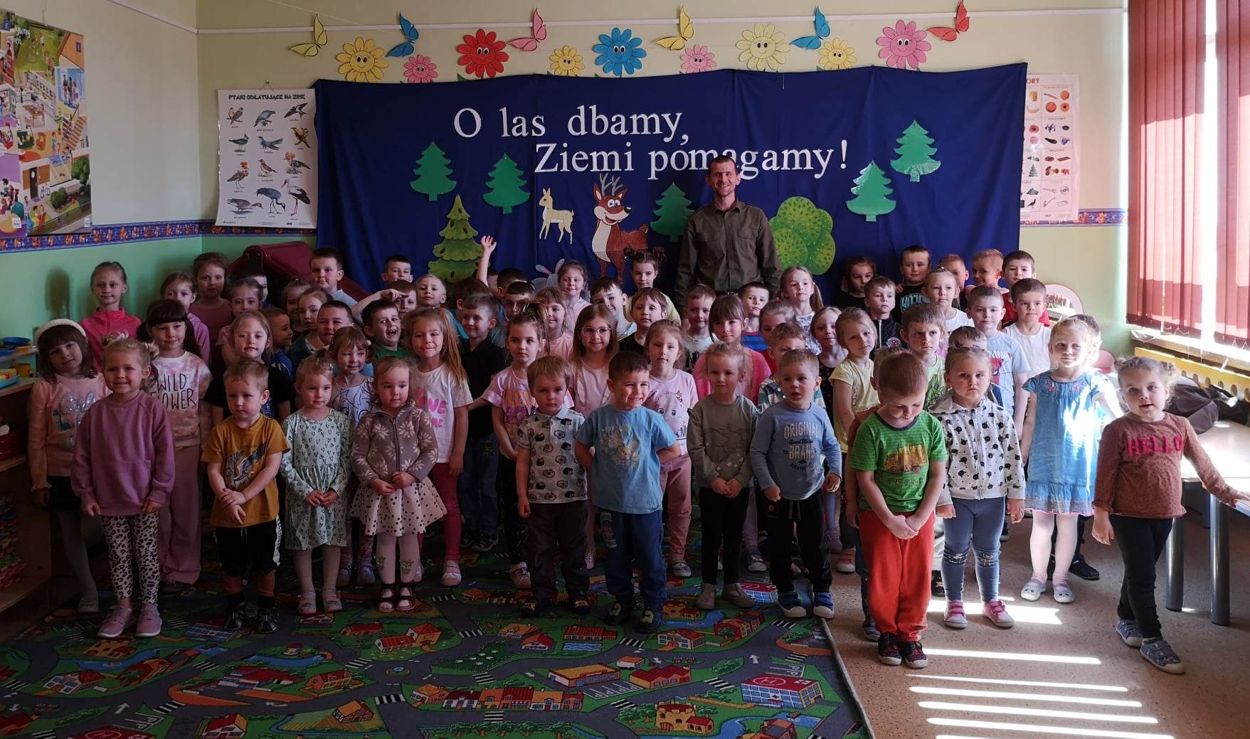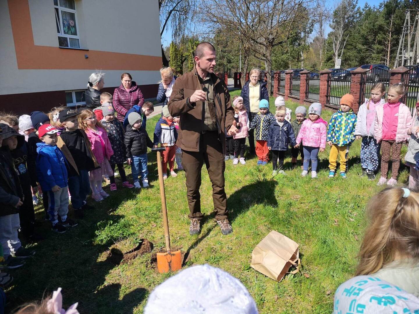 W miesiącach luty, marzec i kwiecień w naszym przedszkolu odbywał się Projekt Ekologiczny „Zabawy z ekologią” którego celem było zbliżenie dziecka do świata przyrody i poprzez poznawanie go dostrzegania jego piękna, nabywanie opiekuńczego stosunku do świata roślin i zwierząt, kształtowanie mądrego i umiejętnego współżycia człowieka z przyrodą, rozwijanie poczucia troski i odpowiedzialności o obecną i przyszłą jakość życia na Ziemi. Na zakończenie projektu, dnia 21 kwietnia 2023 roku odwiedził nas Pan podleśniczy Paweł Kwaśnik,który z wielkim zaangażowaniem przybliżył przedszkolakom zakres swojej pracy oraz ciekawie odpowiedział na wiele zadawanych przez dzieci pytań. Zwieńczeniem spotkania było wspólne posadzenie drzewka na placu szkolnym. Justyna Sienicka