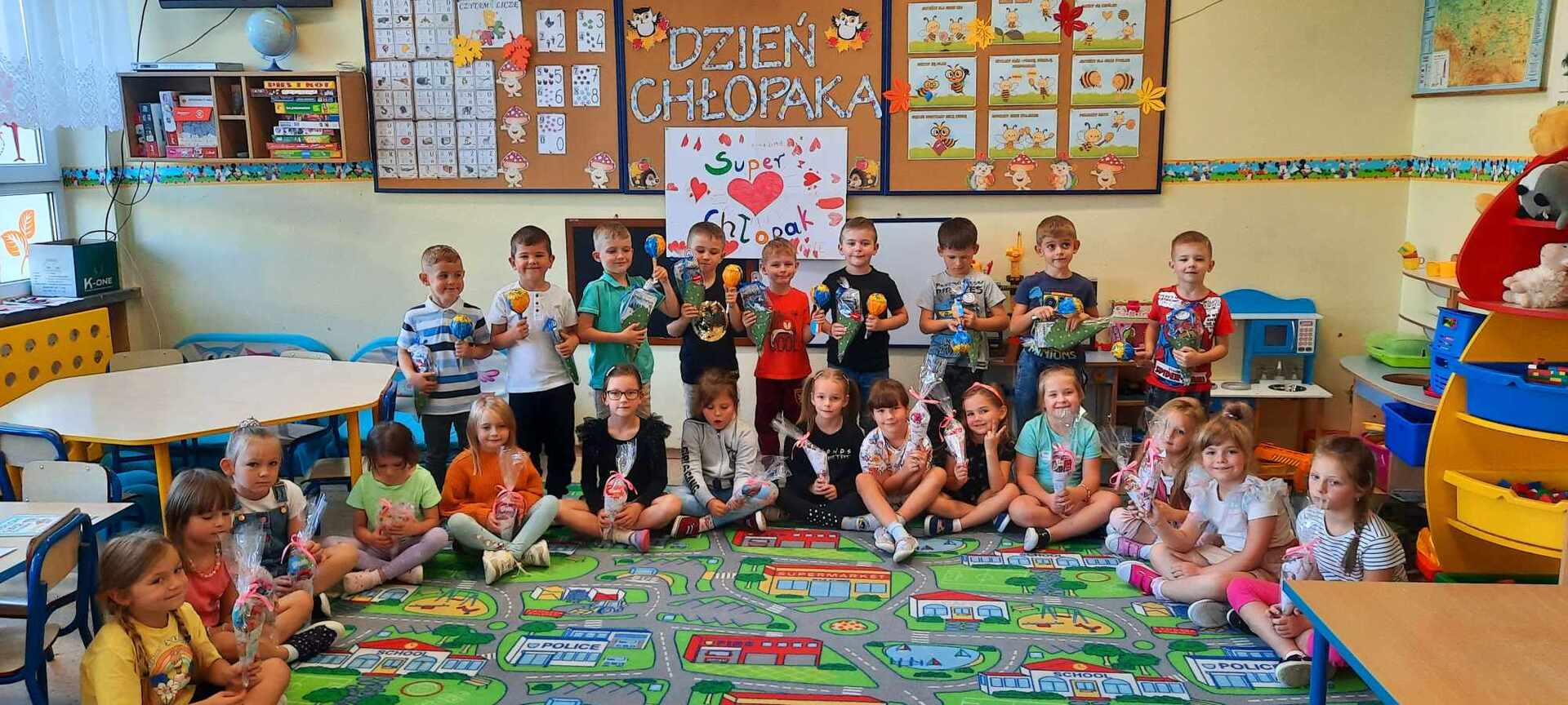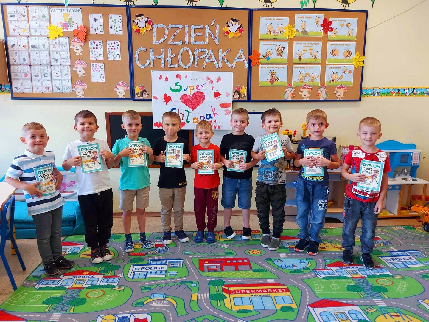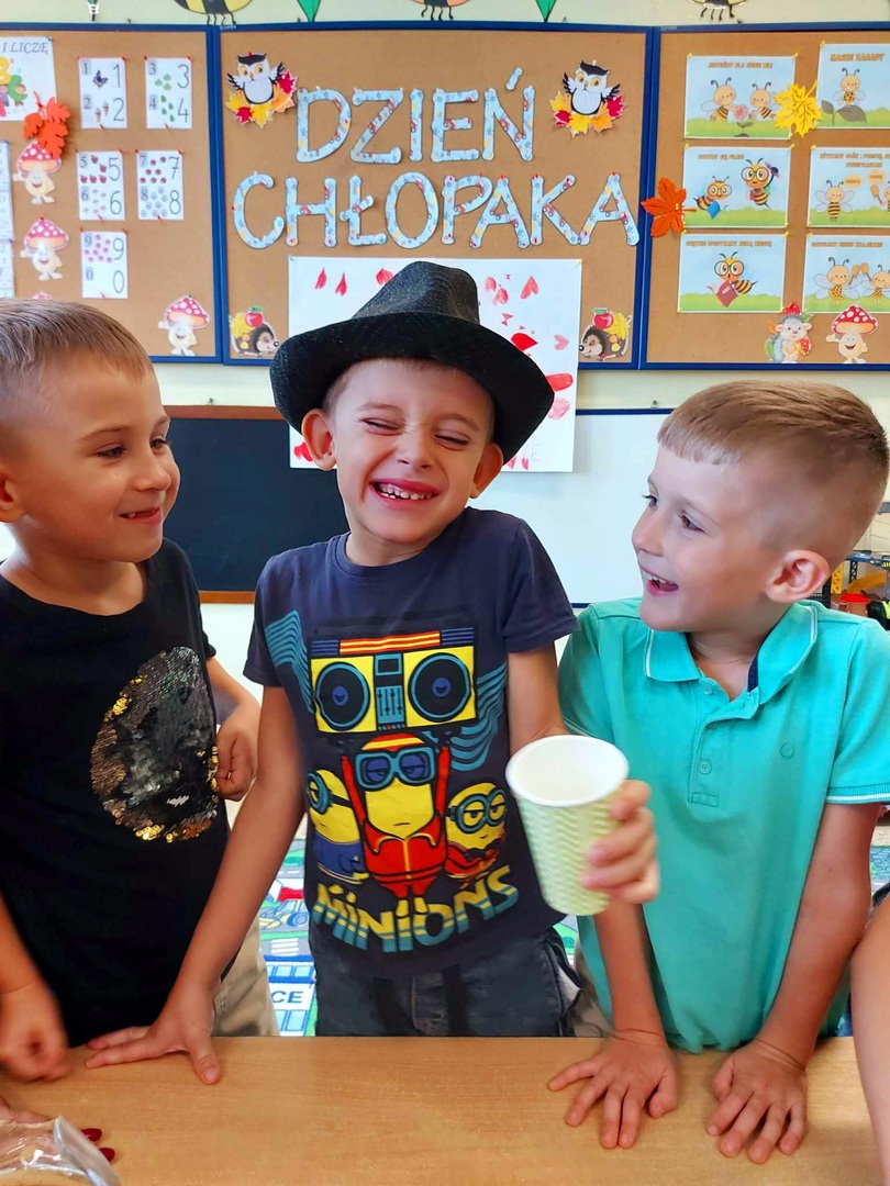 Dzień Chłopaka w naszym przedszkolu jest dniem miłych niespodzianek,radości i uśmiechów.Święto to jest okazją do wyrażenia pozytywnych emocji,chłopców i dziewczynek, pozwala budować atmosferę życzliwości i czerpać radość ze wspólnie spędzonego czasu. Tego dnia niespodziankę dla wszystkich chłopaków przygotowały dziewczynki –stworzyły plakat Super Chłopaka,i złożyły swoim kolegom najserdeczniejsze życzenia. Chłopcy zamienili się w tym dniu w prawdziwych Dżentelmenów , mieli za zadanie wypić magiczny eliksir mocy-mocno cytrynowy i się uśmiechnąć.Było wesoło i śmiesznie.Zgodnie z tradycją na zakończenie zajęć chłopcy otrzymali od koleżanek fajne upominki.