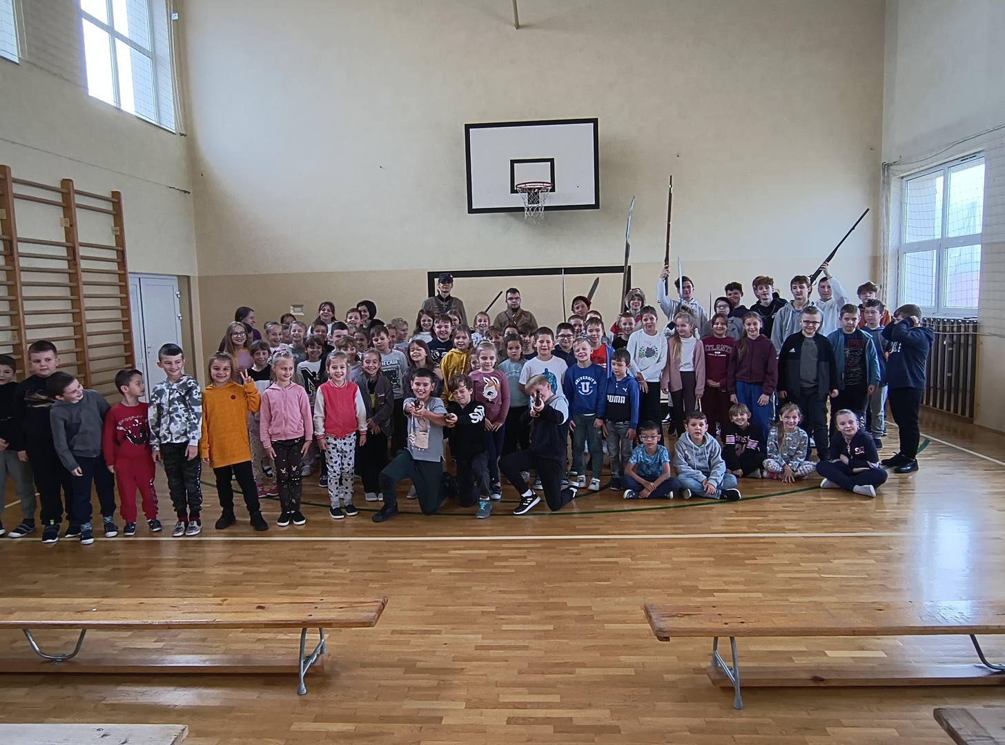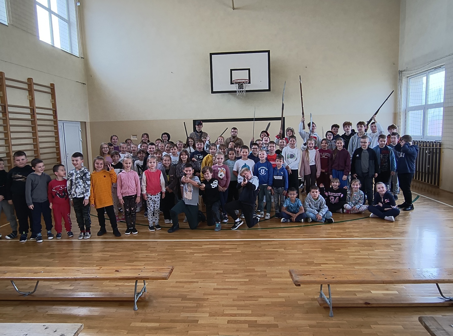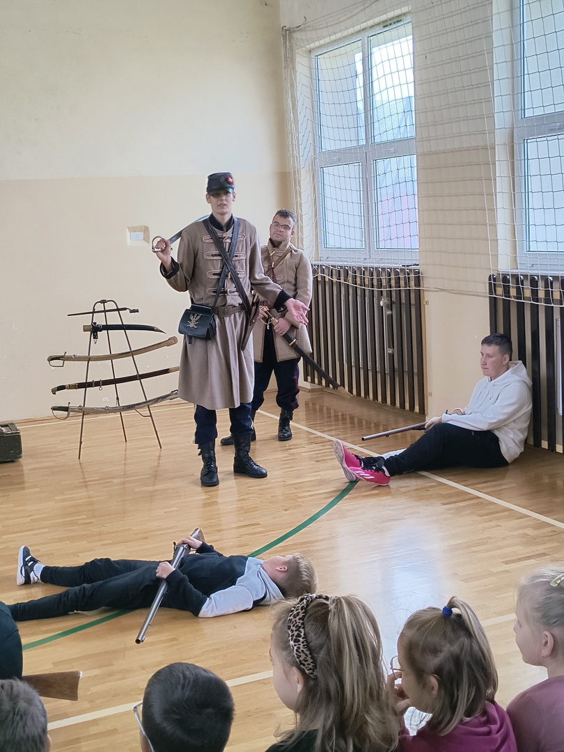 W dniu 17.10.2023r. w naszej szkole zagościła grupa „ Rekonstrukto- historia eksperymentalna”. Uczniowie klas I- VIII mieli okazję przenieść się w czasie do okresu Powstania Styczniowego (1863-1864). We wstępie prowadzący nakreślili sytuację historyczną. Wśród udostępnionych rekwizytów można było obejrzeć i dotknąć zarówno stroje, jak i broń. Chętni uczniowie wcielili się w żołnierzy, chłopów i sanitariuszy. Pokaz cieszył się dużym zainteresowaniem, a pytania zadawane przez prowadzących spotykały się z zaskakująco prawidłowymi odpowiedziami.