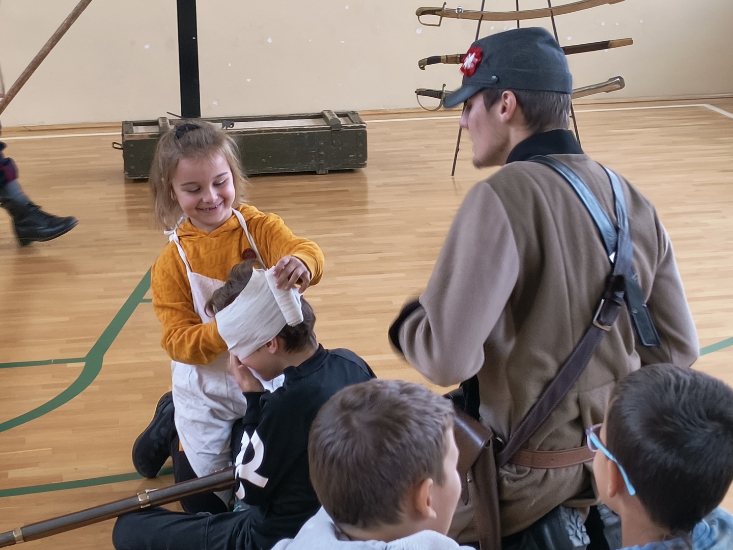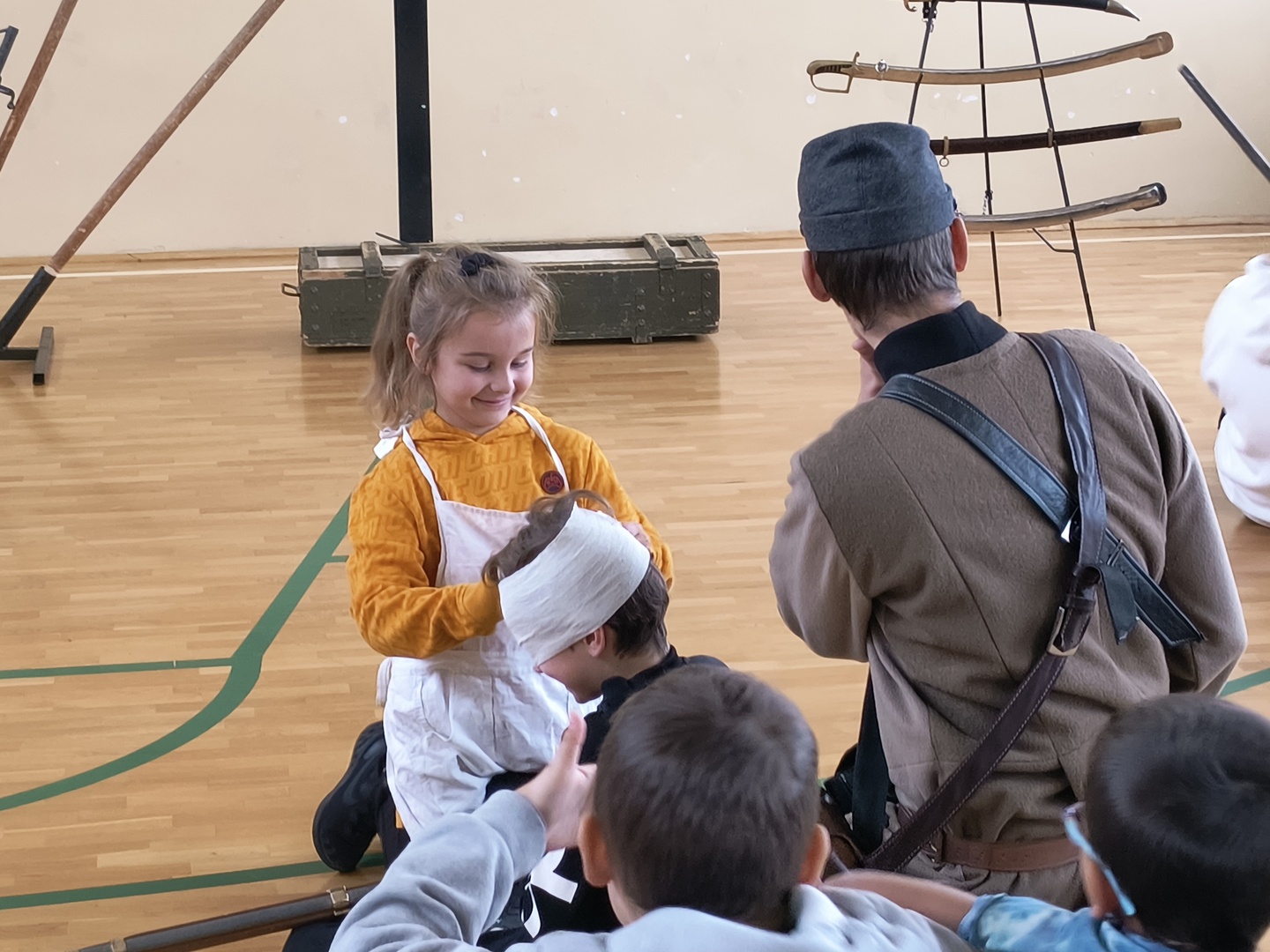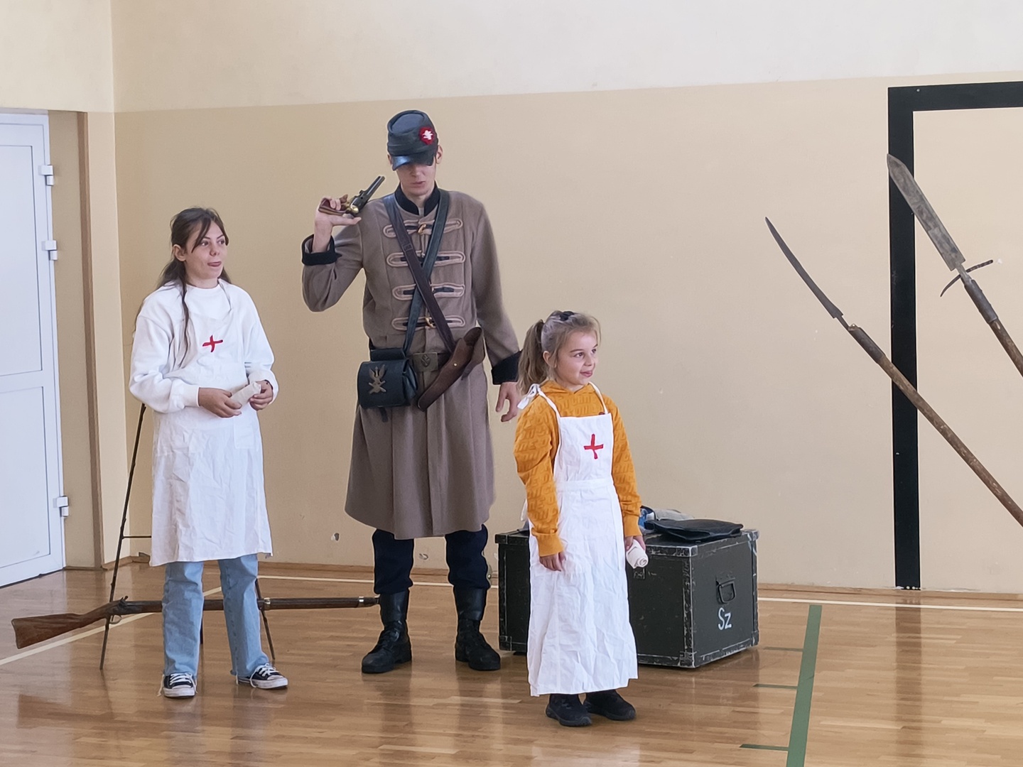 W dniu 17.10.2023r. w naszej szkole zagościła grupa „ Rekonstrukto- historia eksperymentalna”. Uczniowie klas I- VIII mieli okazję przenieść się w czasie do okresu Powstania Styczniowego (1863-1864). We wstępie prowadzący nakreślili sytuację historyczną. Wśród udostępnionych rekwizytów można było obejrzeć i dotknąć zarówno stroje, jak i broń. Chętni uczniowie wcielili się w żołnierzy, chłopów i sanitariuszy. Pokaz cieszył się dużym zainteresowaniem, a pytania zadawane przez prowadzących spotykały się z zaskakująco prawidłowymi odpowiedziami.