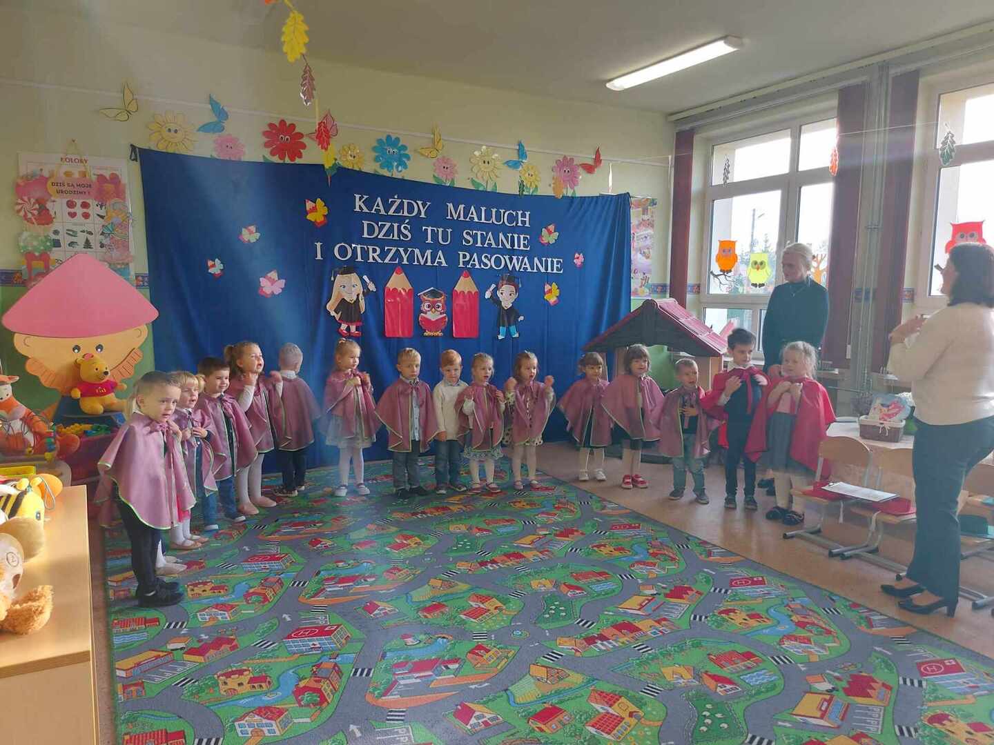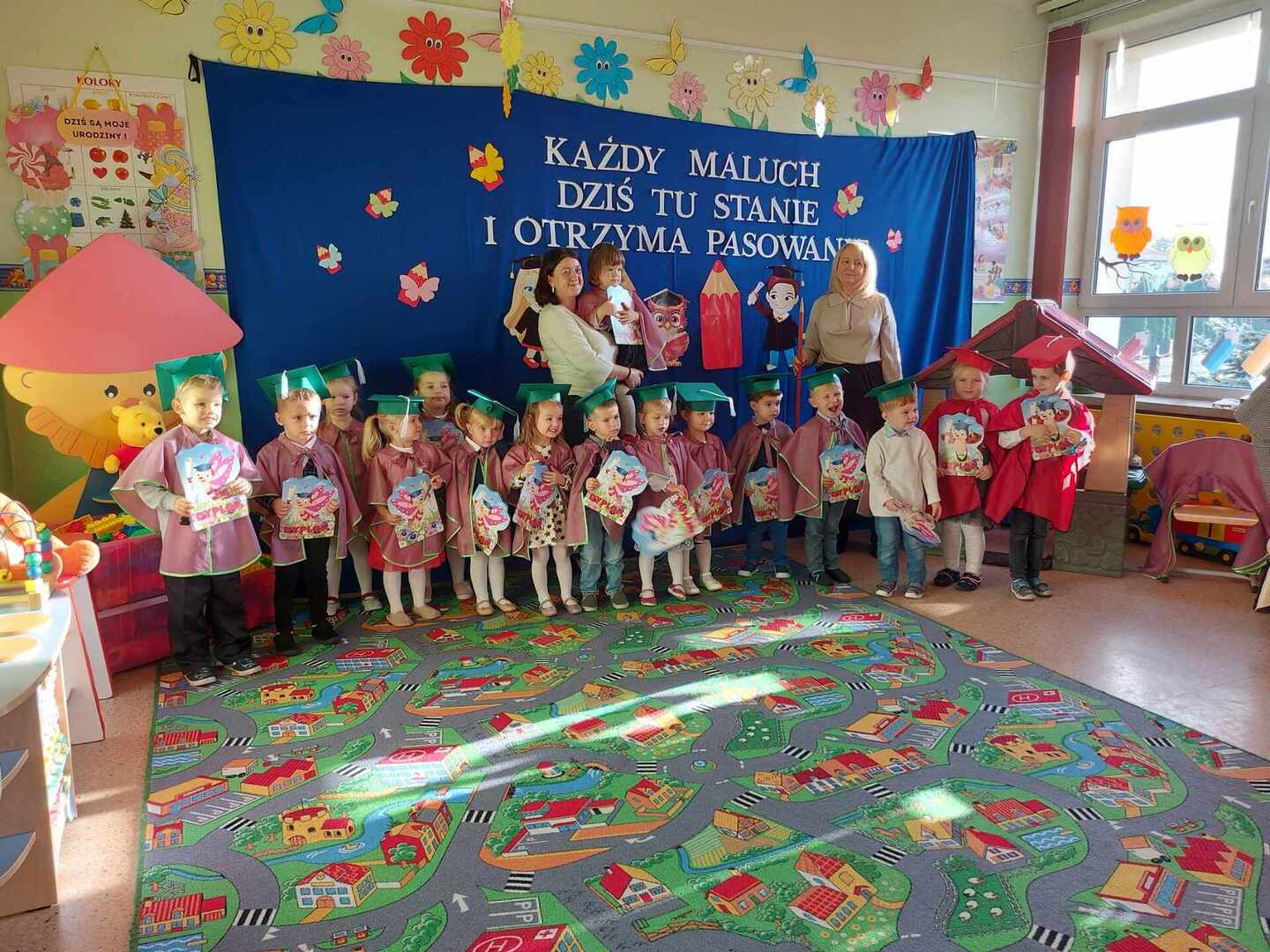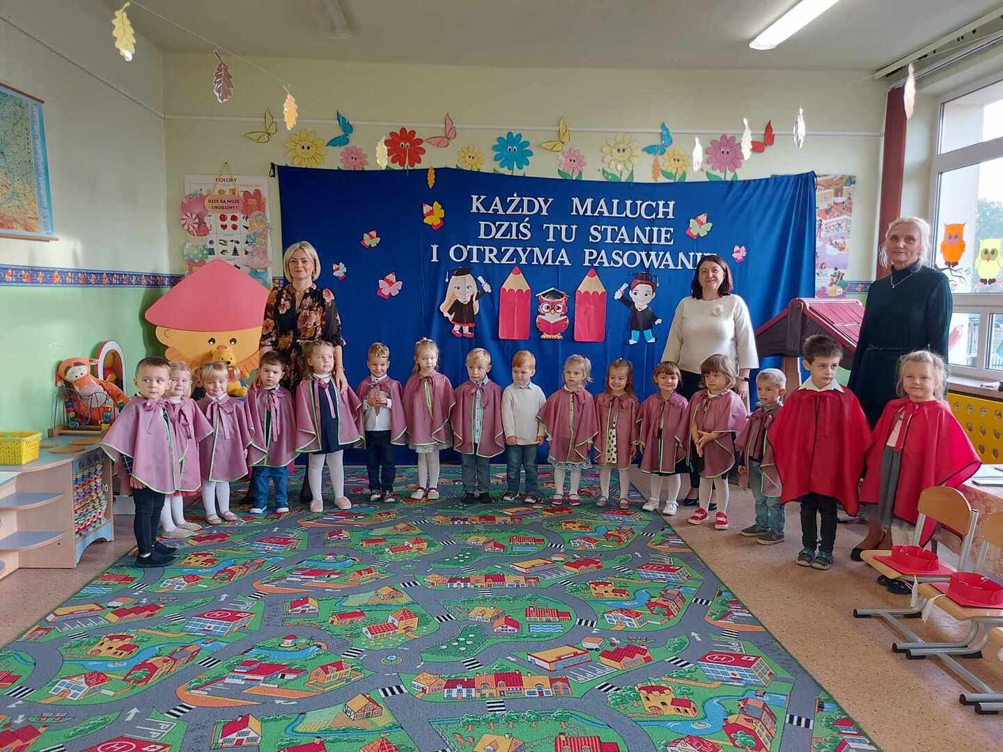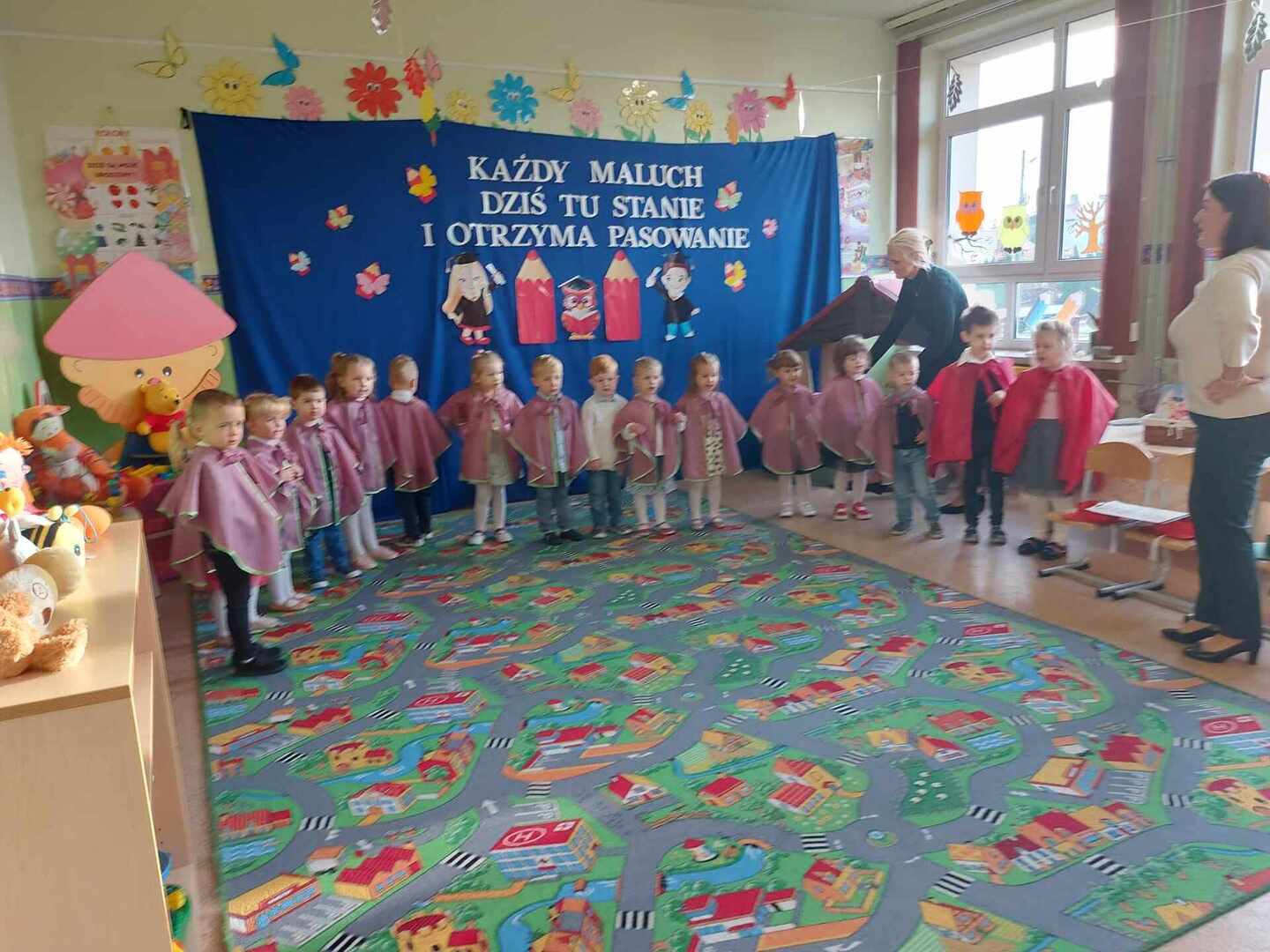 24 października 2023r w naszym przedszkolu odbyła się uroczystość PASOWANIA na przedszkolaka. To pierwsza tak ważna uroczystość dla Motylków. Od tego dnia stały się oficjalnie przedszkolakami. Uroczystość rozpoczęła się od powitania gości i przedstawienia krótkiej części artystycznej, w której maluszki zaprezentowały swoje umiejętności – dając tym samym dowód, jak dużo już potrafią. Po części artystycznej, dzieci obiecały: zgodnie bawić się w przedszkolu, przychodzić każdego dnia z uśmiechem, słuchać pani i pomagać kolegom, być dzielnym przedszkolakiem. Po złożonej obietnicy, Pani wicedyrektor dokonała uroczystego pasowania każdego dziecka na przedszkolaka, poprzez dotknięcie ramienia wielką kredką. Dla przedszkolaków było to wielkie przeżycie, a dla rodziców powód do dumy i zadowolenia ze swoich pociech. Na pamiątkę tego ważnego wydarzenia każdy przedszkolak otrzymał dyplom pasowania oraz drobny upominek. Wszystkim dzieciom życzymy wielu sukcesów, nowych przyjaźni i dużo uśmiechu na co dzień! Zofia Cieślak