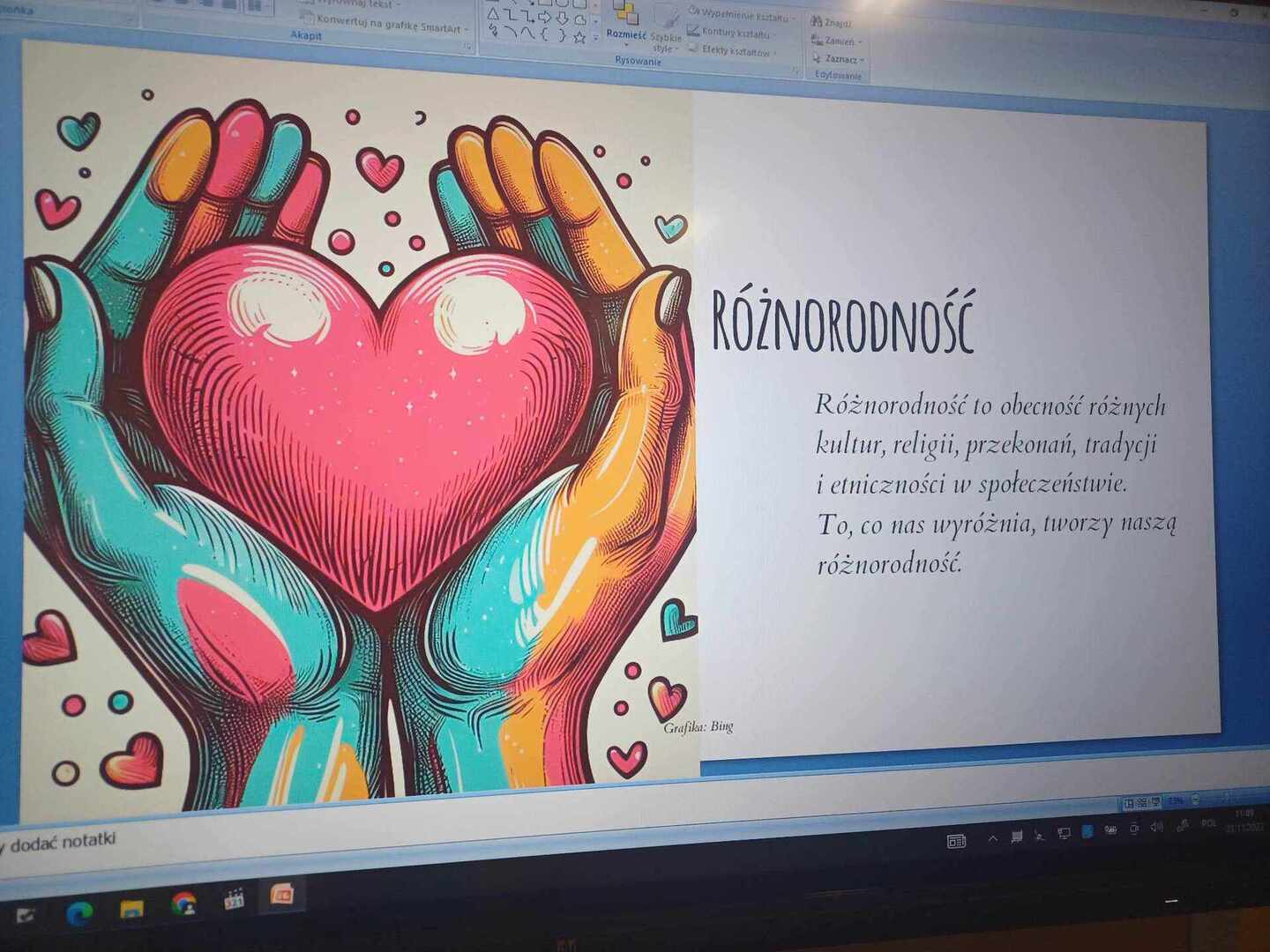 Międzynarodowy Dzień Tolerancji obchodzimy 16 listopada. Jest to święto szacunku, akceptacji i uznania różnorodności kultur na świecie. W ramach celebracji dnia na całym świecie organizowane są koncerty, wykłady, akcje uliczne i wystawy. W naszej szkole klasa 8 uczestniczyła w warsztatach "Tolerancja i różnorodność" prowadzonych przez pedagoga specjalnego. Młodzież aktywnie uczestniczyła w zajęciach, doskonale poradziła sobie z definicją tolerancji, brała udział w dyskusji i dzieliła się własnymi myślami .