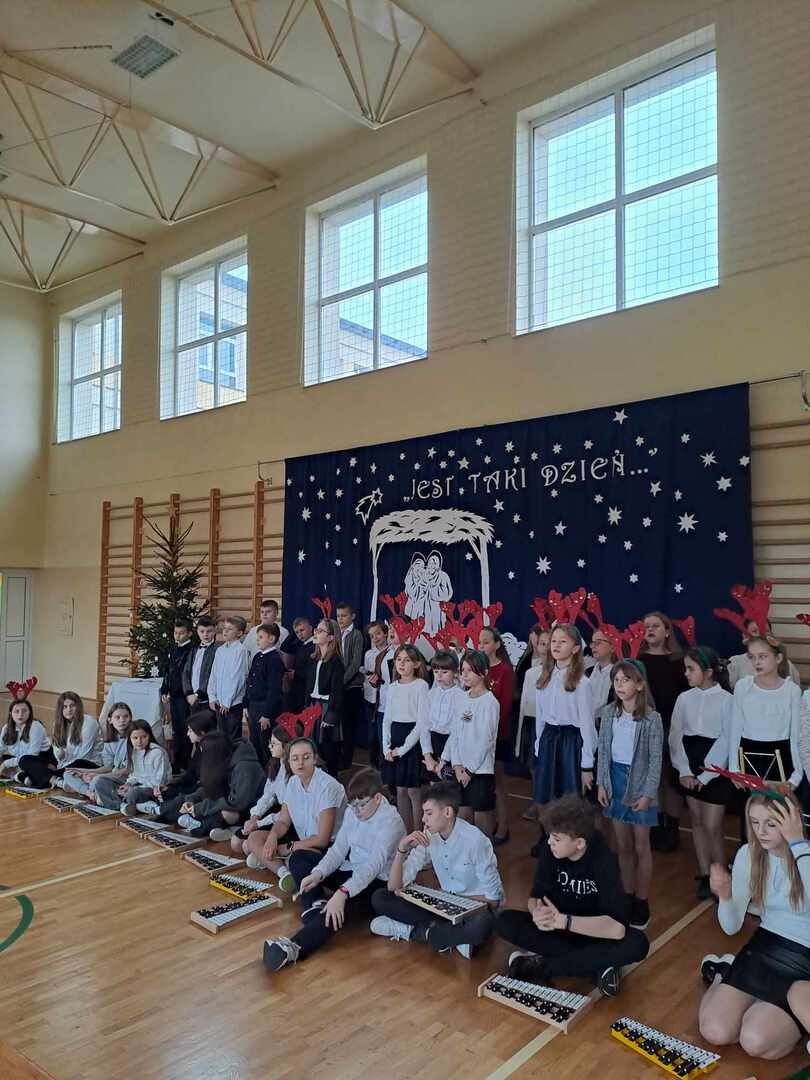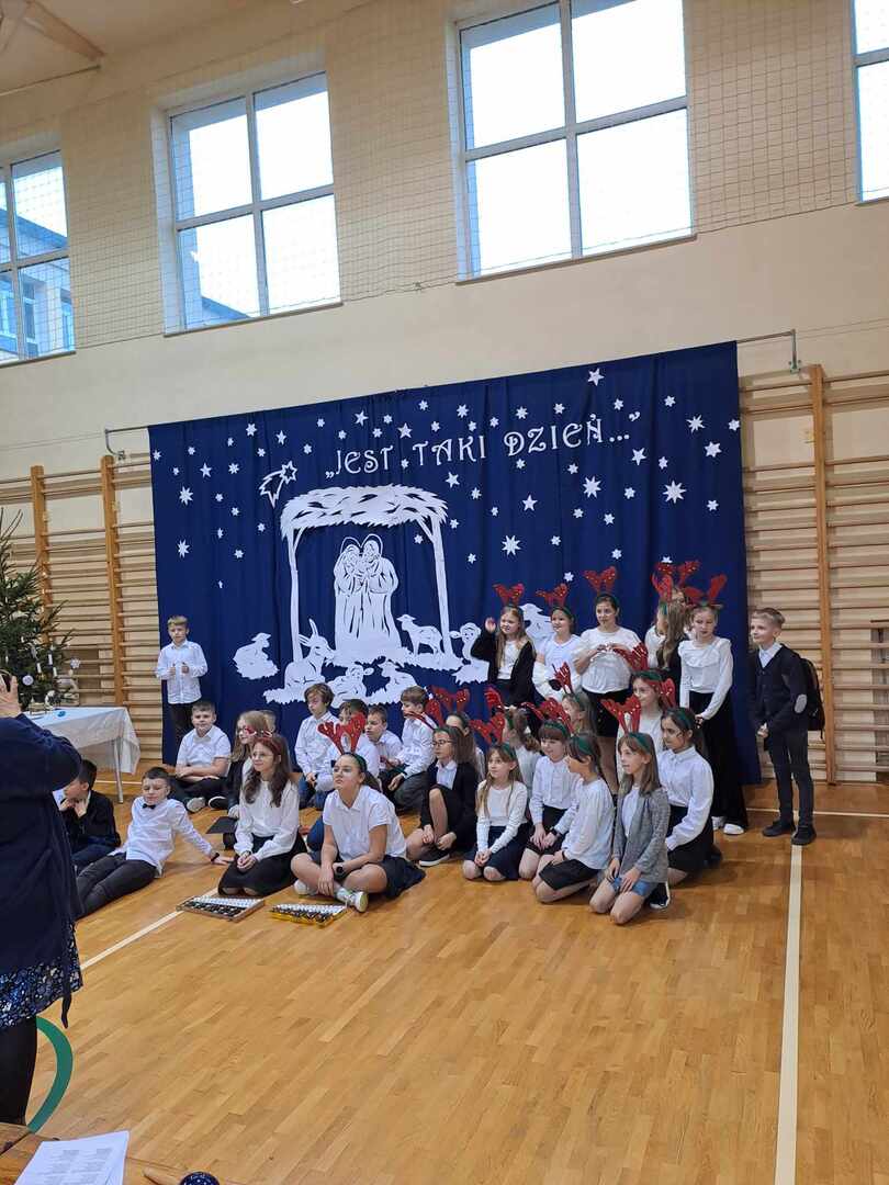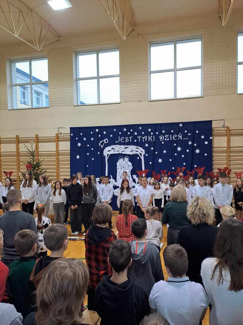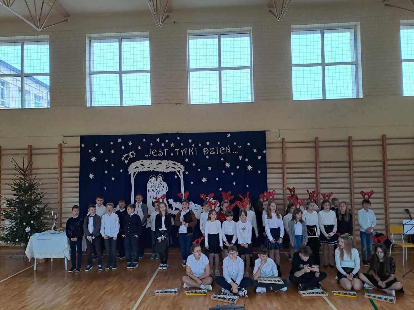 Utwór "Jest taki dzień" wprowadził nas w nastrój Świąt Bożego Narodzenia. Inscenizację słowno - muzyczną przygotowali uczniowie klasy czwartej we współpracy z chórem szkolnym. Piękne kolędy i pastorałki uświetniły występ młodych artystów. Na koniec uroczystości głos zabrała pani dyrektor składając wszystkim świateczne życzenia.