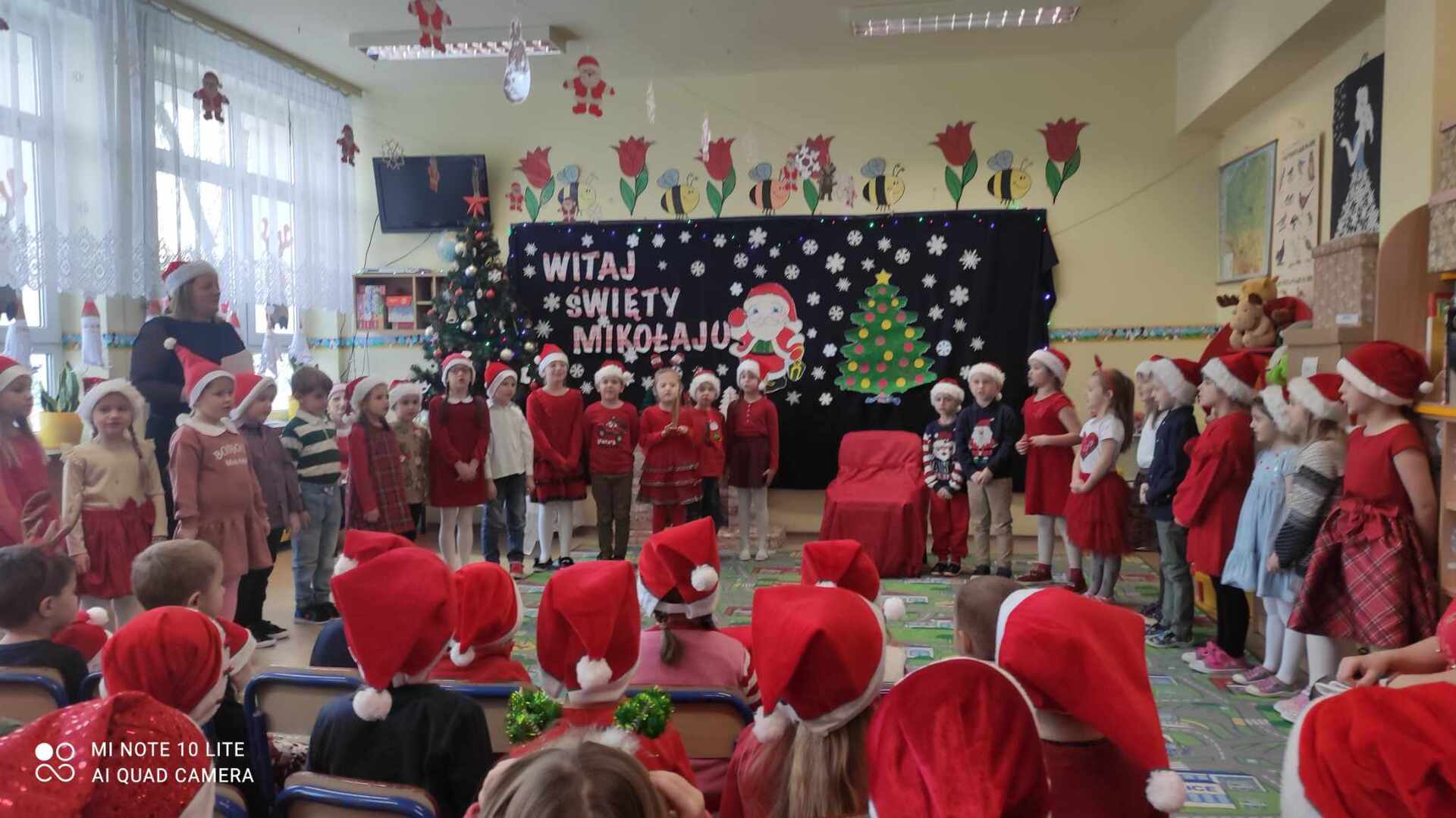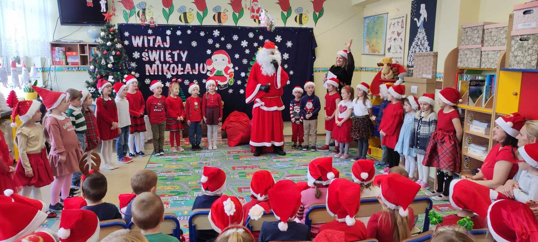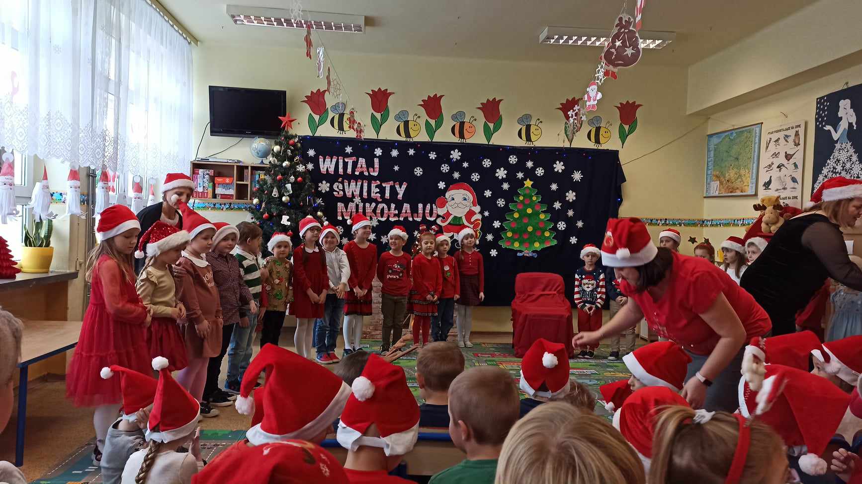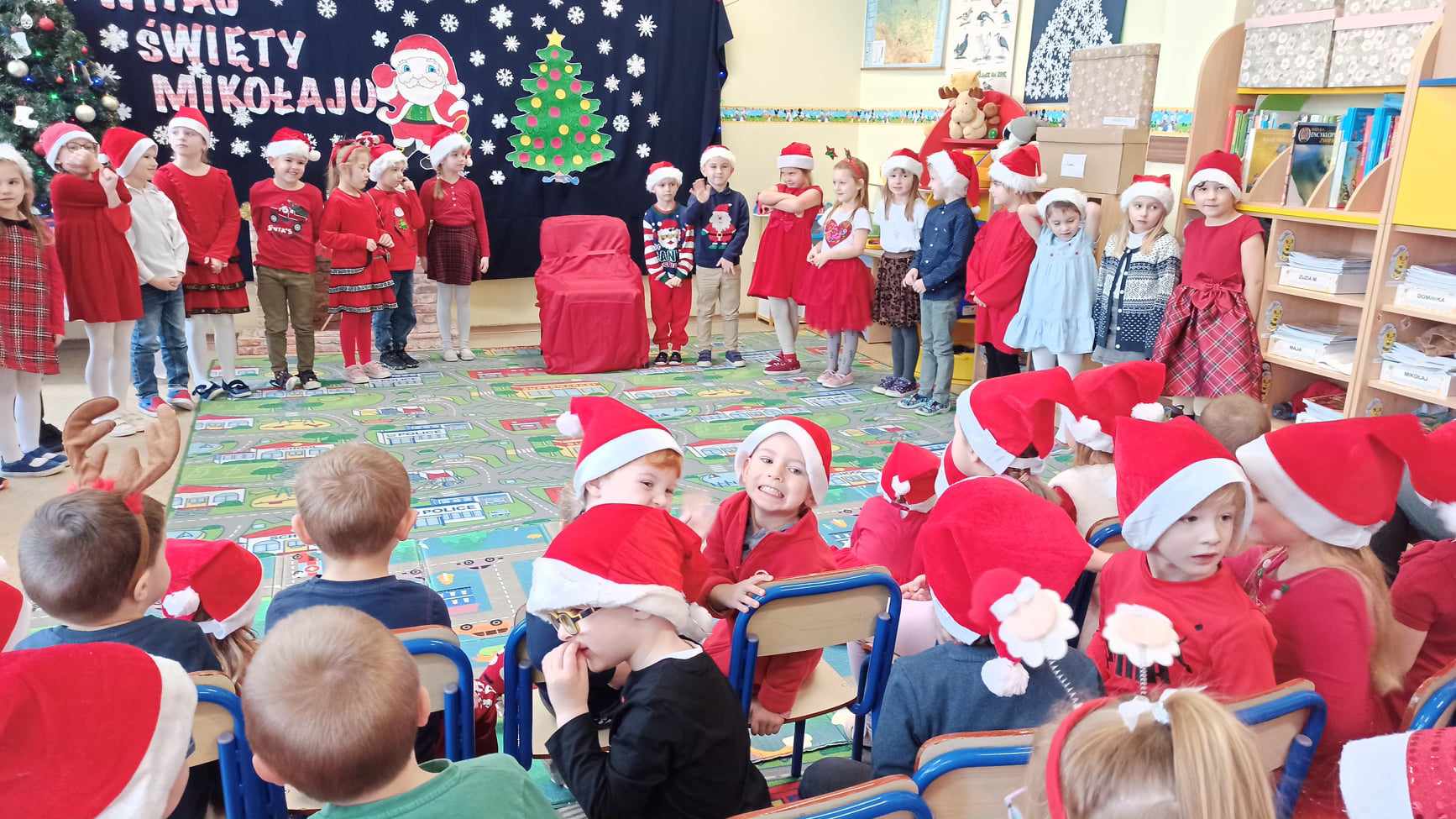 Mikołajki w przedszkolu to wydarzenie, które dla każdego przedszkolaka rozpoczyna początek świątecznej atmosfery.Już od początku grudnia dzieci z niecierpliwością wypatrują Mikołaja. Przedszkola, w tym szczególnym czasie, zamieniają się w piękną bajkową wioskę,a Mikołaj w przedszkolu staje się głównym bohaterem. 6 grudnia 2023 roku, z okazji tego wyjątkowego spotkania, grupa5-6 latki „Pszczółki” przygotowała dla przedszkolaków i uczniów klas I-III szkoły podstawowej, przedstawienie pt.„Przywitajmy Świętego Mikołaja”.Dzieci ubrane na czerwono, w mikołajkowych czapkach na głowach, z wielkim zaangażowaniem zaprezentowały wiersze i piosenki dla Mikołaja,włączając do śpiewania również publiczność.W całej szkole dało się słyszeć słowa piosenki „Czy słyszycie Mikołaj?”. Dla małych aktorów była to forma nauki poprzez zabawę oraz czas w którym dzieci przeniosły się w świat fantazji i na chwilę stały się bohaterami własnej świątecznej historii, wywołując uśmiech na twarzach przedszkolaków i uczniów.Można śmiało powiedzieć,że była to świetna lekcja świętowania dzieciństwa poprzez dawanie radości innym. Wychowawca grupy "Pszczółki" Agnieszka Krawiec