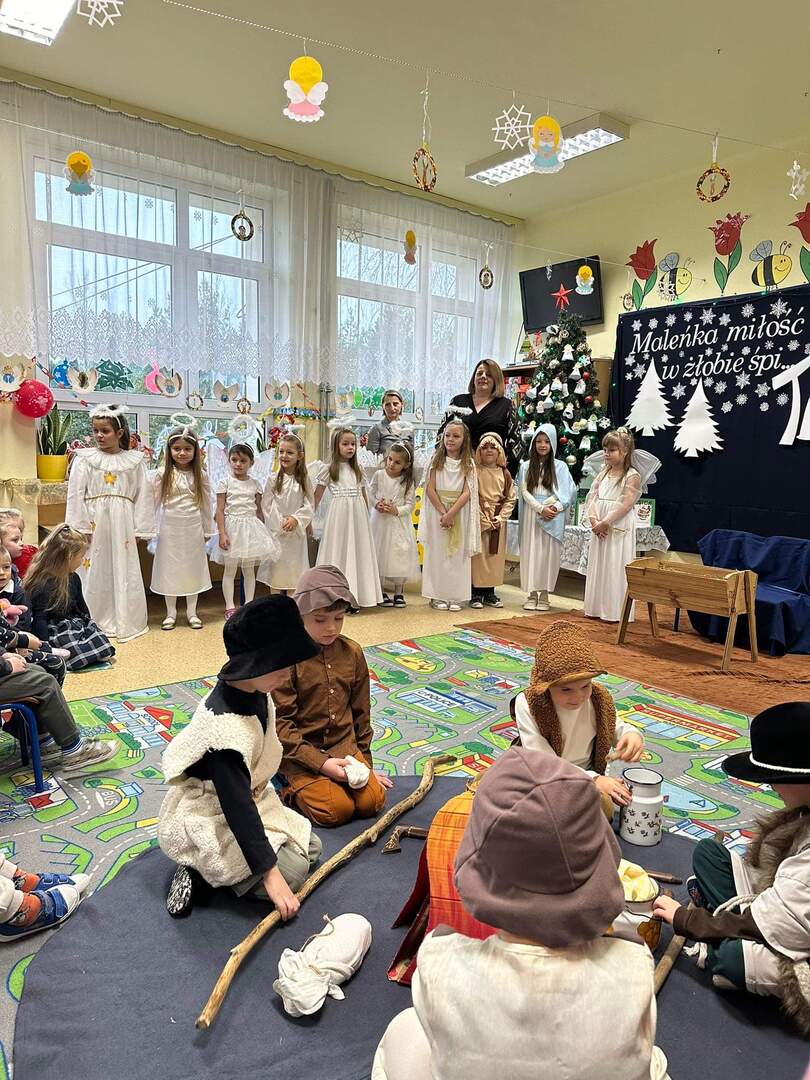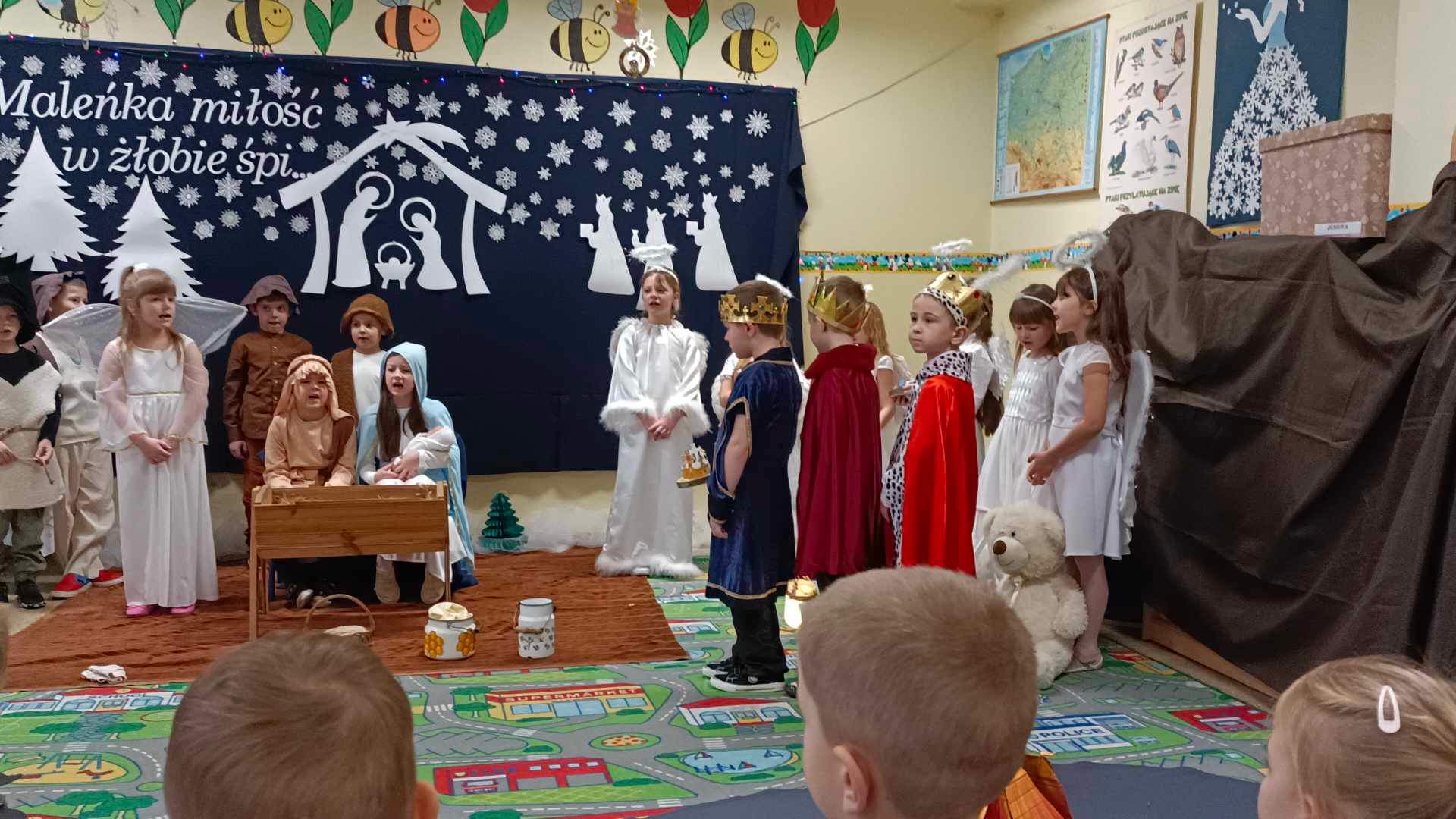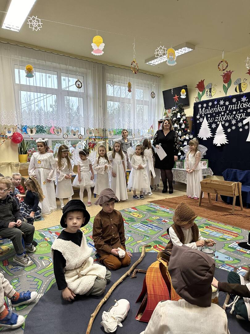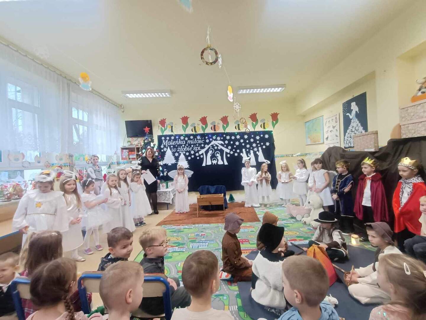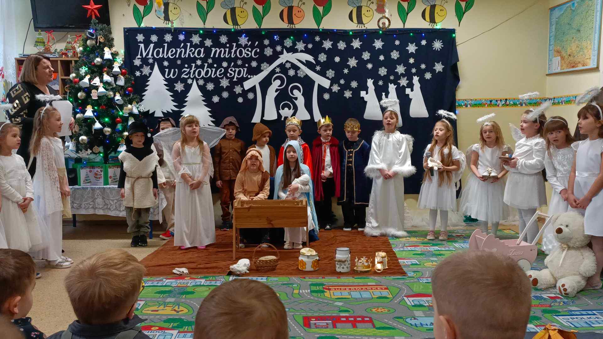 Święta Bożego Narodzenia są najbardziej rodzinnymi i ciepłymi świętami, pozwalającymi poczuć serdeczność oraz miłość wszystkich wokół. Zarówno dzieci, jak i dorośli, z niecierpliwością oczekują ich nadejścia. Magiczny czas i piękną atmosferę, dało się odczuć w naszym przedszkolu . By umilić czas oczekiwania na Święta Bożego Narodzenia, dzieci z grupy "Pszczółek" w środę 20 grudnia 2023 roku ,sprawiły wielką radość swoim bliskim oraz rówieśnikom z przedszkola pięknym przedstawieniem jasełkowym. Przedszkolaki, ku radości swoich rodziców, w pięknych strojach, przedstawiały historię narodzin Jezusa wzbogaconą kolędami, pastorałkami i świątecznymi piosenkami. Wychowawca grupy "Pszczółki" Agnieszka Krawiec