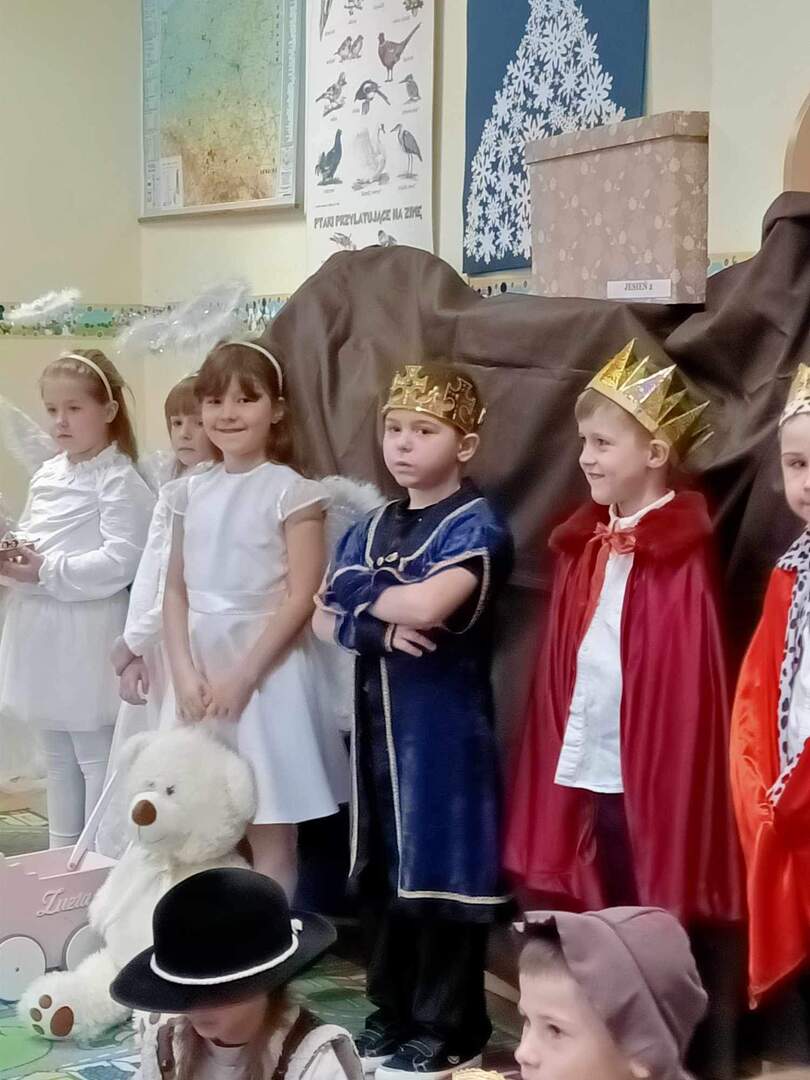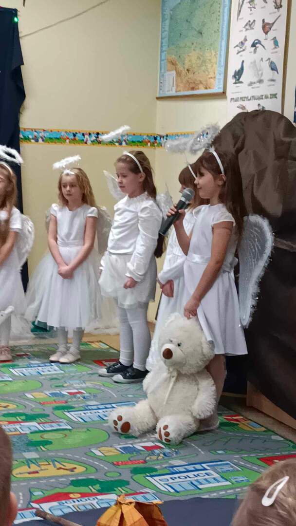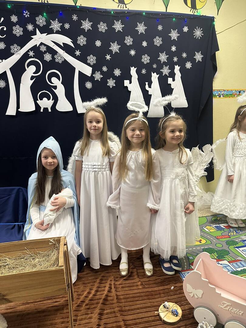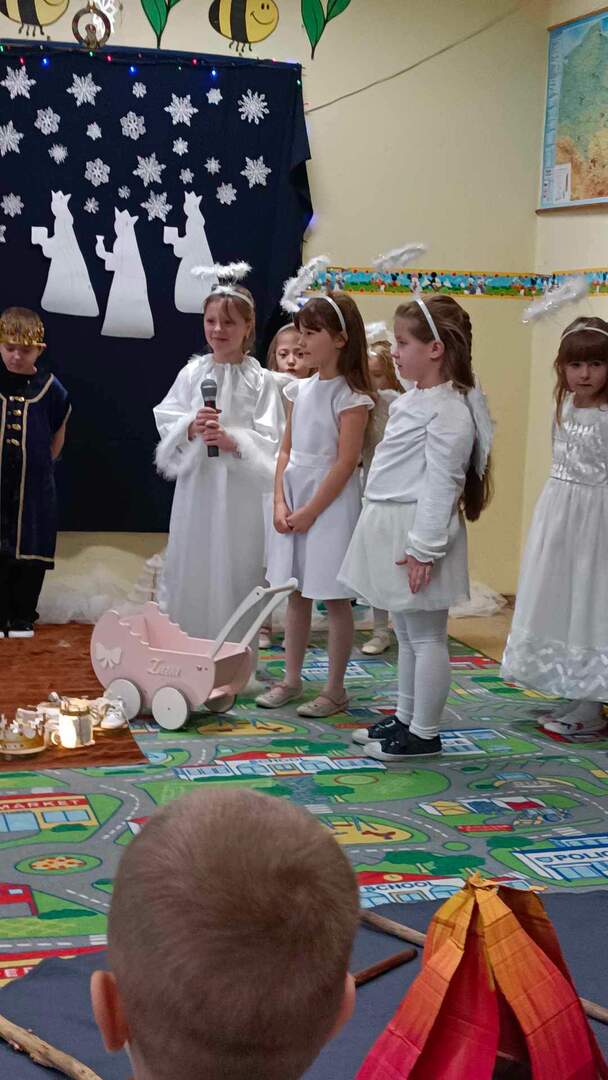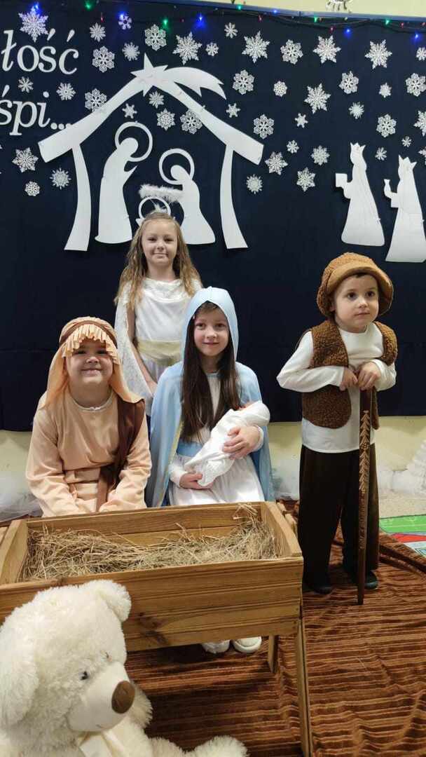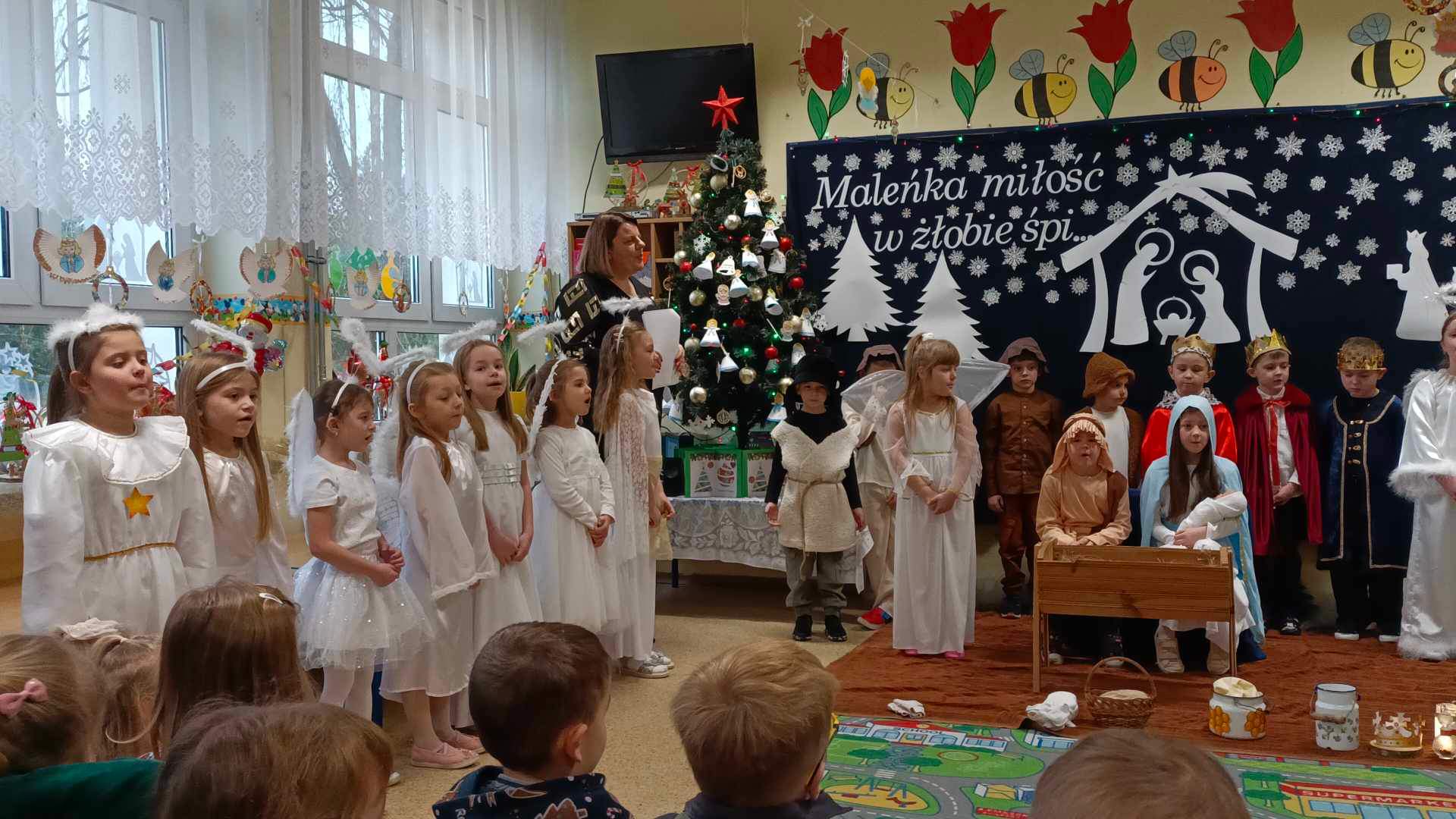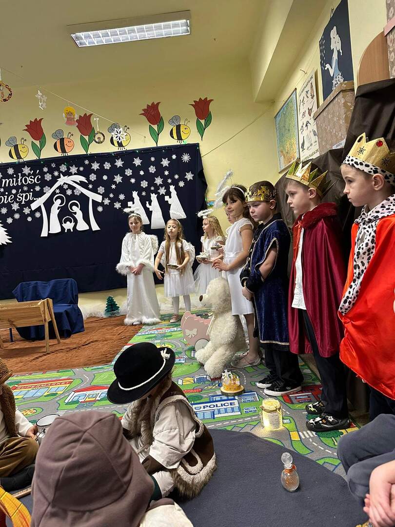 Święta Bożego Narodzenia są najbardziej rodzinnymi i ciepłymi świętami, pozwalającymi poczuć serdeczność oraz miłość wszystkich wokół. Zarówno dzieci, jak i dorośli, z niecierpliwością oczekują ich nadejścia. Magiczny czas i piękną atmosferę, dało się odczuć w naszym przedszkolu . By umilić czas oczekiwania na Święta Bożego Narodzenia, dzieci z grupy "Pszczółek" w środę 20 grudnia 2023 roku ,sprawiły wielką radość swoim bliskim oraz rówieśnikom z przedszkola pięknym przedstawieniem jasełkowym. Przedszkolaki, ku radości swoich rodziców, w pięknych strojach, przedstawiały historię narodzin Jezusa wzbogaconą kolędami, pastorałkami i świątecznymi piosenkami. Wychowawca grupy "Pszczółki" Agnieszka Krawiec