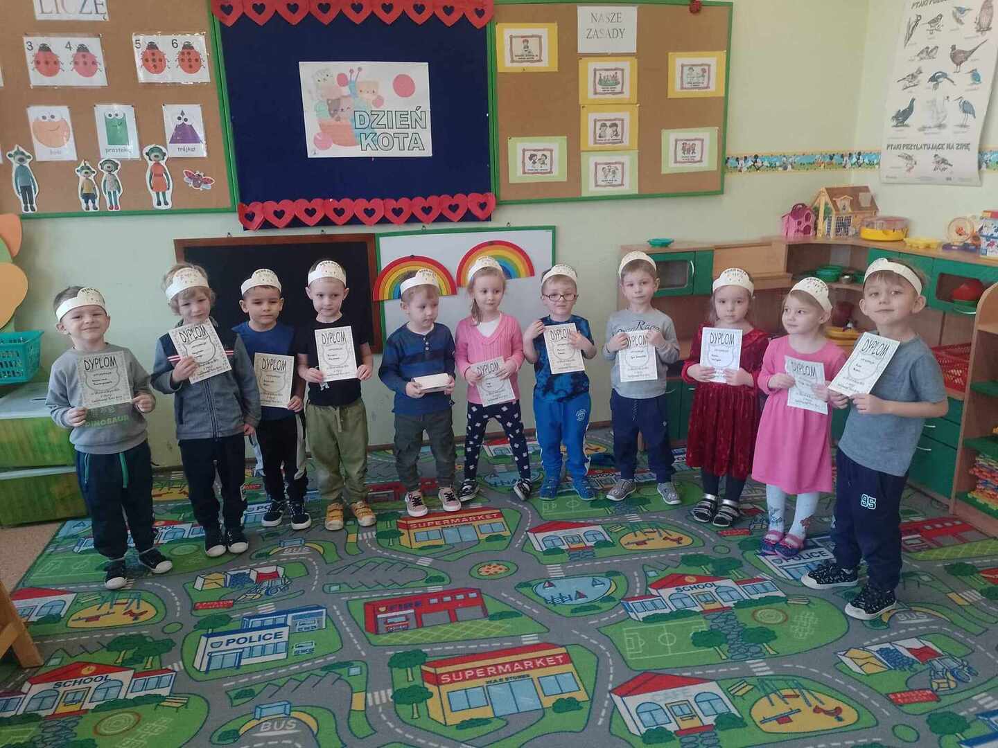 17 lutego obchodziliśmy Dzień Kota, tej okazji, przedszkolaki na zajęciach zamieniły się w kociaki. Wysłuchały opowiadania o chorym kotku a później uczyły się, w jaki sposób opiekować się tymi zwierzętami, śpiewały piosenki o kotkach, oglądały ilustracje przedstawiające milusińskie zwierzątka, dowiedziały się wiele ciekawych rzeczy na ich temat. Były też wesołe „kocie zabawy", rozwiązywanie zagadek oraz wykonanie kotka.