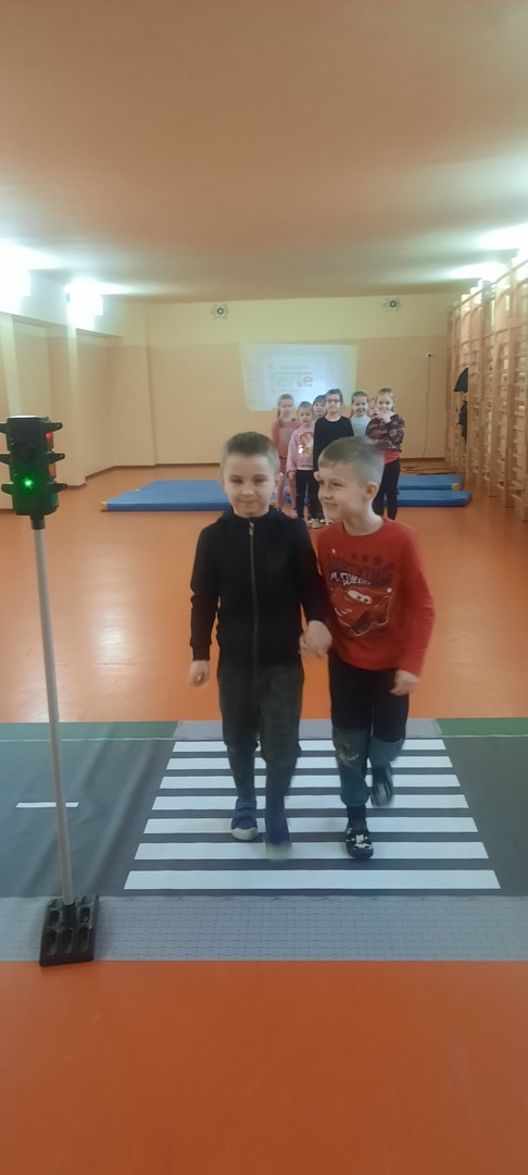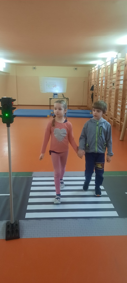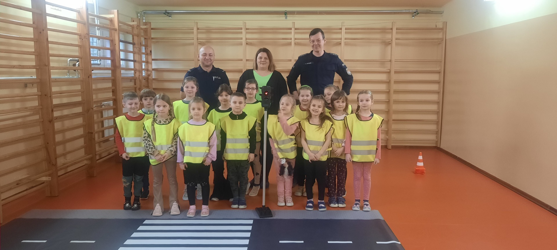 Dbając o bezpieczeństwo naszych wychowanków w czasie zbliżających się ferii zimowych,26 stycznia 2024r. w naszym przedszkolu, odbyło się spotkanie profilaktyczno – edukacyjne z udziałem przedstawicieli Policji. Przypomnieli oni dzieciakom o zagrożeniach czyhających na dzieci w trakcie ferii zimowych oraz jak ich unikać. Omówione zostały zasady bezpieczeństwa podczas uprawiania sportów zimowych i zabaw na świeżym powietrzu. Przestrzegali przed organizowaniem kuligów za pojazdami mechanicznymi. Mówili o niebezpieczeństwie wchodzenia na zamarznięte zbiorniki wodne. Funkcjonariusze Policji poruszyli kwestię bezpieczeństwa dzieci na drodze nie tylko podczas ferii, ale na co dzień. Stwierdził, że na każdym kroku warto przypomnieć o podstawowych zasadach poruszania się pieszych po drogach. Dlatego warto zaopatrzyć się w elementy odblaskowe. Oprócz tego warto więc pamiętać o takich prostych zasadach, aby nie otwierać drzwi nieznajomym osobom i zawsze zamykać je na klucz – pouczał policjant. Przedszkolaki miały także okazję utrwalić numery alarmowe, a także dowiedziały się jakich informacji należy udzielić, by uzyskać pomoc. Dzieci z dużym zainteresowaniem słuchały rad i wskazówek zaproszonych gości. Atrakcją spotkania była mata z przejściem dla pieszych i sygnalizator. Każde dziecko miało możliwość pokazania jak należy przechodzić przez ulicę.