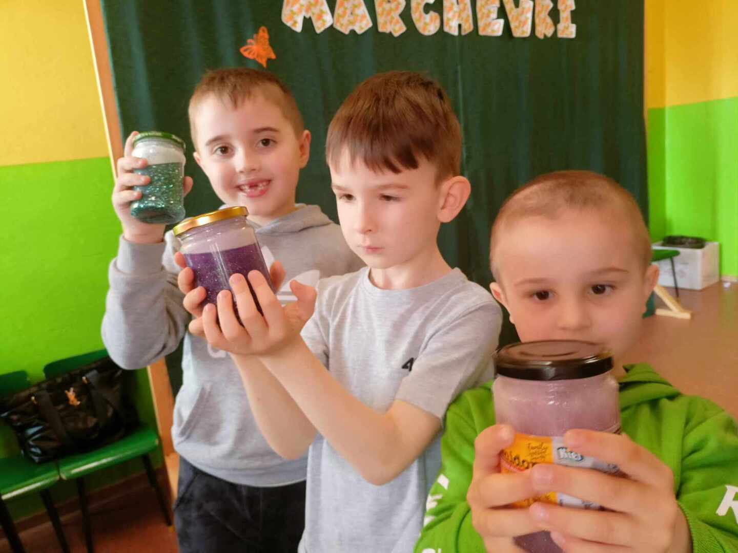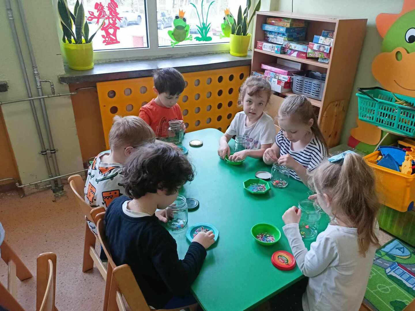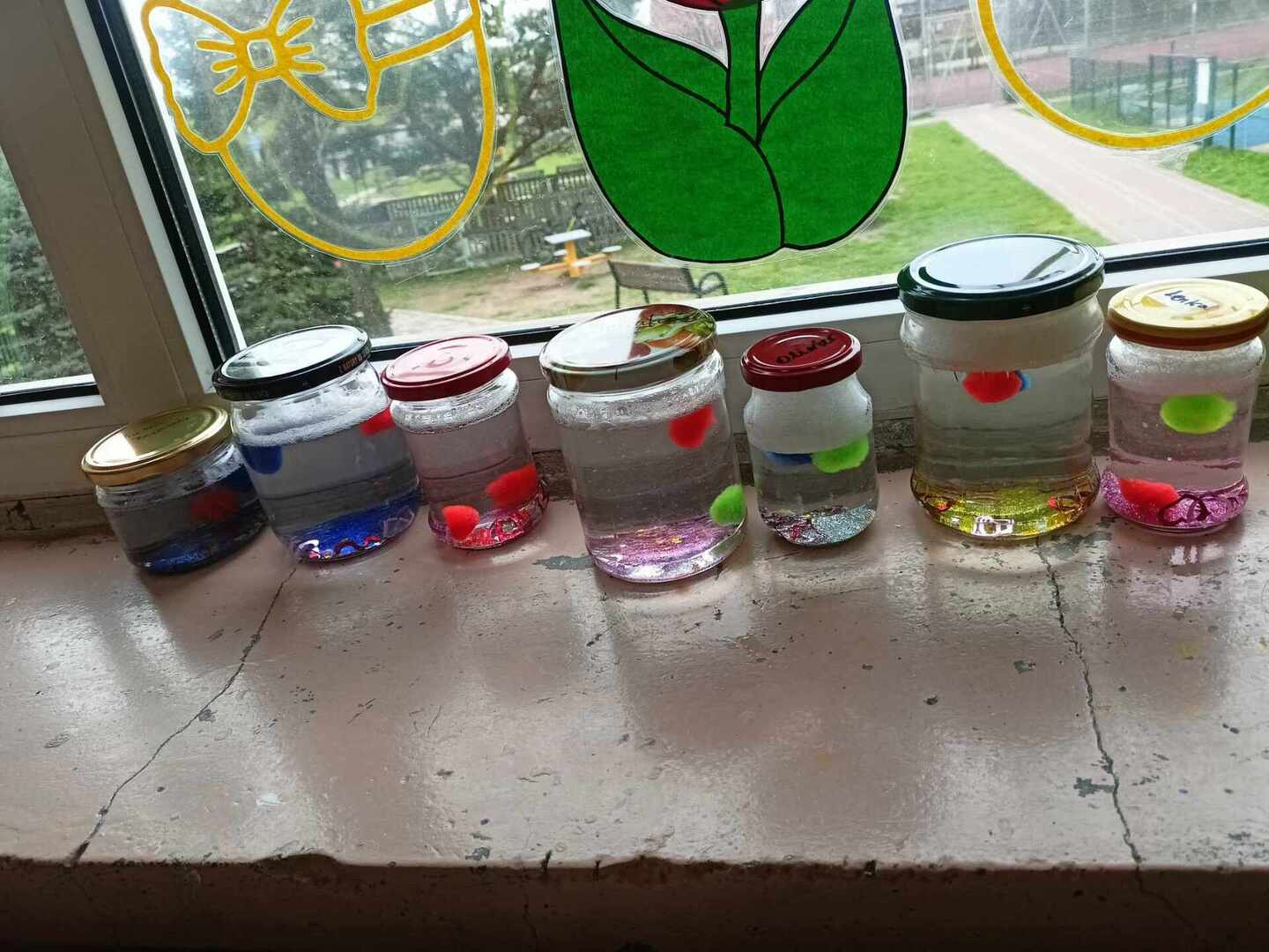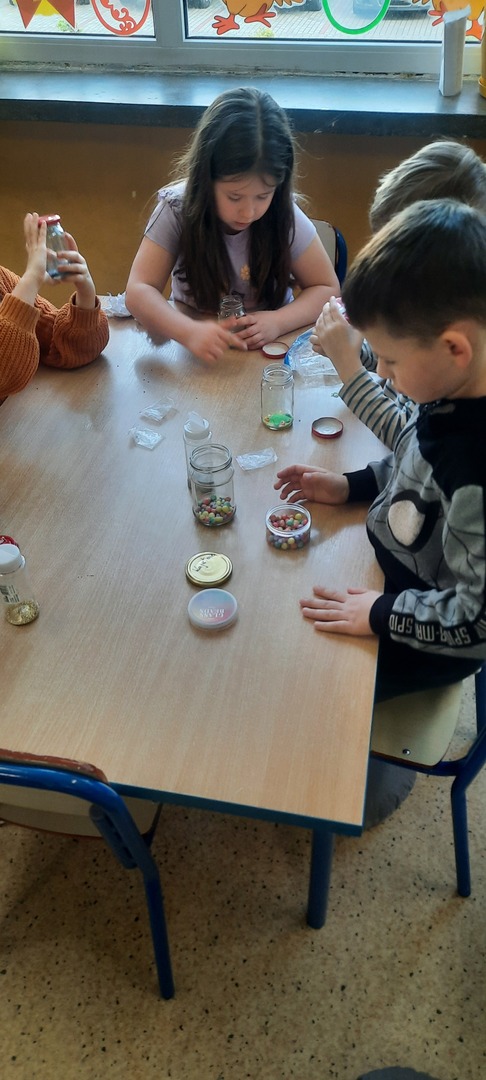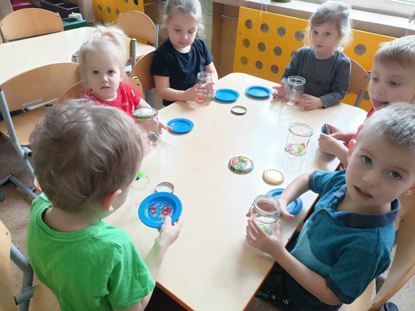Ostatnią omawianą emocją przez wszystkie grupy przedszkolne była bardzo pożądana przez wszystkich emocja: spokój. Dzieci obejrzały bajkę relaksacyjną z morałem "Dwie sowy". Ponadto uczyły się technik relaksacyjnych i oddechowych: dmuchały piórko, oddychały wodząc palcem po dłoni udając wspinającą sie mrówkę. Jednak najwięcej radości sprawiły słoiki spokoju z brokatem, które symbolizują nasze wzburzone emocje i zachowania oraz mają służyć do uspoakajania i relaksacji w domu.