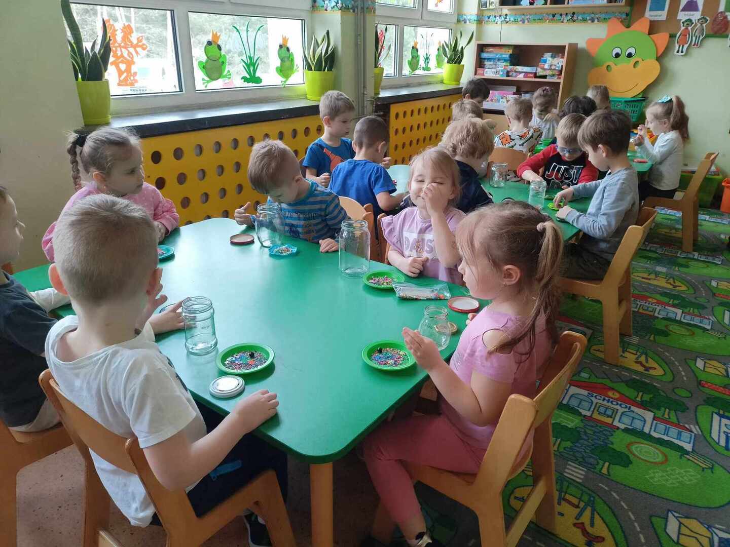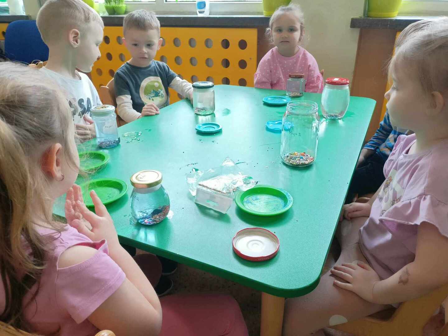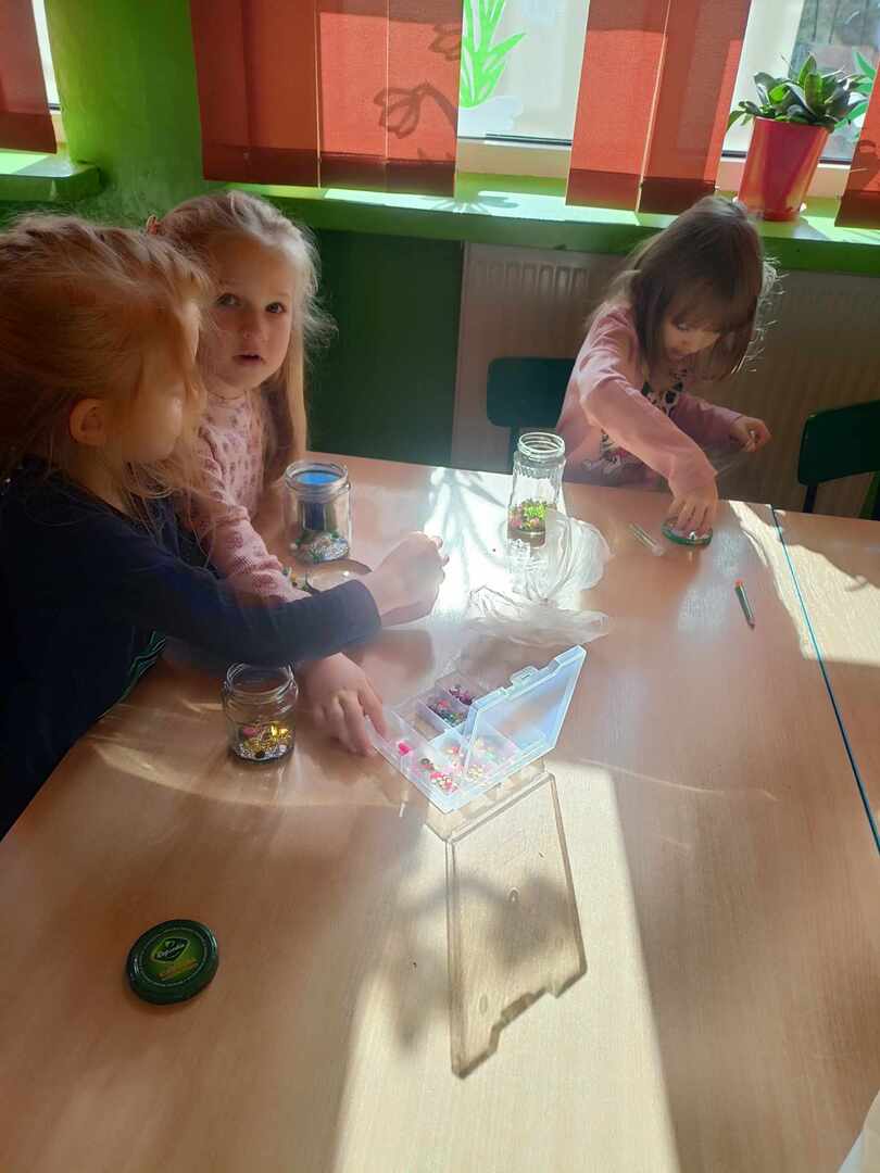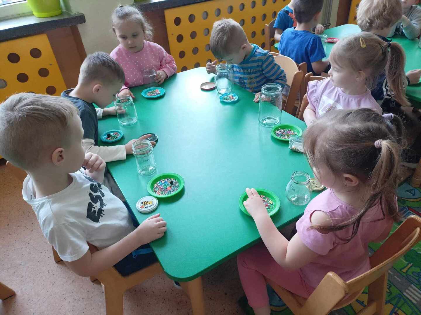 Ostatnią omawianą emocją przez wszystkie grupy przedszkolne była bardzo pożądana przez wszystkich emocja: spokój. Dzieci obejrzały bajkę relaksacyjną z morałem "Dwie sowy". Ponadto uczyły się technik relaksacyjnych i oddechowych: dmuchały piórko, oddychały wodząc palcem po dłoni udając wspinającą sie mrówkę. Jednak najwięcej radości sprawiły słoiki spokoju z brokatem, które symbolizują nasze wzburzone emocje i zachowania oraz mają służyć do uspoakajania i relaksacji w domu.