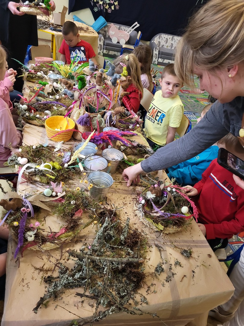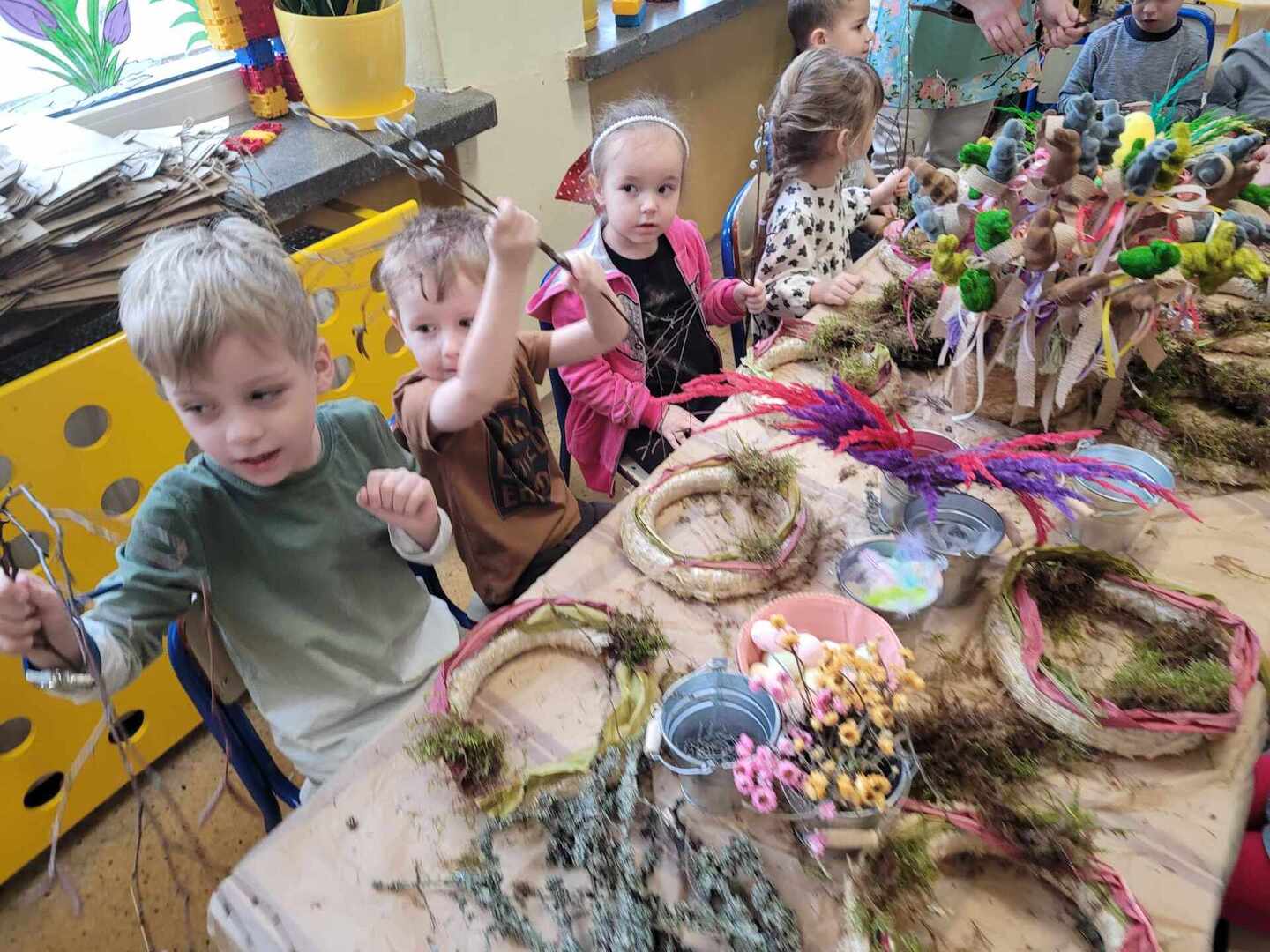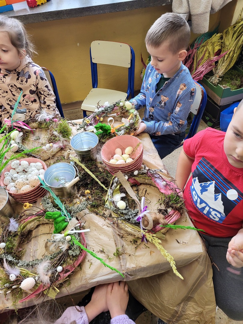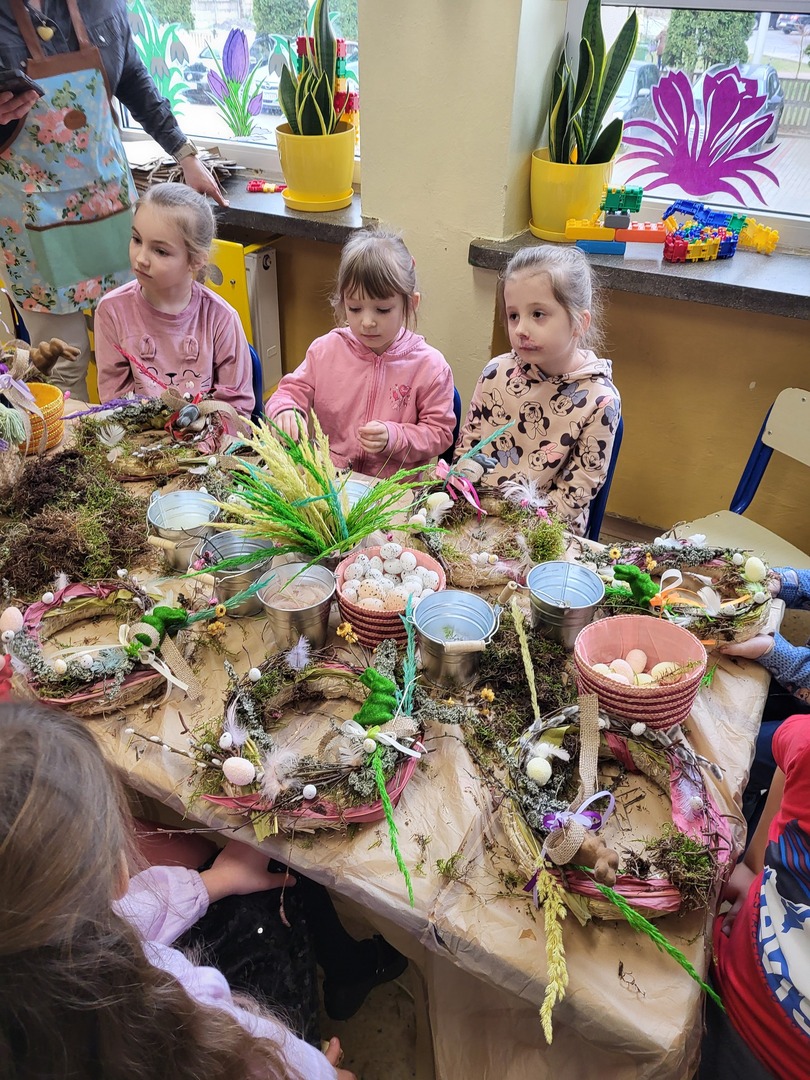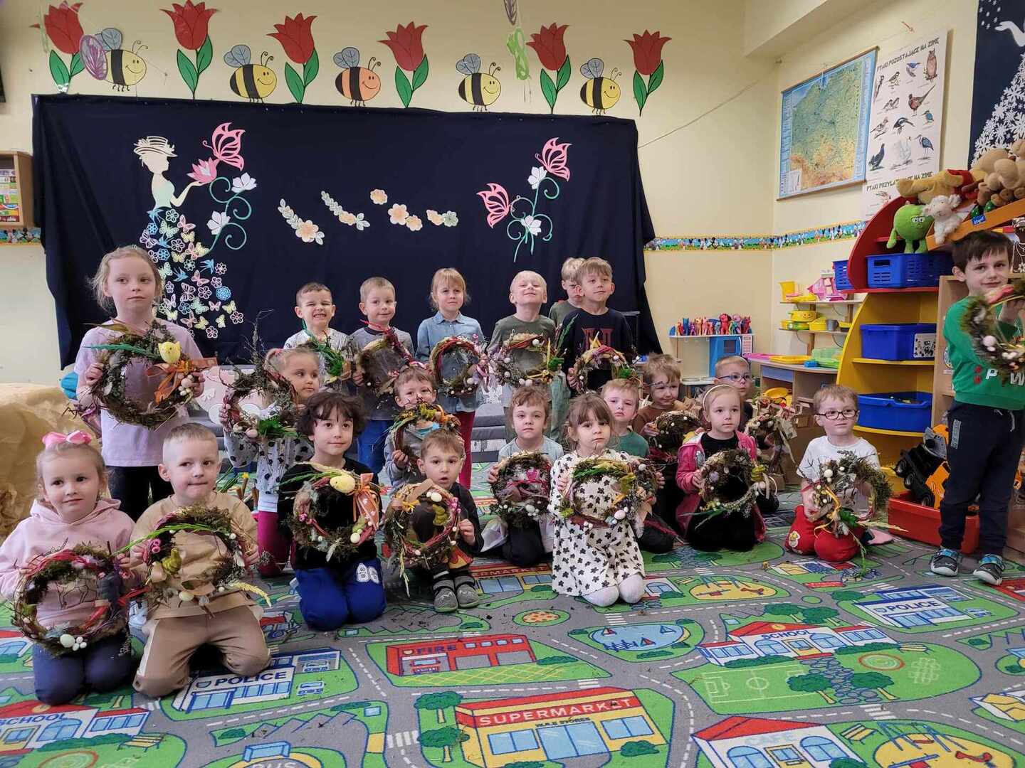 12 marca 2024 roku w naszym przedszkolu odbyły się warsztaty wiosenno-wielkanocne. Celem spotkania było propagowanie i kultywowanie tradycji związanej ze świętami wielkanocnymi. W miłej i radosnej atmosferze ,przedszkolaki spędziły czas na kreatywnej twórczości świątecznej,samodzielnie ozdabiając wianki wielkanocne. Wszyscy wykazali się kreatywnością i pomysłowością. Każdy wianek był piękny i niepowtarzalny, a co najważniejsze samodzielnie wykonany:).