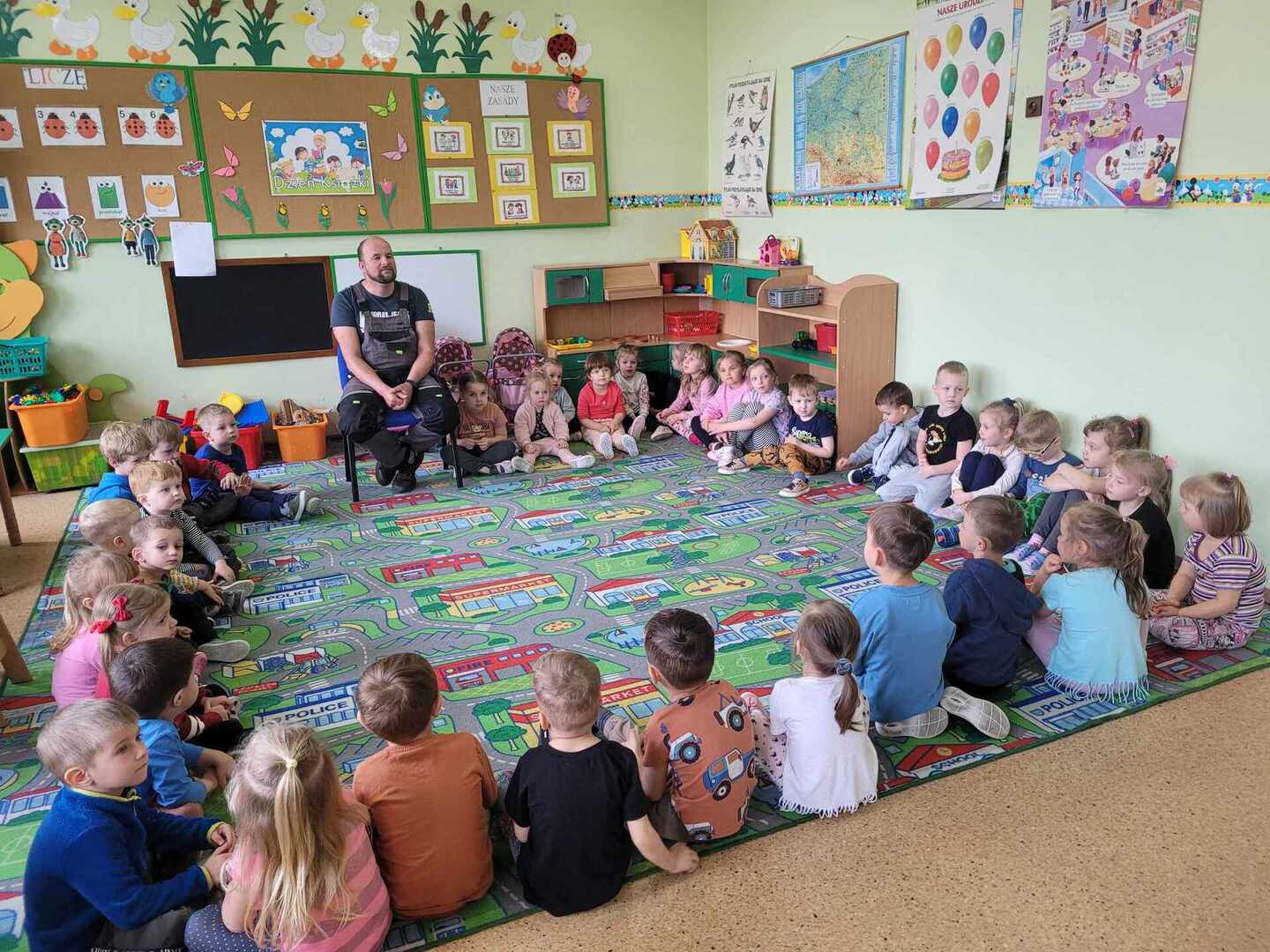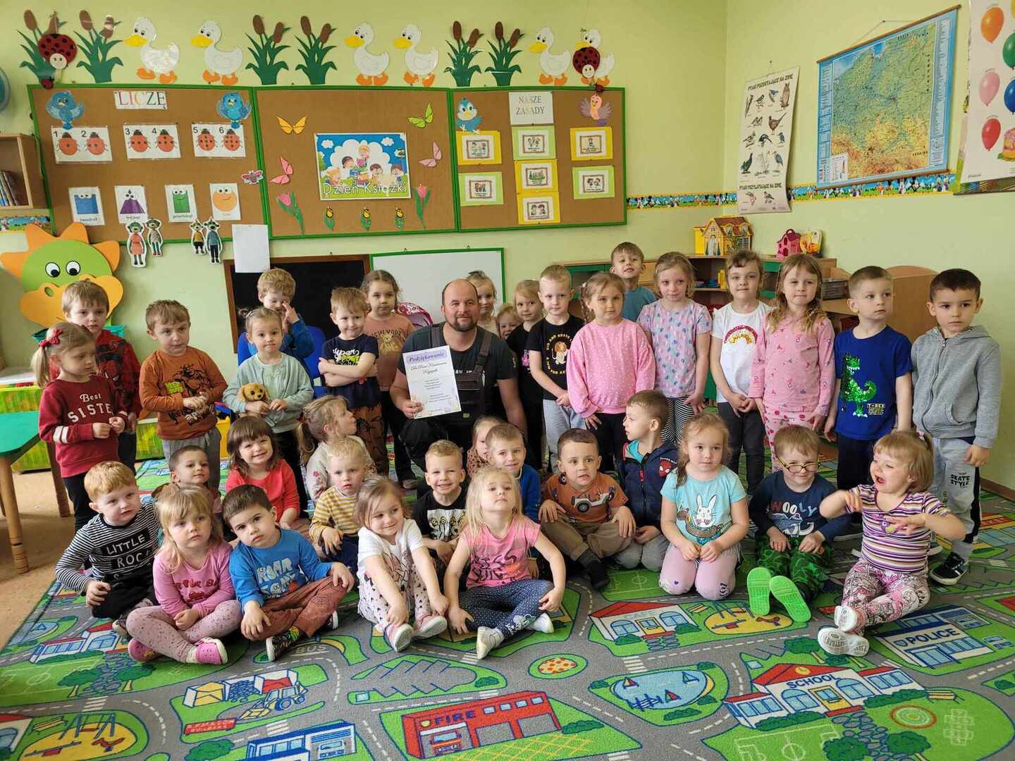 W związku z realizacją Projektu edukacyjnego pt. ,, Kim będę w przyszłości?- poznajemy zawody naszych rodziców” przedszkolaki zapoznały się zawodami osób pracujących w naszym przedszkolu. Dzieci zamieniły się chwilowo w dziennikarzy aby dowiedzieć się jak najwięcej o zawodach pracowników naszego przedszkola. Przedszkolaki z grupy ,, Pszczółki” przeprowadziły wywiad z Panią woźną Marzenką Drabik, w trakcie którego dowiedziały się ważnych rzeczy na temat jej pracy. Dzieci bardzo aktywnie zadawały pytania i z wielkim zainteresowaniem słuchały odpowiedzi naszego gościa. Dowiedziały się między innymi ile lat Pani Marzenka pracuje w naszej placówce, co należy do jej obowiązków i czy lubi swoją pracę. Przedszkolaki z grupy ,, Motylki” i ,, Biedronki” przeprowadziły wywiad z naszym Panem konserwatorem Krzysztofem Wojniakiem. Na początku dzieci były troszeczkę zestresowane obecnością Pana Krzyśka, ale z czasem odważyły się i z ciekawością zadawały pytania naszemu gościowi. Wielkim zainteresowaniem cieszyła się skrzynka z narzędziami Pana konserwatora, której użył do naprawy zepsutej szafki. Na koniec spotkania dzieci wręczyły dyplomy naszym gościom i zrobiły sobie z nimi pamiątkowe zdjęcie.