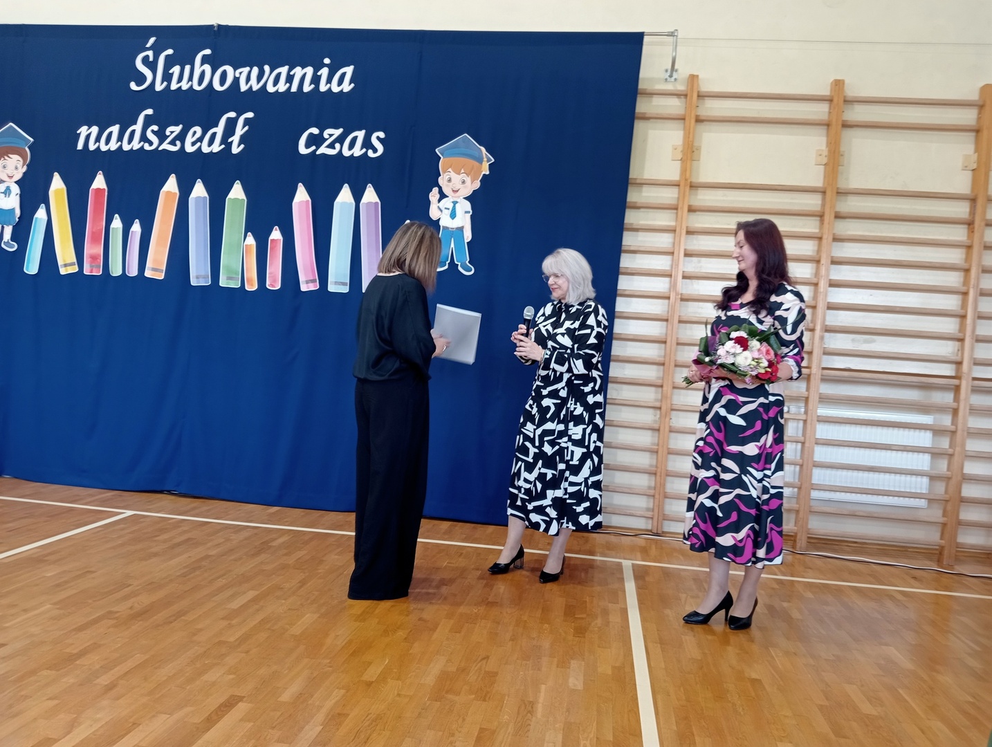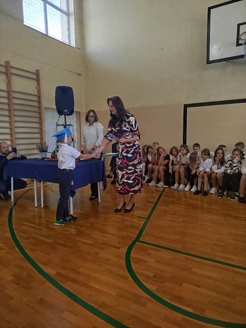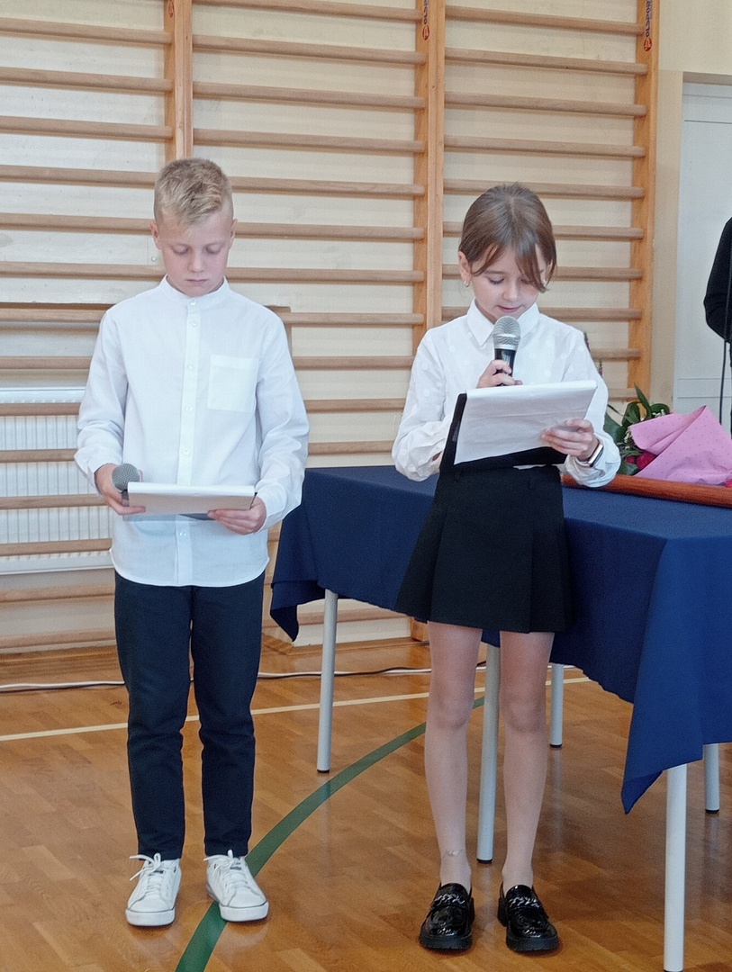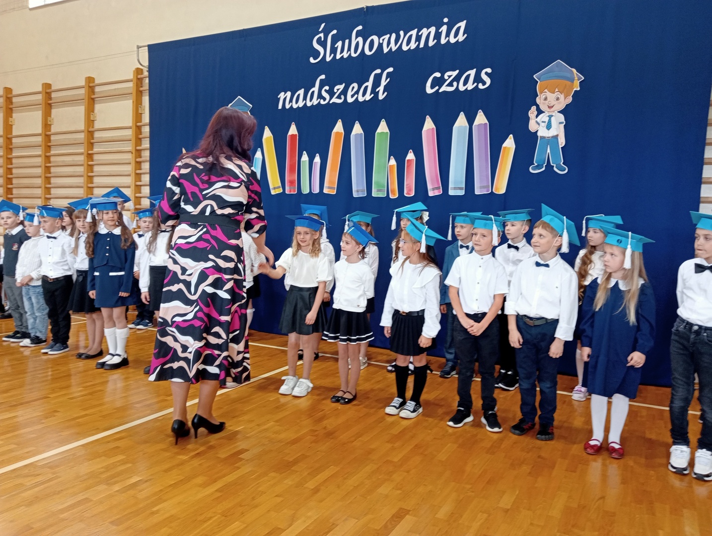14 października miała miejsce niezwykle ważna dla życia szkoły uroczystość ślubowania i pasowania uczniów klas pierwszych. Jest to szczególny dzień, który na długo pozostanie w pamięci każdego ucznia klasy pierwszej. Pierwszoklasiści przygotowywali się do tego dnia wytrwale i starannie. W obecności rodziców, dyrekcji szkoły, nauczycieli i uczniów starszych klas pokazali, że potrafią pięknie śpiewać i recytować wiersze. Wykazali się wiedzą i znajomością zasad ułatwiających prawidłowe funkcjonowanie w szkole i grupie rówieśniczej. Ślubowali być godnymi Polakami i wzorowymi uczniami. W ten sposób zostali oficjalnie przyjęci do grona społeczności szkolnej. Pani dyrektor przemawiając do pierwszoklasistów podkreśliła znaczenie tego wyjątkowego momentu, który otwiera drzwi do świata nauki, przyjaźni i nowych doświadczeń. Słowa podziękowania skierowała również do Rodziców uczniów, którzy licznie zaszczycili szkołę swoją obecnością w tym dniu. Wszystkim Pierwszakom życzymy powodzenia i wielu sukcesów. 14 października to Dzień Edukacji Narodowej. Jest świętem nauczycieli i wszystkich pracowników oświaty. Z tej okazji uczniowie klasy IV zaprezentowali krótki program artystyczny. W imieniu całej społeczności szkolnej podziękowali nauczycielom, wyrazili wdzięczność za wspólnie spędzone chwile, za odkrywanie pasji i zainteresowań oraz cierpliwość i wyrozumiałość. Podziękowali również pracownikom obsługi za codzienną pracę i życzliwość. Pani dyrektor Iwona Stryjecka – Pezda wyróżniła nauczycieli i innych pracowników wręczając Nagrody Dyrektora. Nagrodę Burmistrza z rąk pani sekretarz gminy Marii Wójcik otrzymała pani Anna Warmuz.
