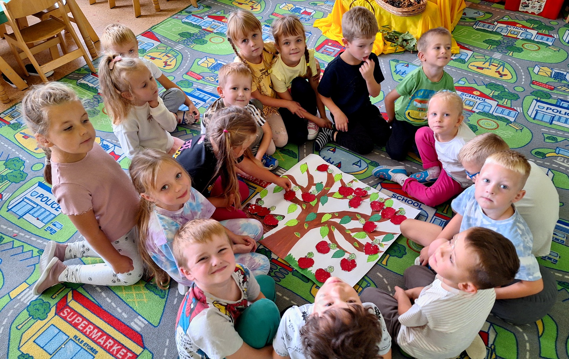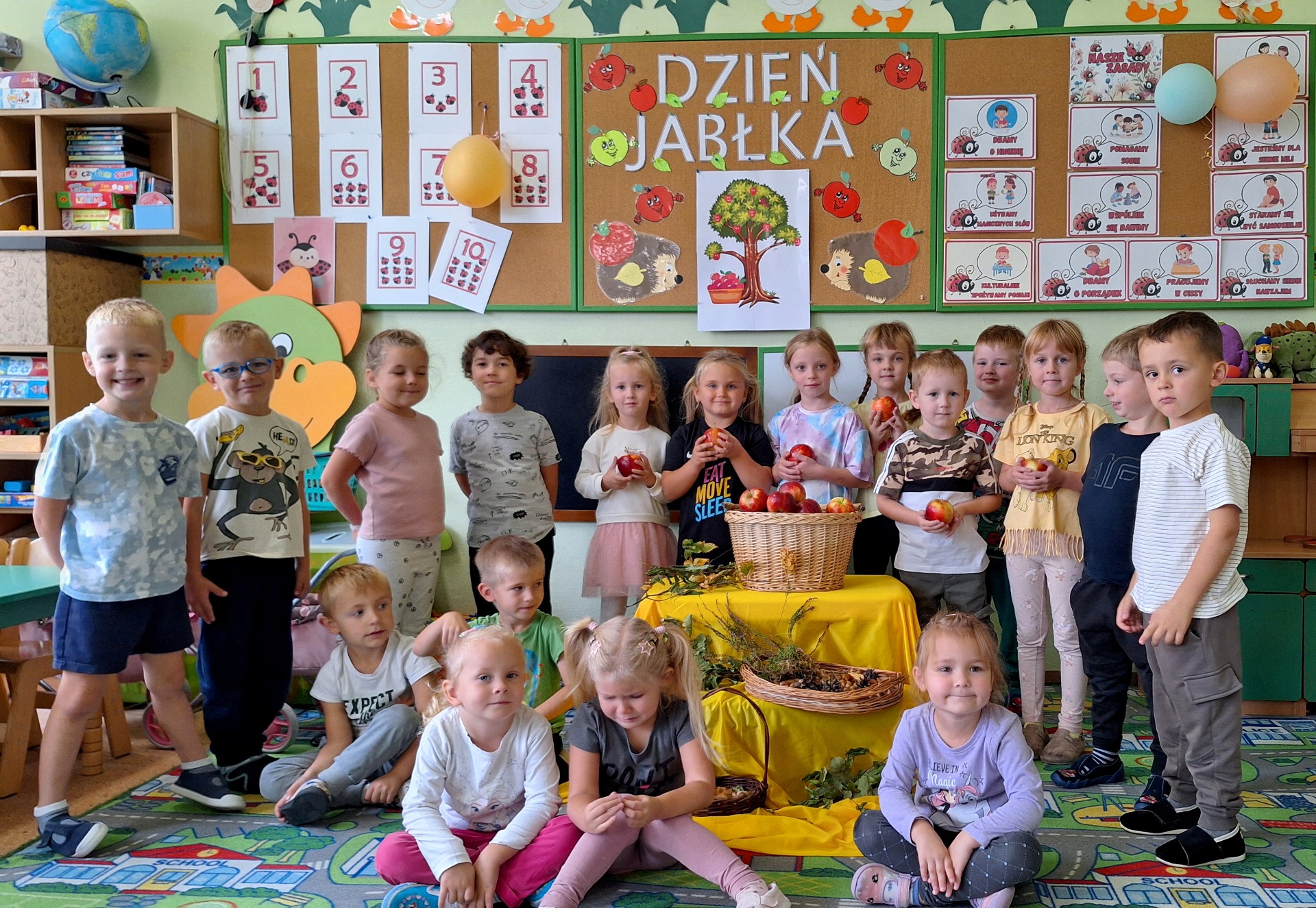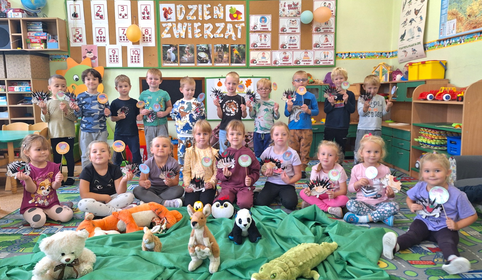 Miesiąc październik, jak na czas jesienny przystało,obfitował w naszym przedszkolu w zajęcia o tematyce przyrodniczej. Przedszkolaki podczas codziennych zajęć wzbogacały swoją wiedzę i w sposób praktyczny badały świat zmieniającej się przyrody.W sali aktywnie uczestniczyły w ciekawych zajęciach z okazji Dnia Drzewa, następnie spacerowały po pobliskim lesie, by zetknąć się bezpośrednio z przyrodą i na swój sposób doświadczyć jak piękne i pożyteczne są drzewa. Kilka dni później świętowaliśmy Dzień Owoców i Warzyw.Tego dnia w każdej przedszkolnej sali można było usłyszeć wiersz Jana Brzechwy „Na straganie”.Przeprowadzone zajęcia miały na celu zwrócenie uwagi na walory zdrowotne owoców i warzyw ,przypomnienie dzieciom popularnych nazw owoców oraz zapoznanie z tymi mniej znanymi (np. brukselka, kalarepka).Atrakcję,piękny wygląd i zapach dał prawdziwy stragan ,który powstał ze świeżych owoców i warzyw.Przedszkolaki dowiedziały się ,że warzywa i owoce to bogactwo wielu witamin potrzebnych nam szczególnie przed zbliżającą się zimą. Podczas chłodu i zimna musimy dbać o siebie szczególnie ,ale nie możemy też zapominać o zwierzakach ,które często potrzebują naszej pomocy.Dlatego też w naszym przedszkolu zorganizowaliśmy Dzień Kundelka.Odbyły się zajęcia tematyczne dotyczące życia czworonogów,omówione zostały ich potrzeby ,zwyczaje i upodobania.Szczególną uwagę zwrócono na zapewnienie schronienia i pożywienia zwłaszcza tym porzuconym… Kształtując u naszych przedszkolaków wrażliwość i empatię związaną z losem bezdomnych zwierząt,dzieci włączyły się w akcję na rzecz pomocy bezdomnym zwierzętom.Dzięki tym zajęciom i tej inicjatywie przedszkolaki wiedzą, że zwierzętom należy pomagać i nie wolno ich krzywdzić.