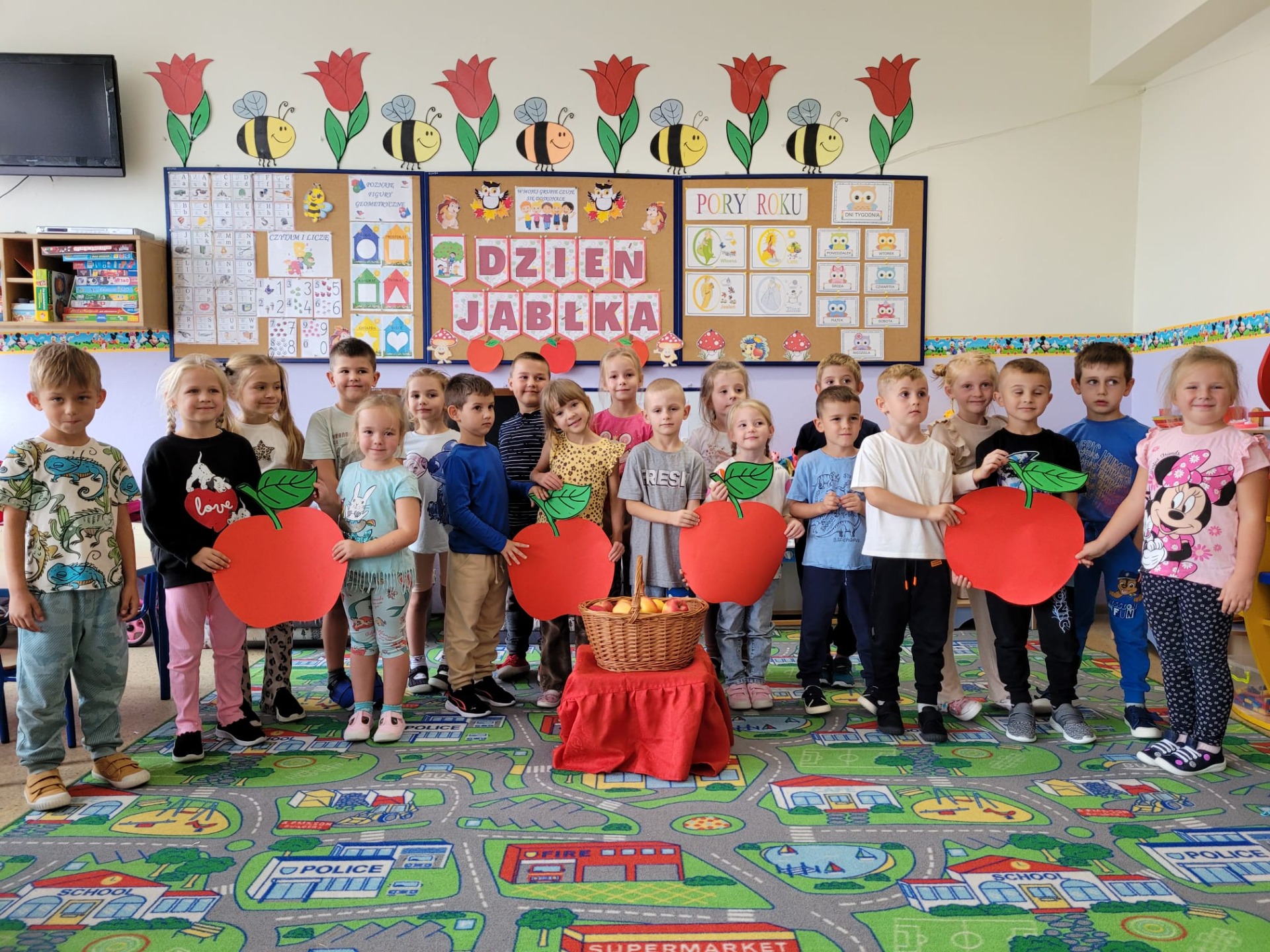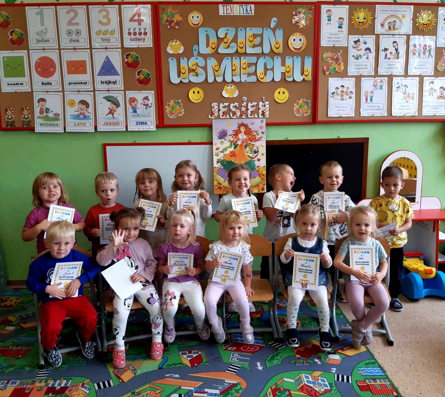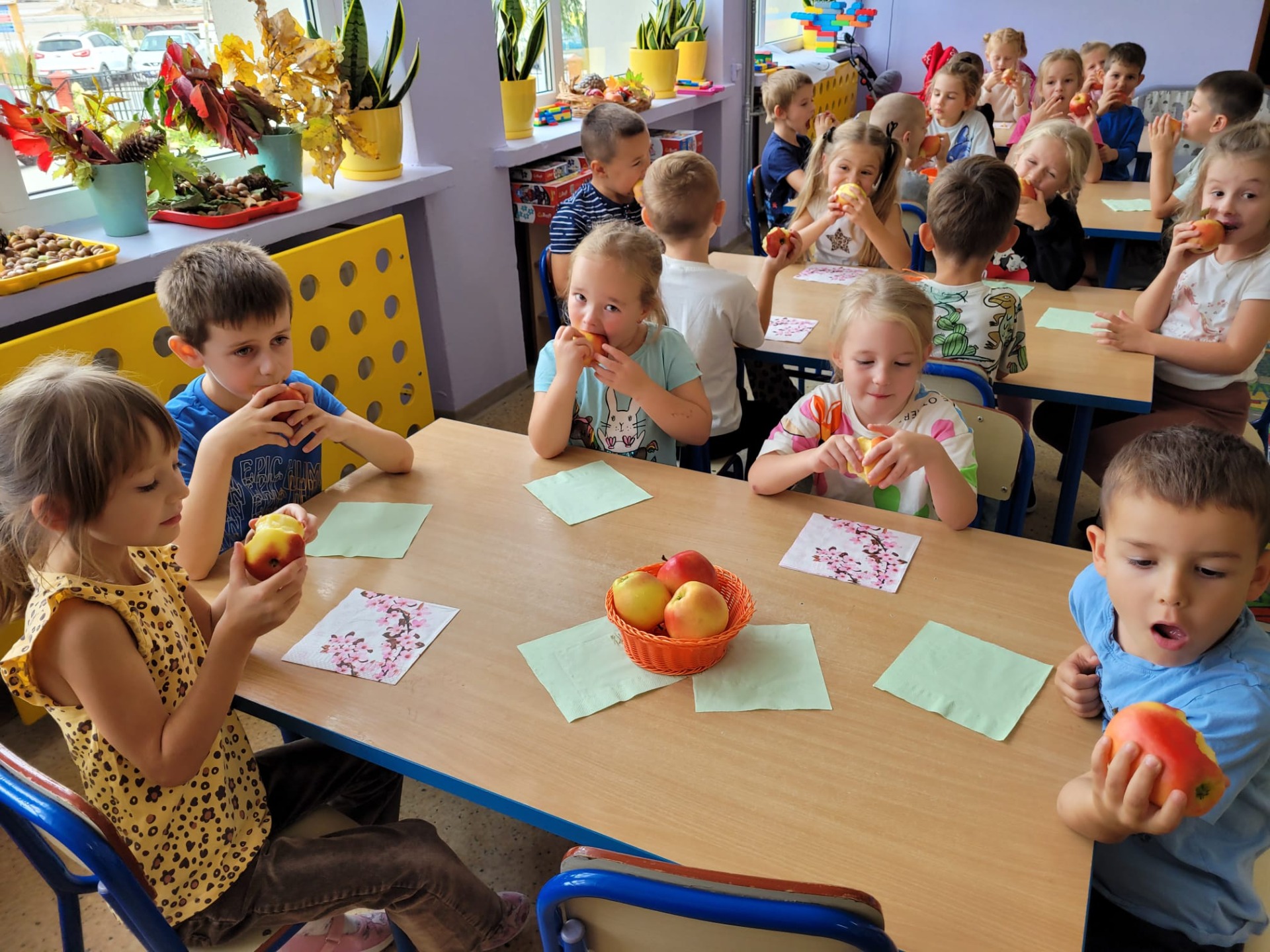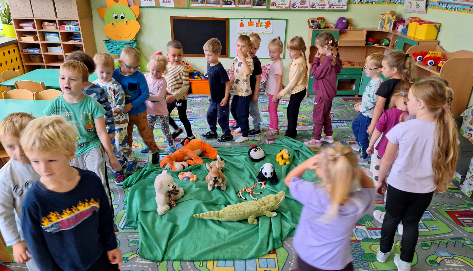Miesiąc październik, jak na czas jesienny przystało,obfitował w naszym przedszkolu w zajęcia o tematyce przyrodniczej. Przedszkolaki podczas codziennych zajęć wzbogacały swoją wiedzę i w sposób praktyczny badały świat zmieniającej się przyrody.W sali aktywnie uczestniczyły w ciekawych zajęciach z okazji Dnia Drzewa, następnie spacerowały po pobliskim lesie, by zetknąć się bezpośrednio z przyrodą i na swój sposób doświadczyć jak piękne i pożyteczne są drzewa. Kilka dni później świętowaliśmy Dzień Owoców i Warzyw.Tego dnia w każdej przedszkolnej sali można było usłyszeć wiersz Jana Brzechwy „Na straganie”.Przeprowadzone zajęcia miały na celu zwrócenie uwagi na walory zdrowotne owoców i warzyw ,przypomnienie dzieciom popularnych nazw owoców oraz zapoznanie z tymi mniej znanymi (np. brukselka, kalarepka).Atrakcję,piękny wygląd i zapach dał prawdziwy stragan ,który powstał ze świeżych owoców i warzyw.Przedszkolaki dowiedziały się ,że warzywa i owoce to bogactwo wielu witamin potrzebnych nam szczególnie przed zbliżającą się zimą. Podczas chłodu i zimna musimy dbać o siebie szczególnie ,ale nie możemy też zapominać o zwierzakach ,które często potrzebują naszej pomocy.Dlatego też w naszym przedszkolu zorganizowaliśmy Dzień Kundelka.Odbyły się zajęcia tematyczne dotyczące życia czworonogów,omówione zostały ich potrzeby ,zwyczaje i upodobania.Szczególną uwagę zwrócono na zapewnienie schronienia i pożywienia zwłaszcza tym porzuconym… Kształtując u naszych przedszkolaków wrażliwość i empatię związaną z losem bezdomnych zwierząt,dzieci włączyły się w akcję na rzecz pomocy bezdomnym zwierzętom.Dzięki tym zajęciom i tej inicjatywie przedszkolaki wiedzą, że zwierzętom należy pomagać i nie wolno ich krzywdzić.