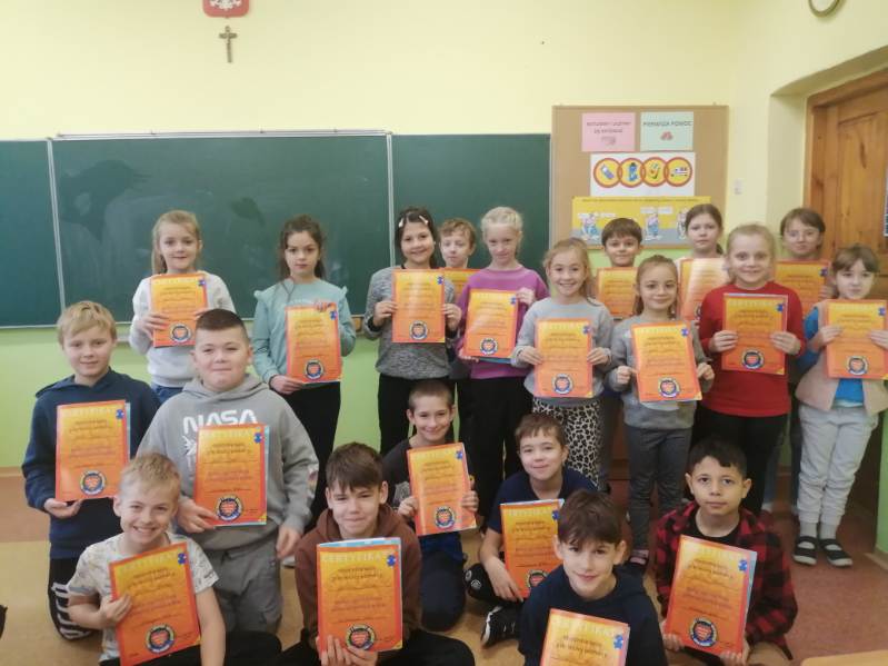W klasie III ZS w Lipie zostały przeprowadzone zajęcia z zakresu udzielania pierwszej pomocy . W dniach 26.11.24 – 29.11.24 odbyły się lekcje , podczas których uczniowie w sposób aktywny i urozmaicony zapoznali się z zasadami zachowania i udzielania pierwszej pomocy osobie poszkodowanej. Podczas zajęć odbyła się projekcja filmu edukacyjnego, na podstawie którego zostały przybliżone uczniom metody udzielania pierwszej pomocy. Przypomniano i utrwalono numery służb ratowniczych. Dzieci wykonały modele telefonów, za pomocą których w formie zabawy ćwiczyły wzywanie pogotowia. Ratowanie życia , to przede wszystkim działanie praktyczne. Po zapoznaniu się z kolejnymi etapami wzywania pomocy, oceny sytuacji i stanu osoby poszkodowanej, uczniowie wykonywali ćwiczenia praktyczne w zakresie : obserwacja oddechu poszkodowanego, ułożenie w pozycji bocznej ustalonej, oraz wykonanie oddechów ratowniczych na fantomie. Dla utrwalenia zdobytej wiedzy ,dzieci kolorowały historyjkę obrazkową prezentującą Łańcuch Przeżycia, oraz etapy postępowania podczas udzielania pierwszej pomocy. W klasie wykonano gazetkę tematyczną . Na ostatnich zajęciach zdobyte wiadomości i umiejętności zostały podsumowane i sprawdzone w formie mini testu. Wszyscy uczestnicy zajęć bardzo dobrze poradzili sobie z ćwiczeniami praktycznymi i odpowiedzieli na zawarte w teście pytania. Na zakończenie dzieci otrzymały ,,Certyfikaty ukończenia kursu pierwszej pomocy”, oraz książki które pomogą utrwalić zdobytą wiedzę. Zajęcia przeprowadziła : wychowawca Beata Chmielewska