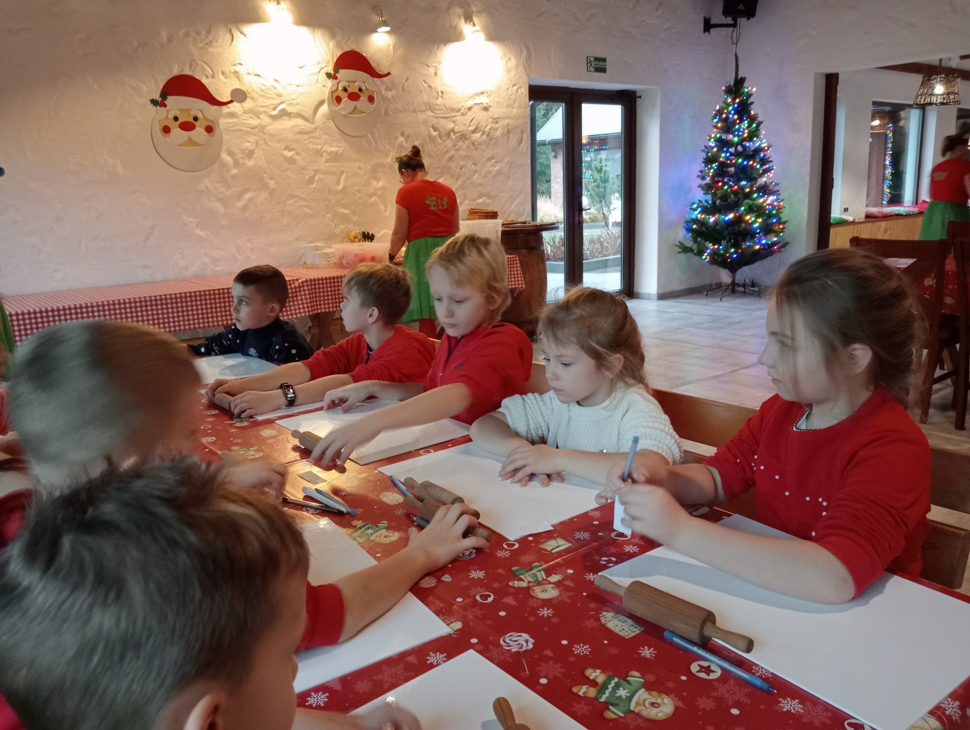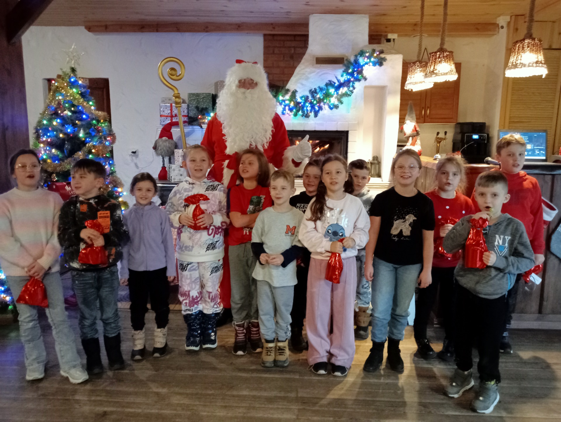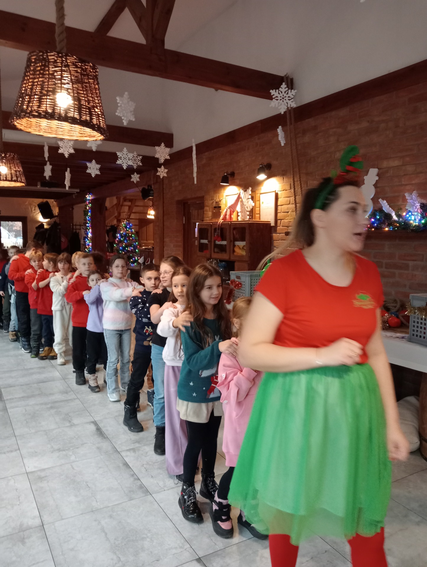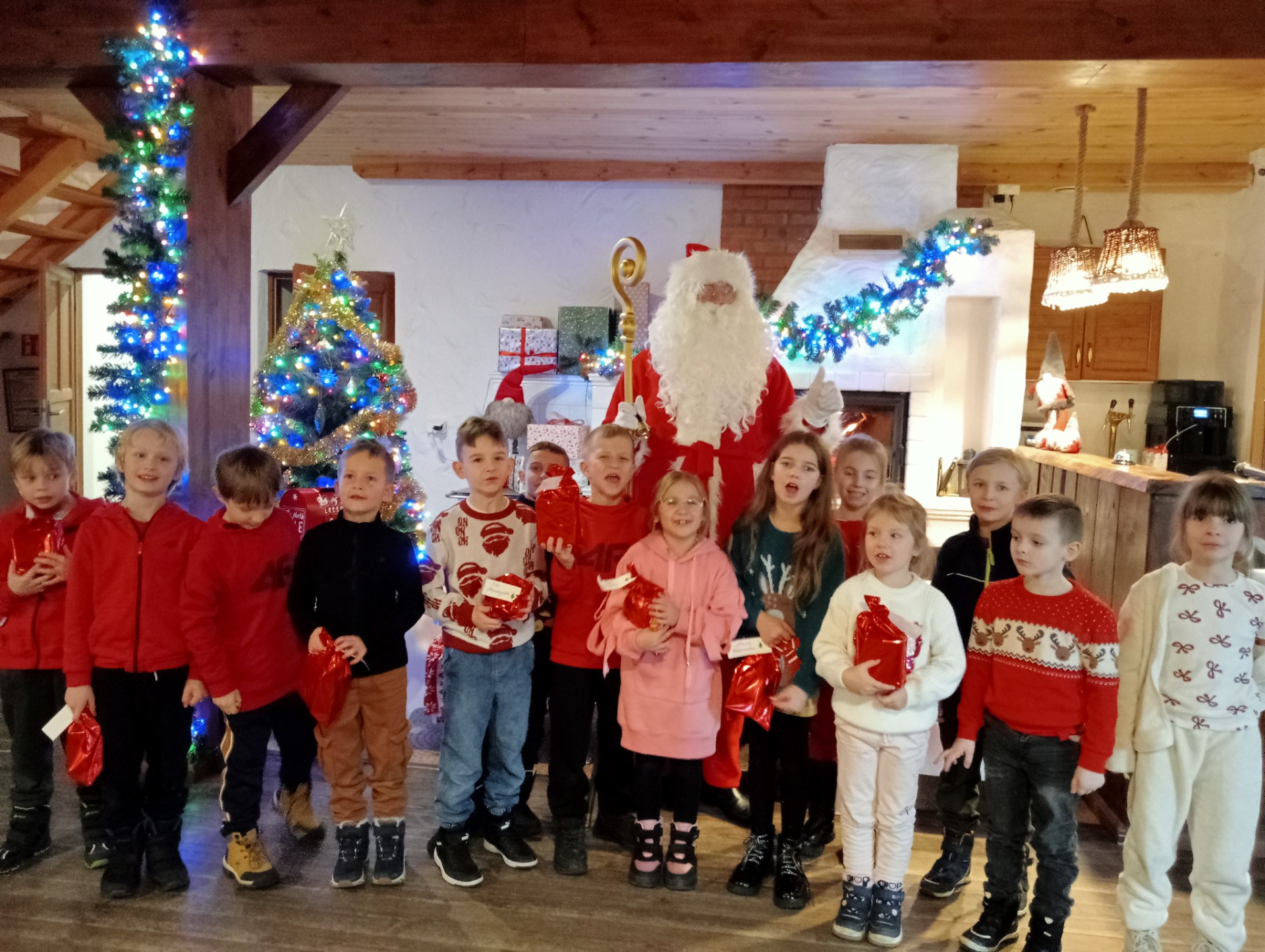 16 grudnia 2024r. uczniowie klasy 1a i 1 b odwiedzili Osadę Leśną Doboszówka, która obecnie zamieniła się w Wioskę Świętego Mikołaja. Po przybyciu na miejsce czekało na nas dużo atrakcji. Każde dziecko miało okazję wykonać świąteczne pierniczki, a po upieczeniu ozdobić je lukrem i bakaliami. Podczas warsztatów plastycznych tworzyliśmy ozdoby choinkowe – pawie oczka i łańcuch. Było też wspólne kolędowanie i nauka piosenki o Mikołaju. Z wielkim zaangażowaniem wszyscy brali udział w zabawach ruchowych przy muzyce oraz zajęciach z elementami współzawodnictwa. Prowadzone przez Śnieżynkę zajęcia były okazją do poznania przez dzieci tradycji związanych z Bożym Narodzeniem. Ogromną radość sprawił dzieciom Mikołaj, który wręczył wszystkim prezenty. Była również wizyta w mini zoo i karmienie mieszkających tam zwierząt. To był dzień pełen wrażeń.