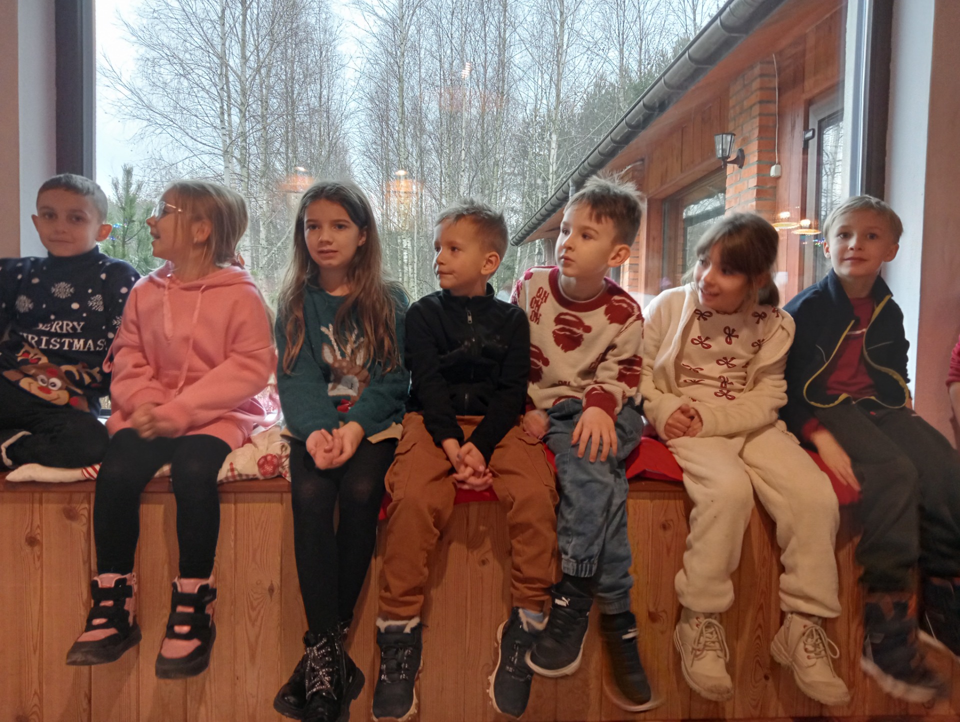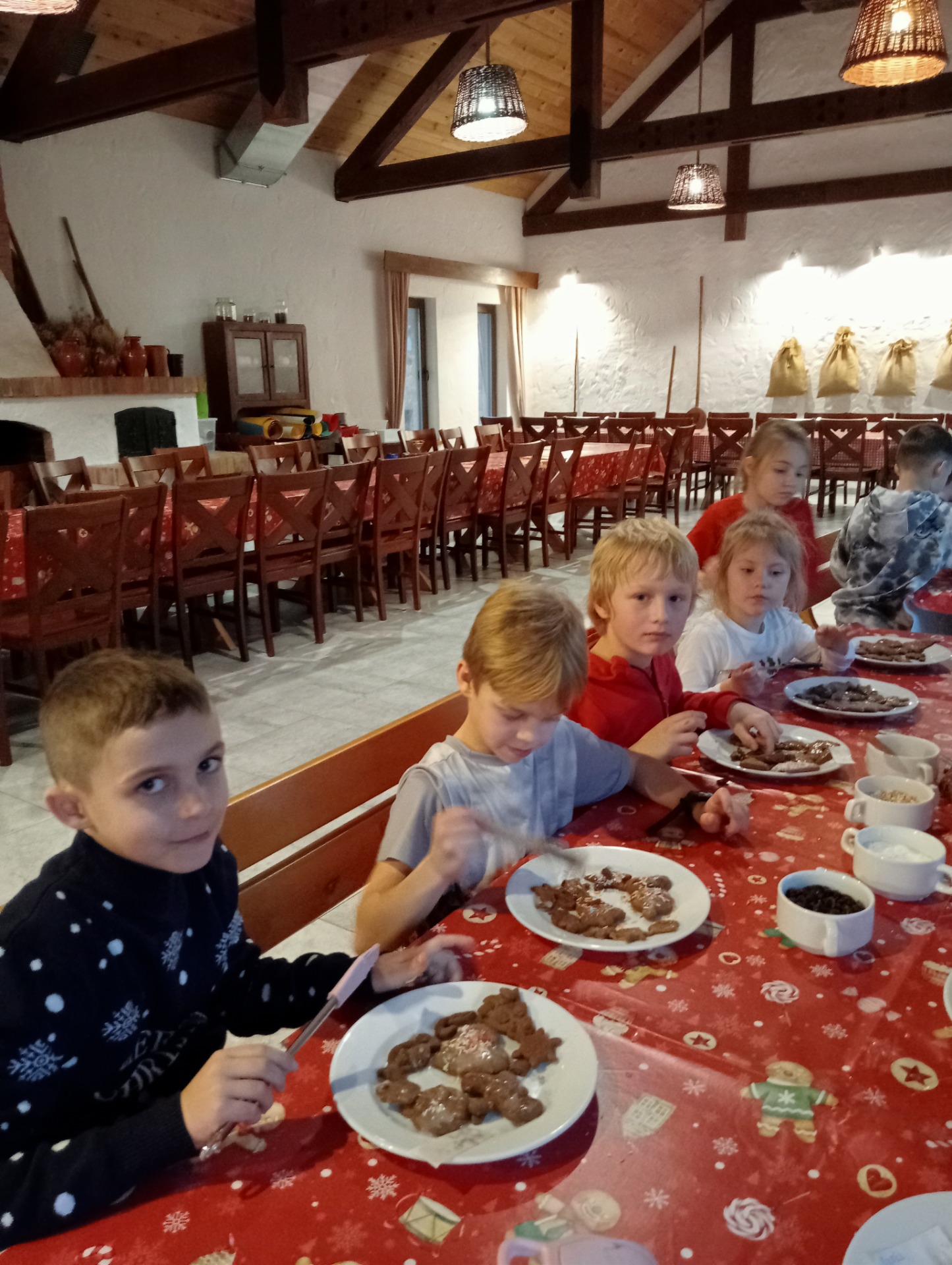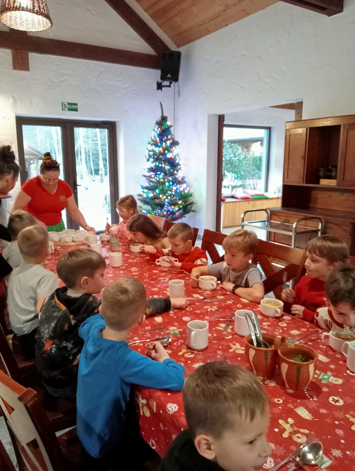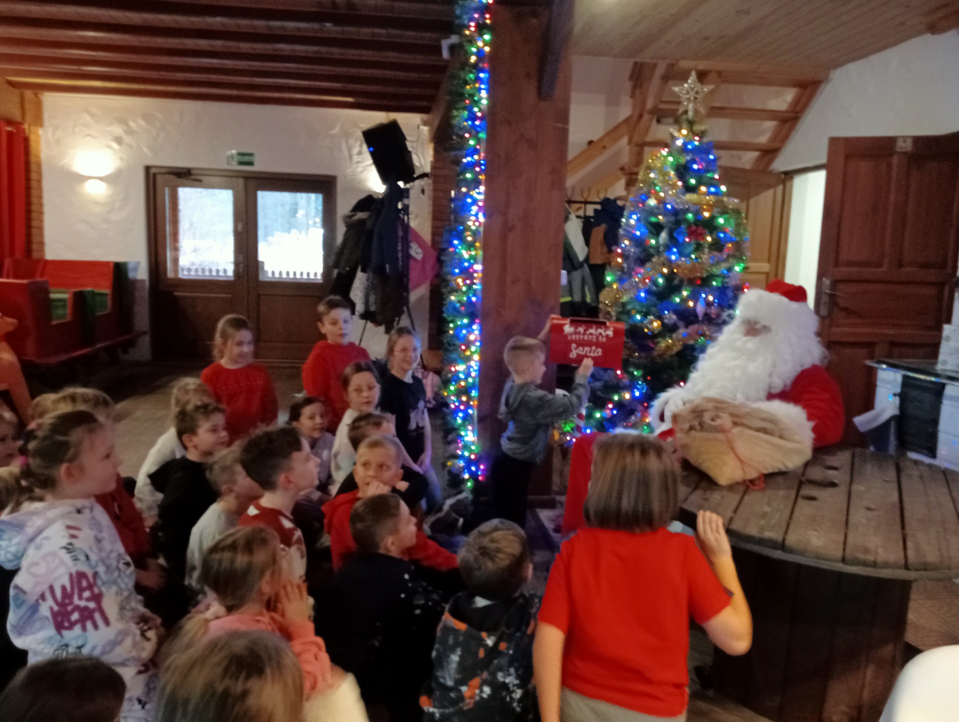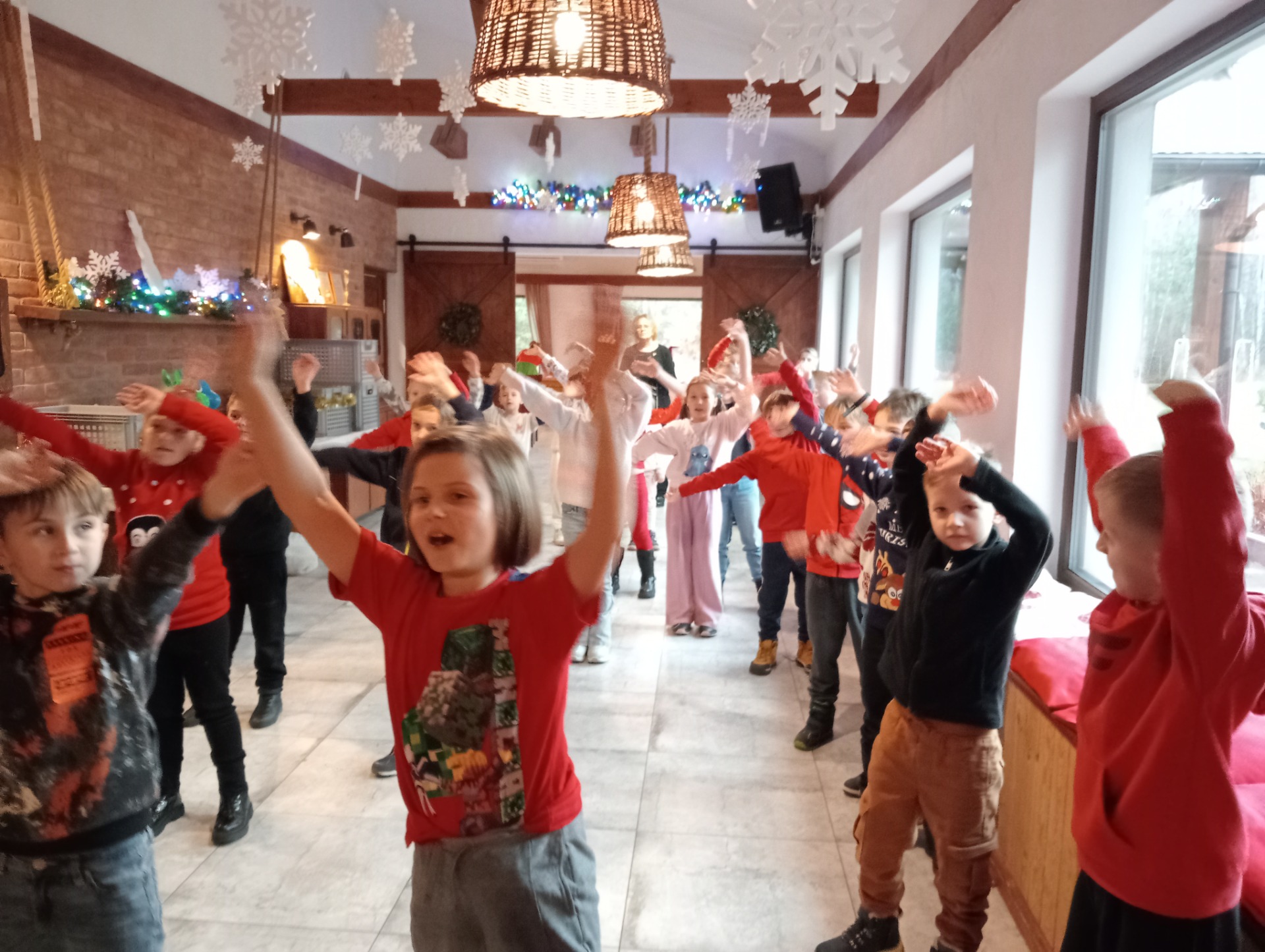 16 grudnia 2024r. uczniowie klasy 1a i 1 b odwiedzili Osadę Leśną Doboszówka, która obecnie zamieniła się w Wioskę Świętego Mikołaja. Po przybyciu na miejsce czekało na nas dużo atrakcji. Każde dziecko miało okazję wykonać świąteczne pierniczki, a po upieczeniu ozdobić je lukrem i bakaliami. Podczas warsztatów plastycznych tworzyliśmy ozdoby choinkowe – pawie oczka i łańcuch. Było też wspólne kolędowanie i nauka piosenki o Mikołaju. Z wielkim zaangażowaniem wszyscy brali udział w zabawach ruchowych przy muzyce oraz zajęciach z elementami współzawodnictwa. Prowadzone przez Śnieżynkę zajęcia były okazją do poznania przez dzieci tradycji związanych z Bożym Narodzeniem. Ogromną radość sprawił dzieciom Mikołaj, który wręczył wszystkim prezenty. Była również wizyta w mini zoo i karmienie mieszkających tam zwierząt. To był dzień pełen wrażeń.