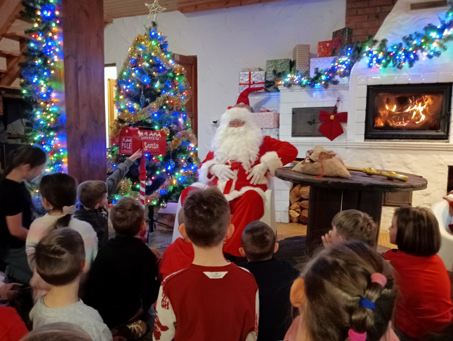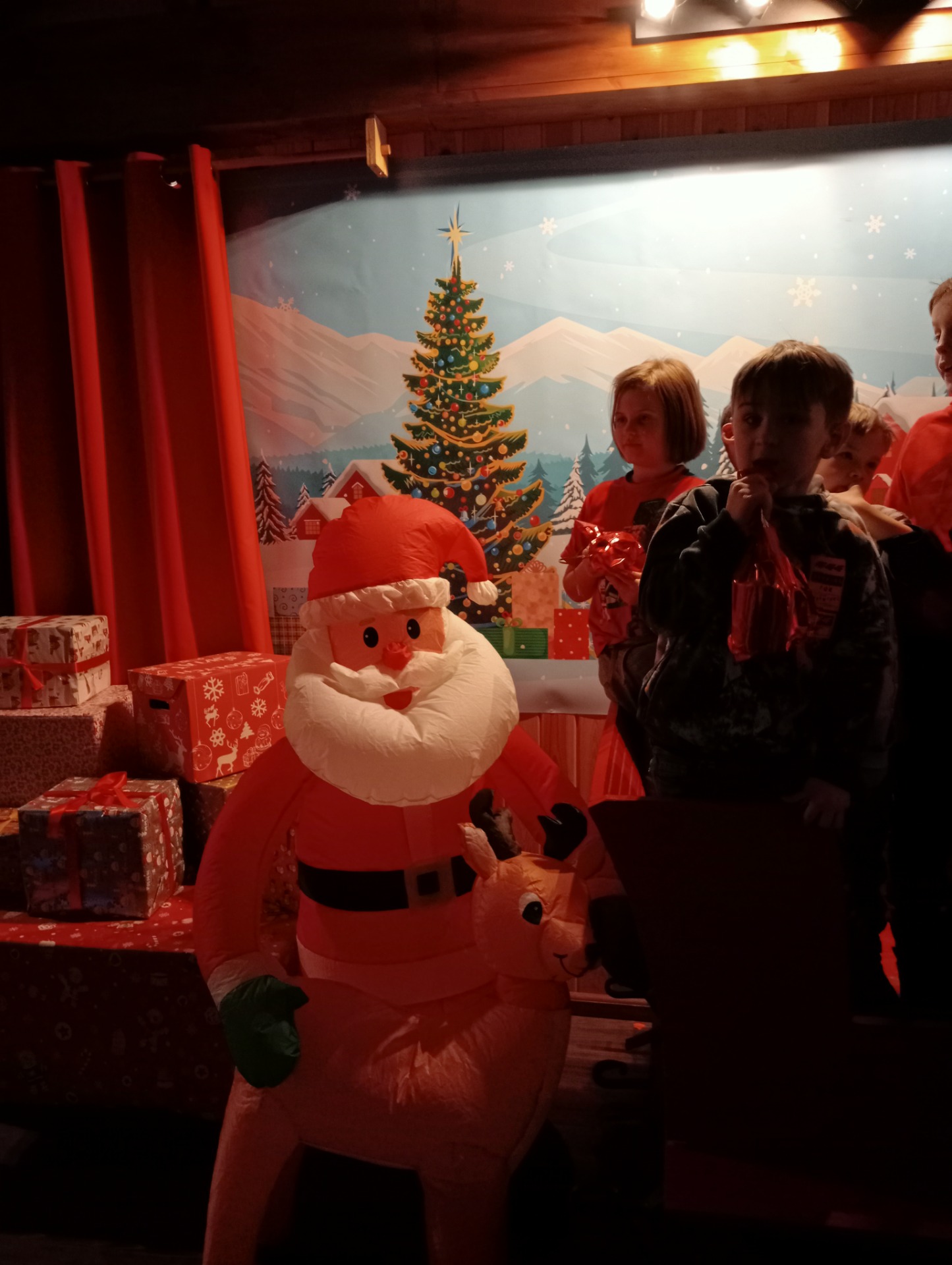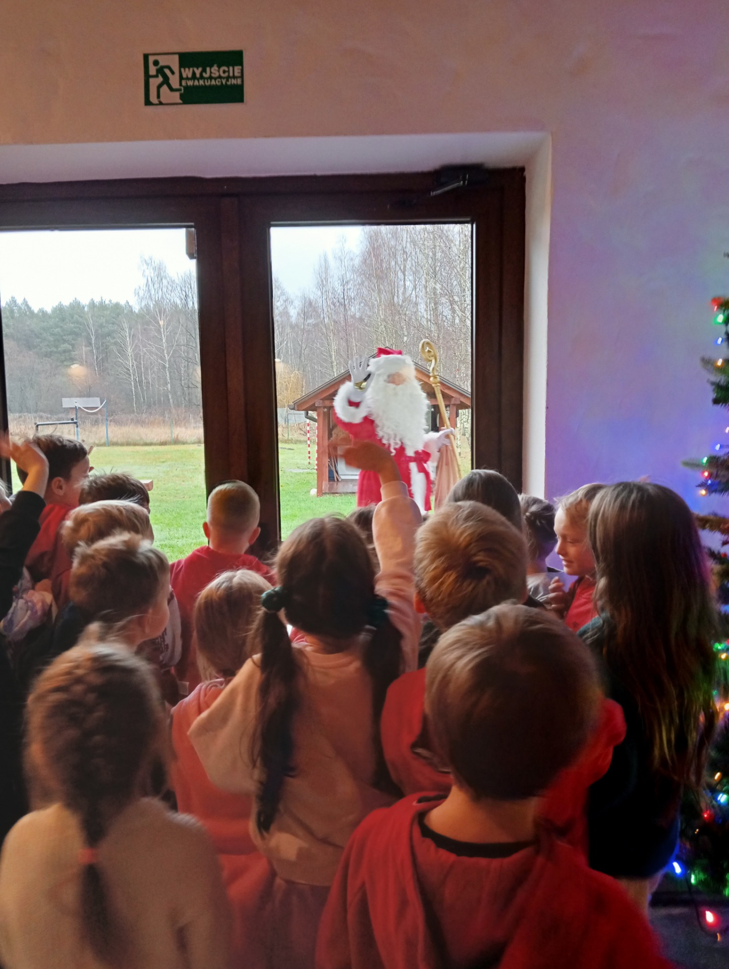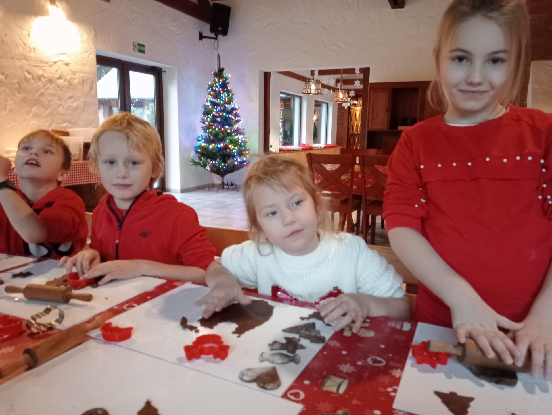 16 grudnia 2024r. uczniowie klasy 1a i 1 b odwiedzili Osadę Leśną Doboszówka, która obecnie zamieniła się w Wioskę Świętego Mikołaja. Po przybyciu na miejsce czekało na nas dużo atrakcji. Każde dziecko miało okazję wykonać świąteczne pierniczki, a po upieczeniu ozdobić je lukrem i bakaliami. Podczas warsztatów plastycznych tworzyliśmy ozdoby choinkowe – pawie oczka i łańcuch. Było też wspólne kolędowanie i nauka piosenki o Mikołaju. Z wielkim zaangażowaniem wszyscy brali udział w zabawach ruchowych przy muzyce oraz zajęciach z elementami współzawodnictwa. Prowadzone przez Śnieżynkę zajęcia były okazją do poznania przez dzieci tradycji związanych z Bożym Narodzeniem. Ogromną radość sprawił dzieciom Mikołaj, który wręczył wszystkim prezenty. Była również wizyta w mini zoo i karmienie mieszkających tam zwierząt. To był dzień pełen wrażeń.
