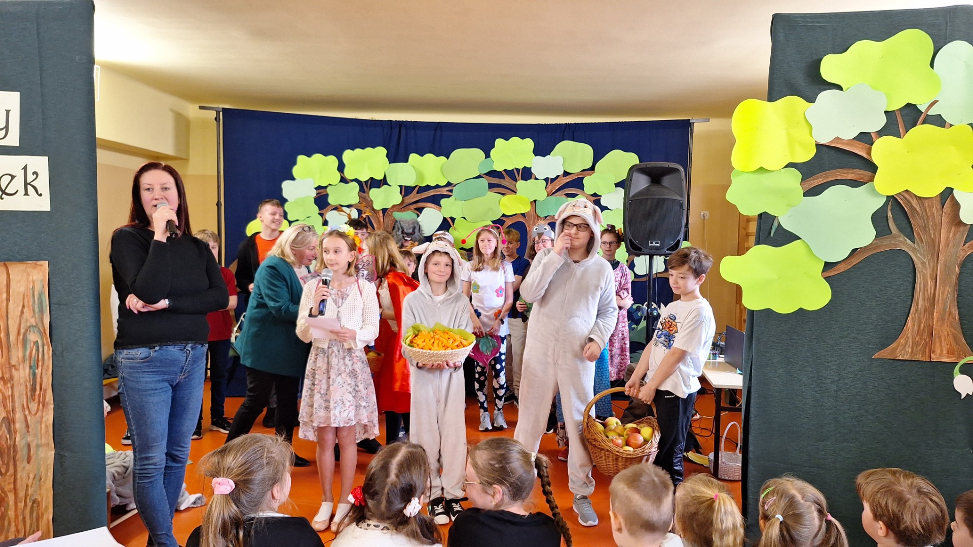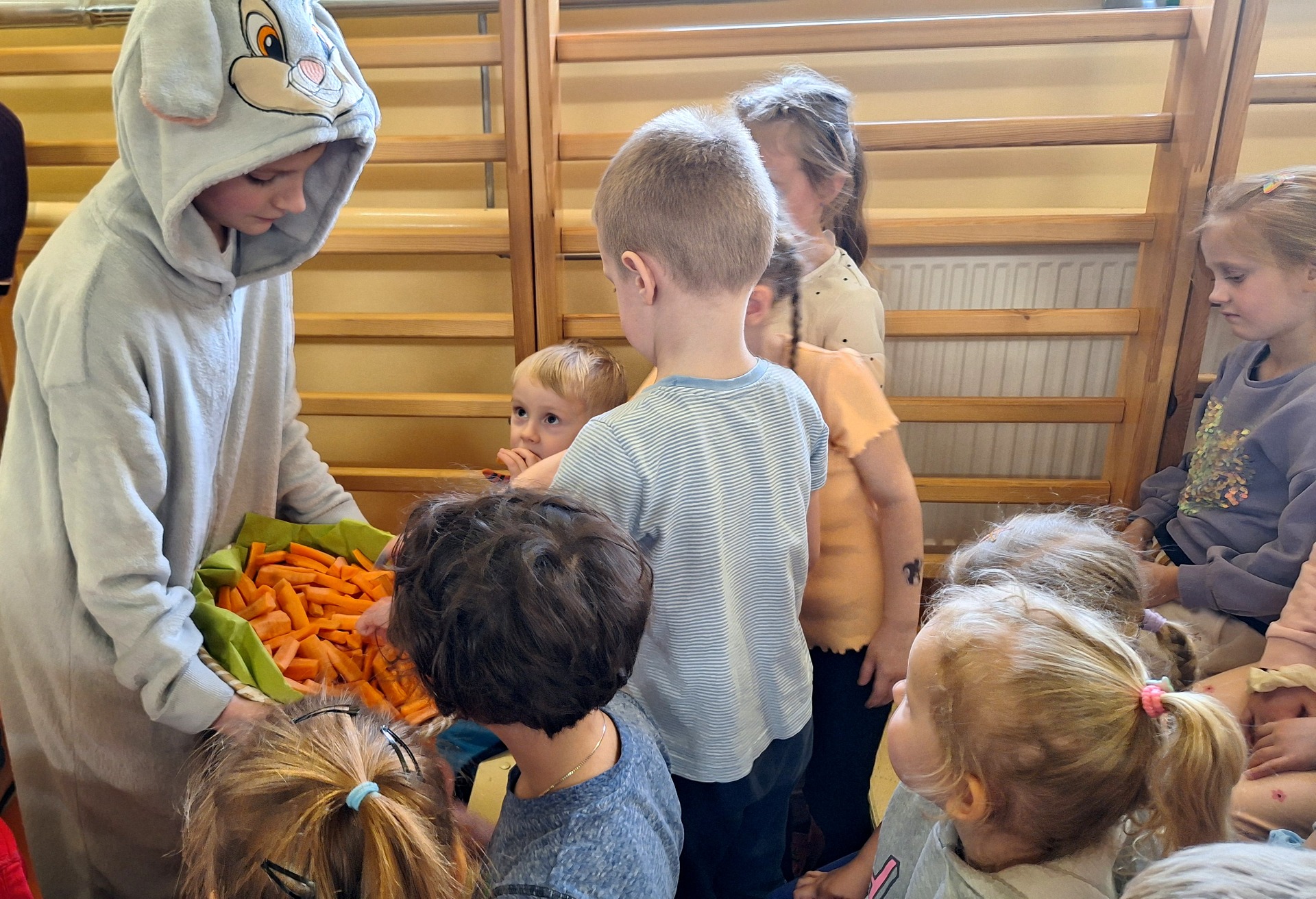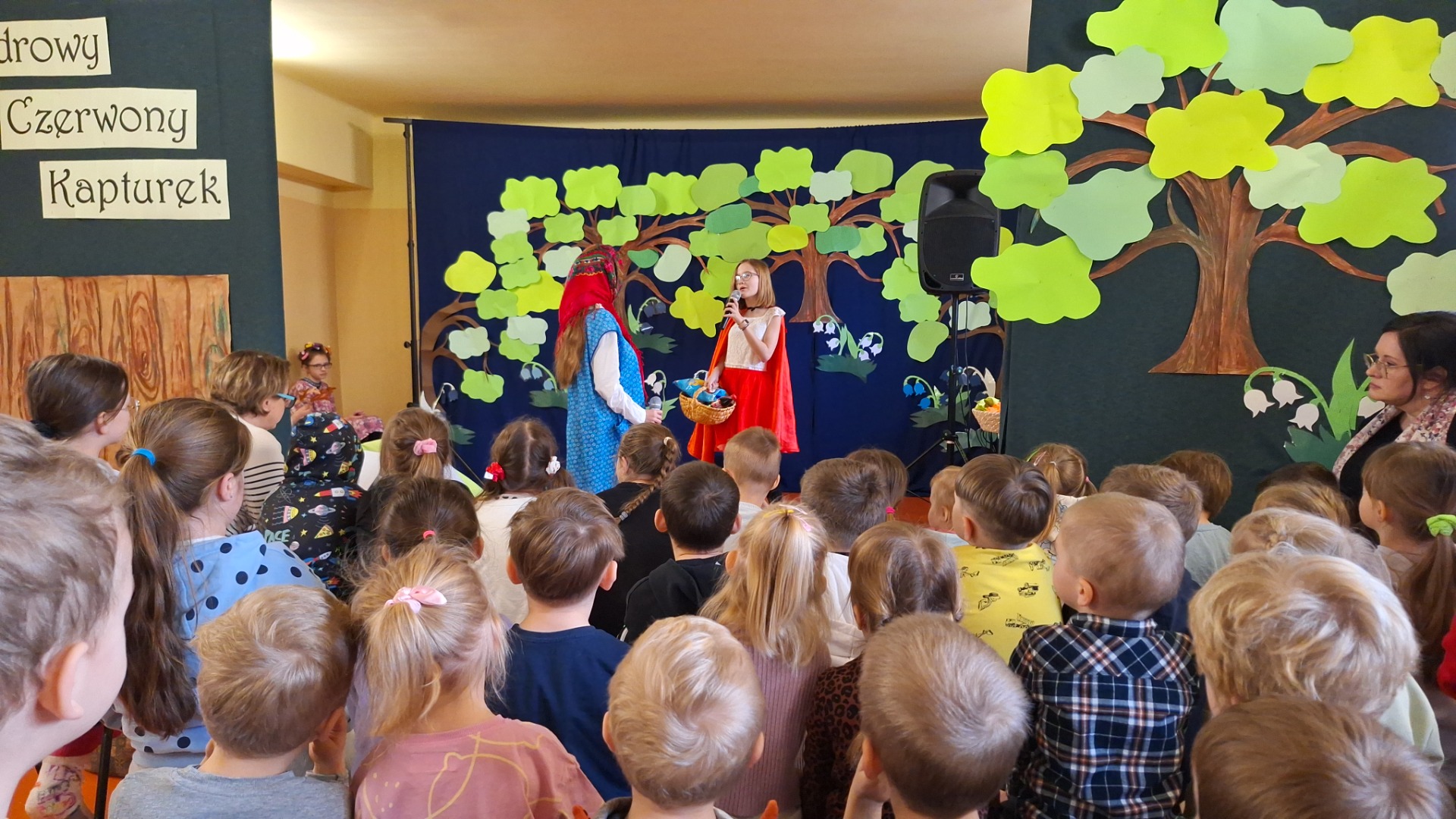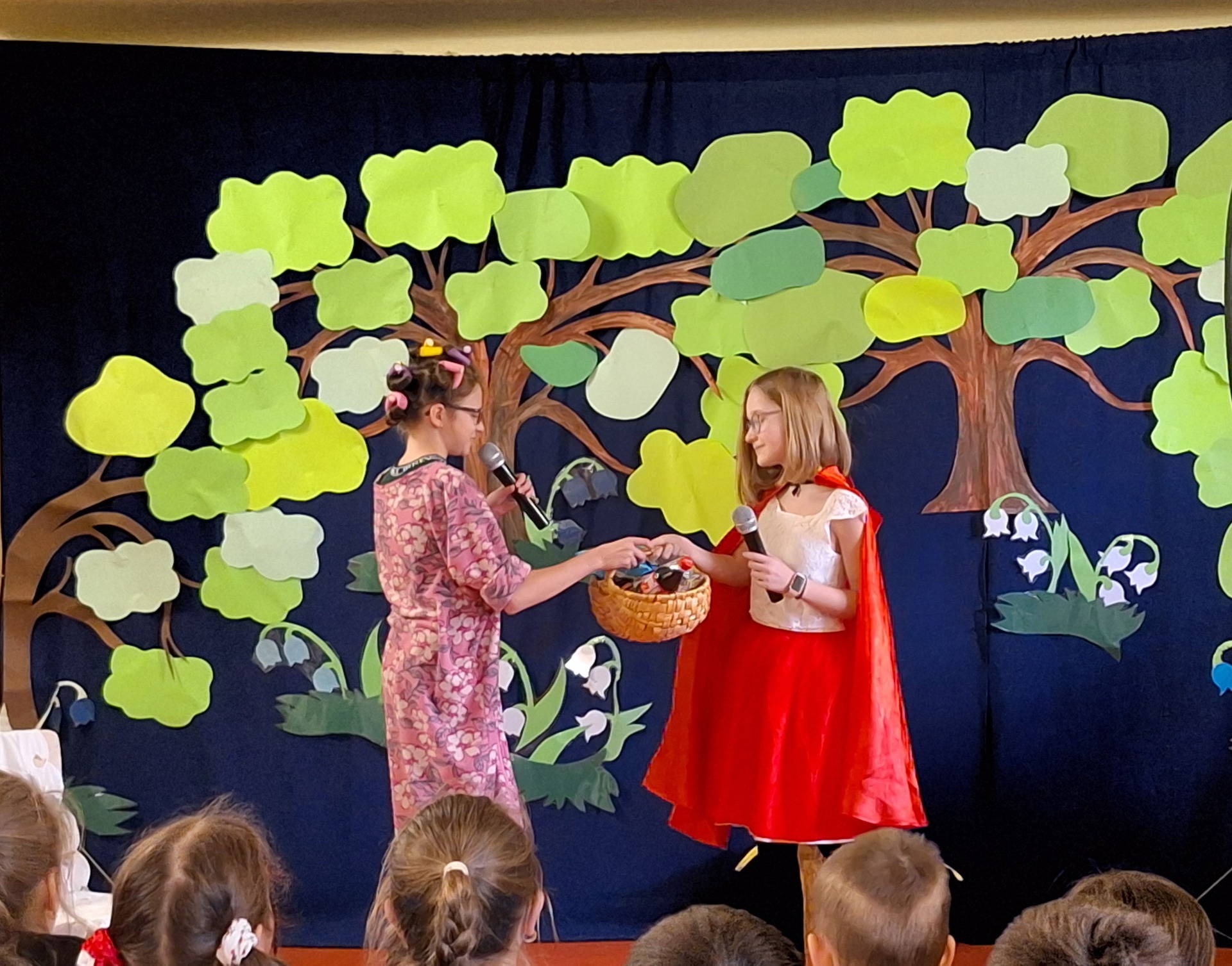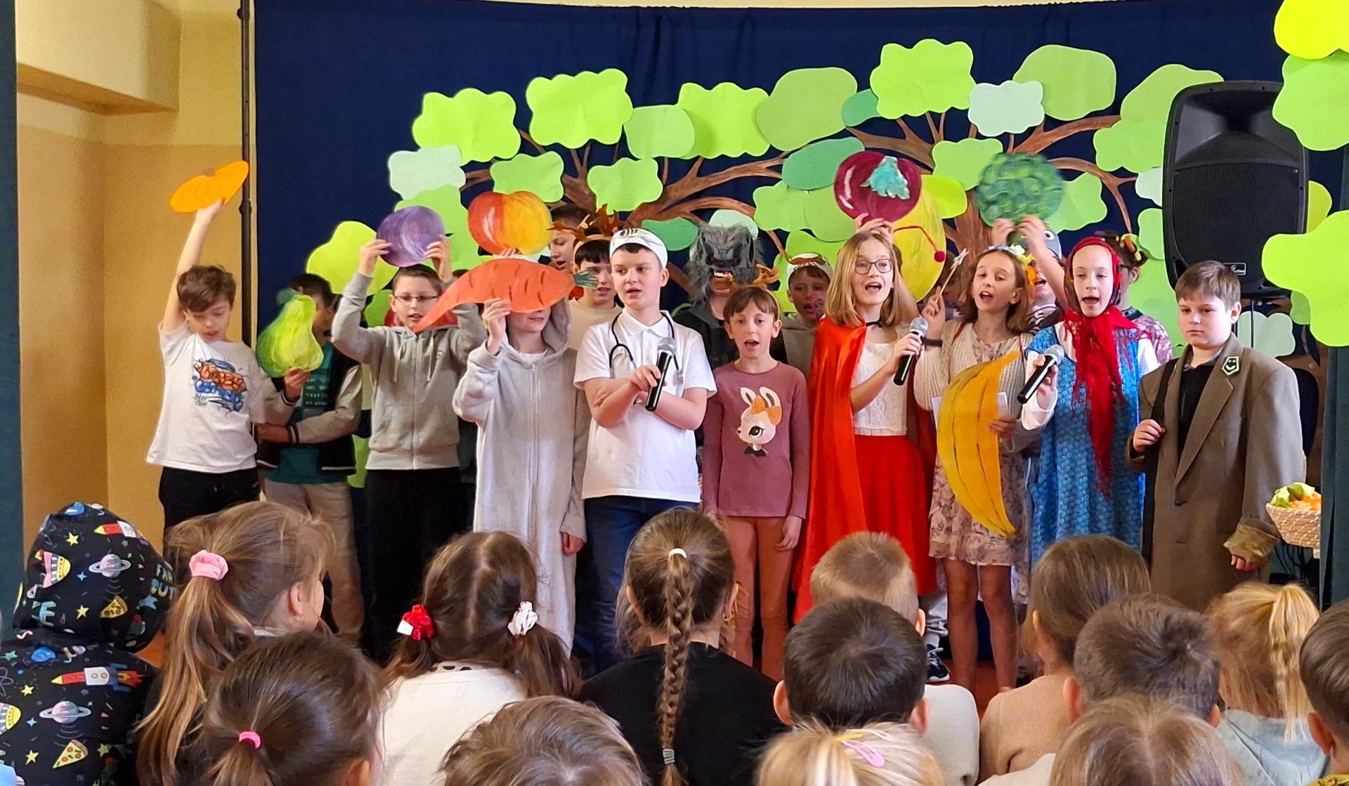 Dnia 14 marca 2025 roku uczniowie klasy V pod opieką p. Teresy Skrzypek i Małgorzaty Trela zaprezentowali przedstawienie promujące zdrowy styl życia pt. „Zdrowy Czerwony Kapturek”. Główni bohaterowie Wilk i Babcia stworzyli spółkę jedząc jedzenie, które przynosił im Czerwony Kapturek. Czerwony Kapturek przynosił im: boczek kiełbasę, chipsy, słodycze i słodkie napoje. Przez takie jedzenie babcię bolał brzuch a wilk był bardzo gruby. Na szczęście lekarz Ojnieboli zalecił babci i wilkowi dietę i wszystko wróciło do normy. Babcia i wilk obiecali, że będą jeść tylko zdrowe pokarmy. Uczniowie w humorystyczny i zabawny sposób zaprezentowali jak należy postępować, aby być zdrowym i sprawnym fizycznie. Poradzili, jakie powinno się spożywać pokarmy a jakich nie. Ważne, aby nie jeść nadmiernych ilości słodyczy, tłuszczy słodkich i gazowanych napojów, nie palić papierosów i nie pić alkoholu oraz napojów energetycznych. Obowiązkowo należy uprawiać różne sporty i przebywać długo na świeżym powietrzu. Na koniec wszyscy uczestnicy apelu zostali poczęstowani przez króliki świeżą marchewką i jabłkiem. Przedstawienie przeplatane wieloma piosenkami, radami i quizem wiedzy o zdrowym stylu życia bardzo się wszystkim podobało o czym świadczyły liczne brawa. Mamy nadzieję, że będzie miało wpływ na nasze postępowanie żywieniowe.