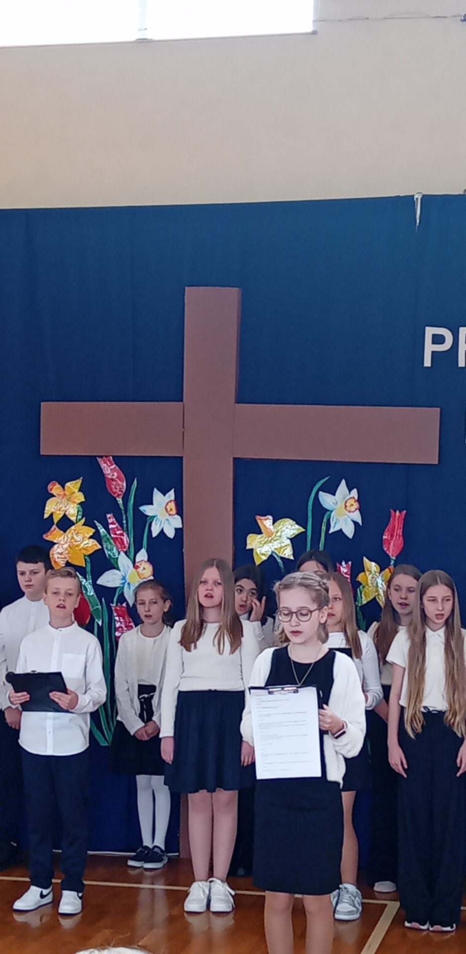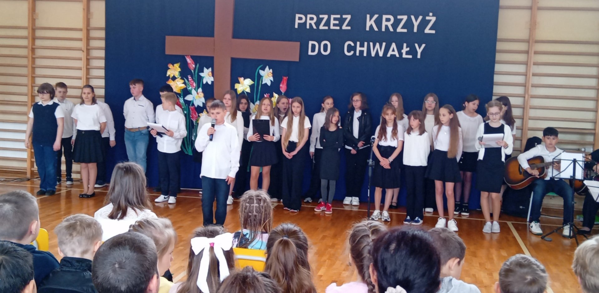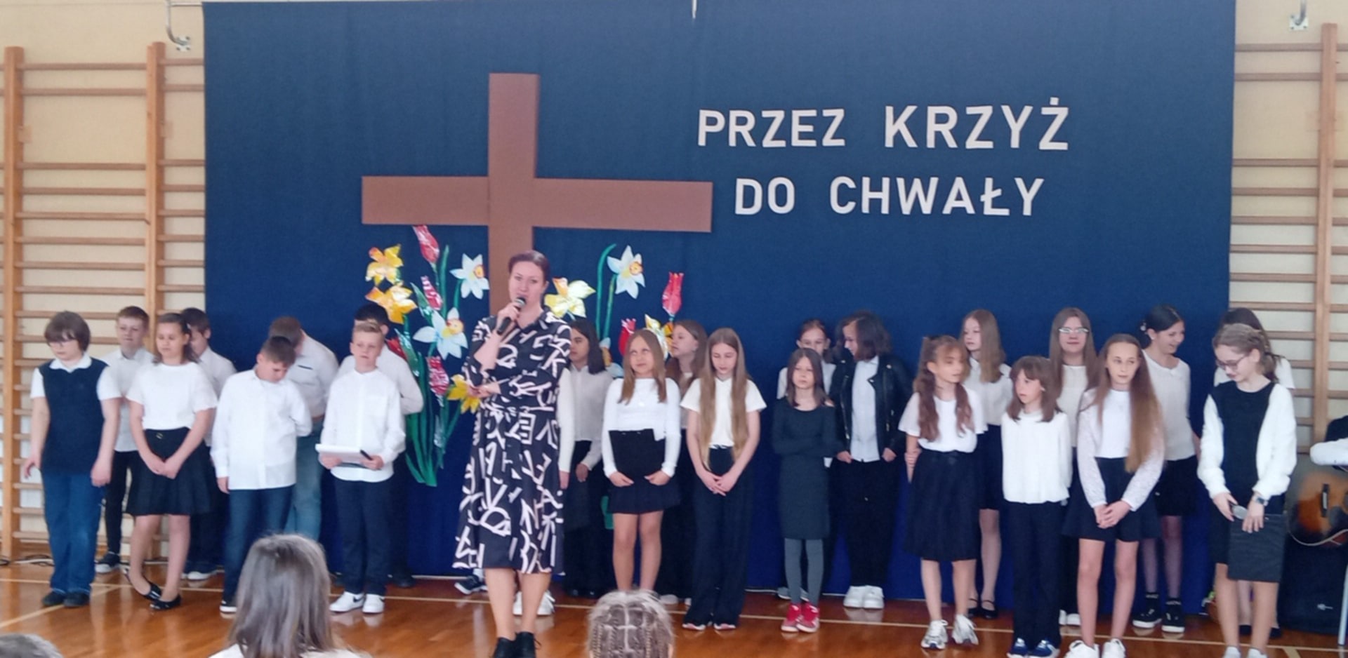 Zgodnie ze szkolnym zwyczajem, zanim udamy się na wiosenną przerwę świąteczną w okresie Wielkanocy, przygotowujemy nastrojową uroczystość wprowadzającą w klimat Zmartwychwstania Pańskiego, co też miało miejsce w Wielką Środę, 16 kwietnia. Wzruszający montaż słowno – muzyczny przygotowany przez uczniów klasy 4 i 5, skupił społeczność szkolną na sali gimnastycznej w scenerii brązowego krzyża. W atmosferze powagi, a także radości ze Zmartwychwstania Pańskiego, zgromadzeni mieli okazję snuć rozważania nad życiem płynące z prawdy i ofiary Krzyża. Życzenia od Pani dyrektor Iwony Stryjeckiej – Pezda oraz ks. Marka Olszewskiego skierowane do zebranych i ich rodzin dopełniły ceremoniału przedświątecznych obchodów Wielkiej Nocy. Życzymy wszystkim radosnych Świąt Wielkanocnych: „Jezus zwyciężył, to wykonało się!.. Alleluja! Teresa Skrzypek, Beata Dziurda