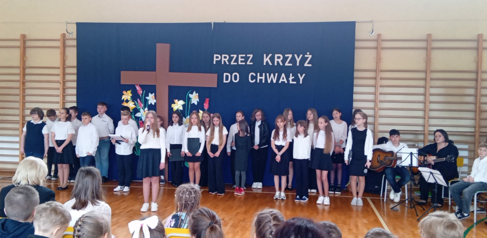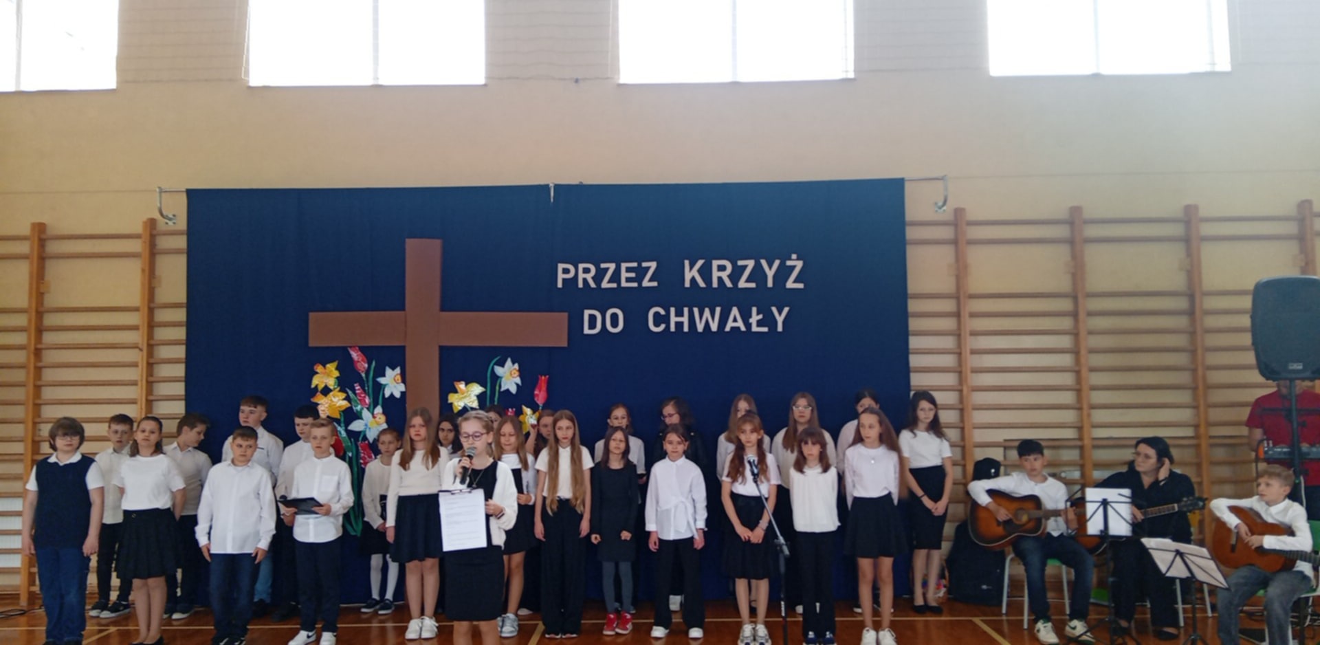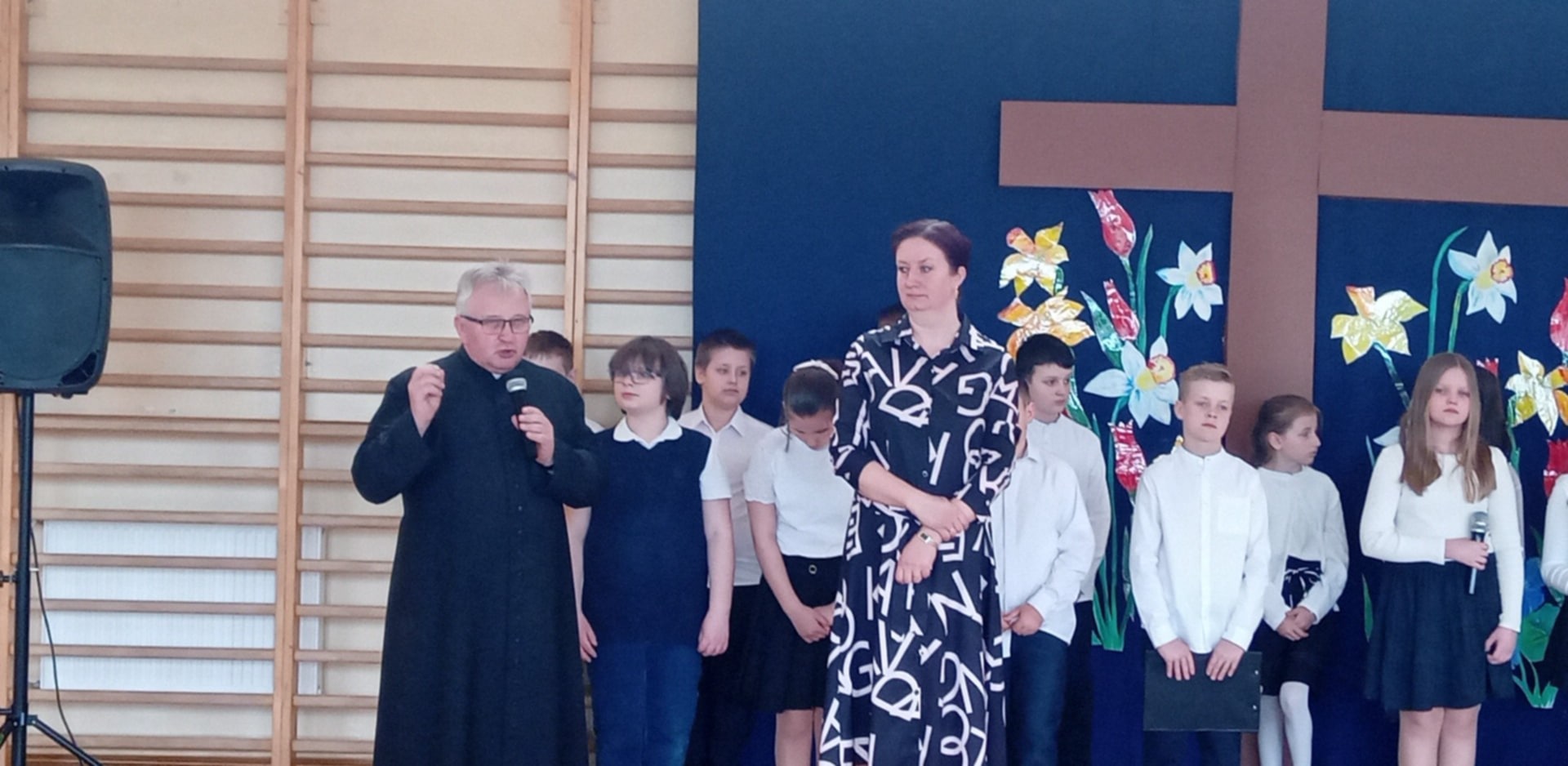 Zgodnie ze szkolnym zwyczajem, zanim udamy się na wiosenną przerwę świąteczną w okresie Wielkanocy, przygotowujemy nastrojową uroczystość wprowadzającą w klimat Zmartwychwstania Pańskiego, co też miało miejsce w Wielką Środę, 16 kwietnia. Wzruszający montaż słowno – muzyczny przygotowany przez uczniów klasy 4 i 5, skupił społeczność szkolną na sali gimnastycznej w scenerii brązowego krzyża. W atmosferze powagi, a także radości ze Zmartwychwstania Pańskiego, zgromadzeni mieli okazję snuć rozważania nad życiem płynące z prawdy i ofiary Krzyża. Życzenia od Pani dyrektor Iwony Stryjeckiej – Pezda oraz ks. Marka Olszewskiego skierowane do zebranych i ich rodzin dopełniły ceremoniału przedświątecznych obchodów Wielkiej Nocy. Życzymy wszystkim radosnych Świąt Wielkanocnych: „Jezus zwyciężył, to wykonało się!.. Alleluja! Teresa Skrzypek, Beata Dziurda