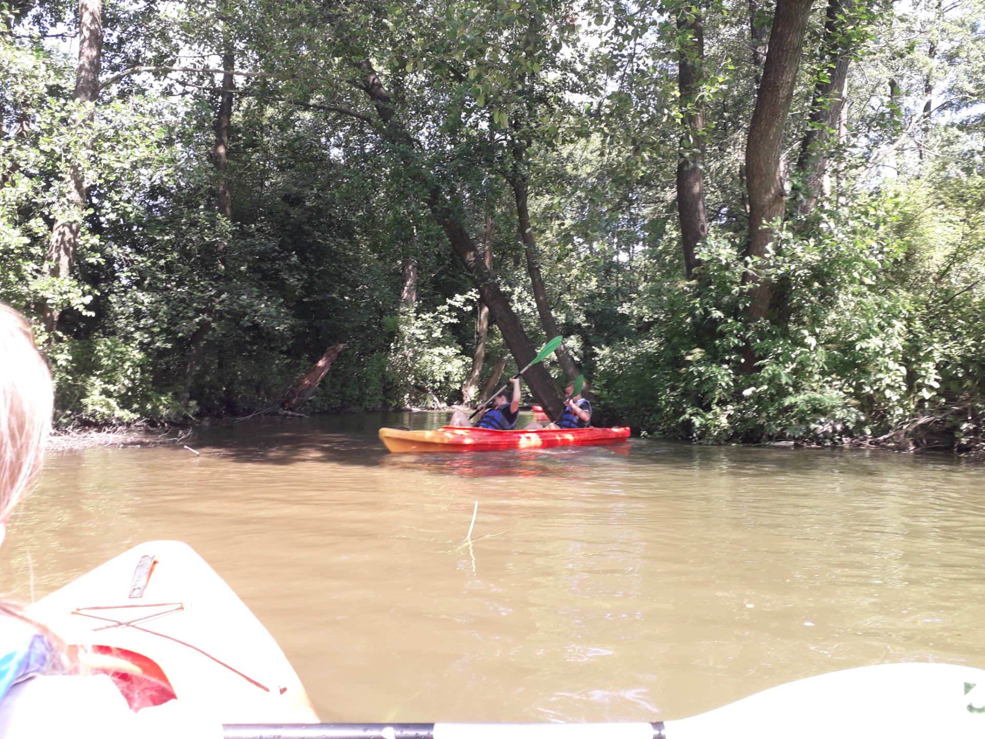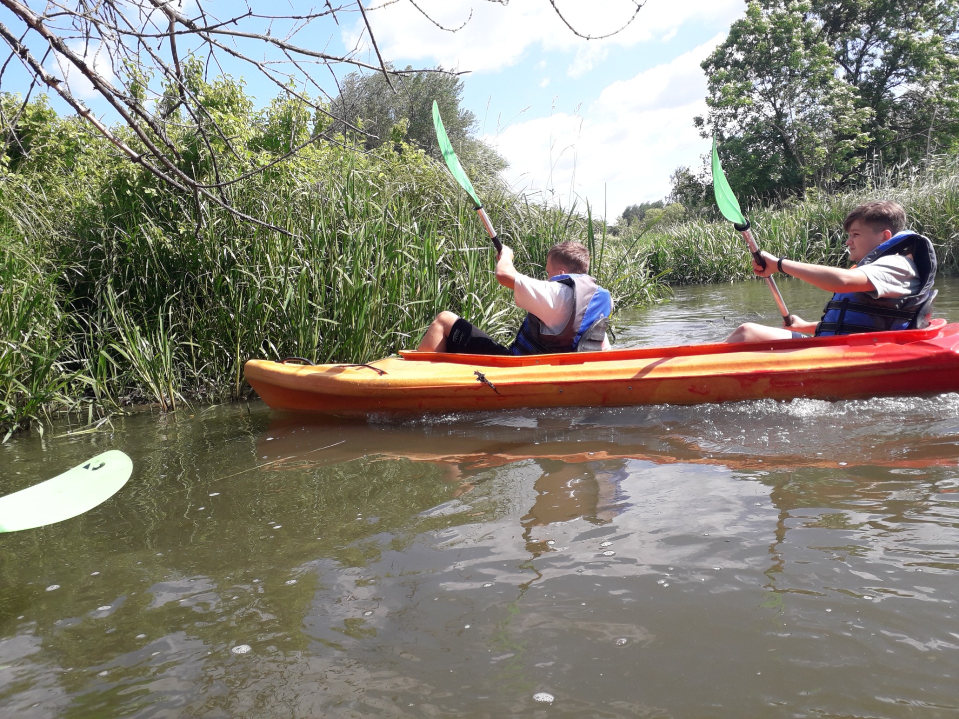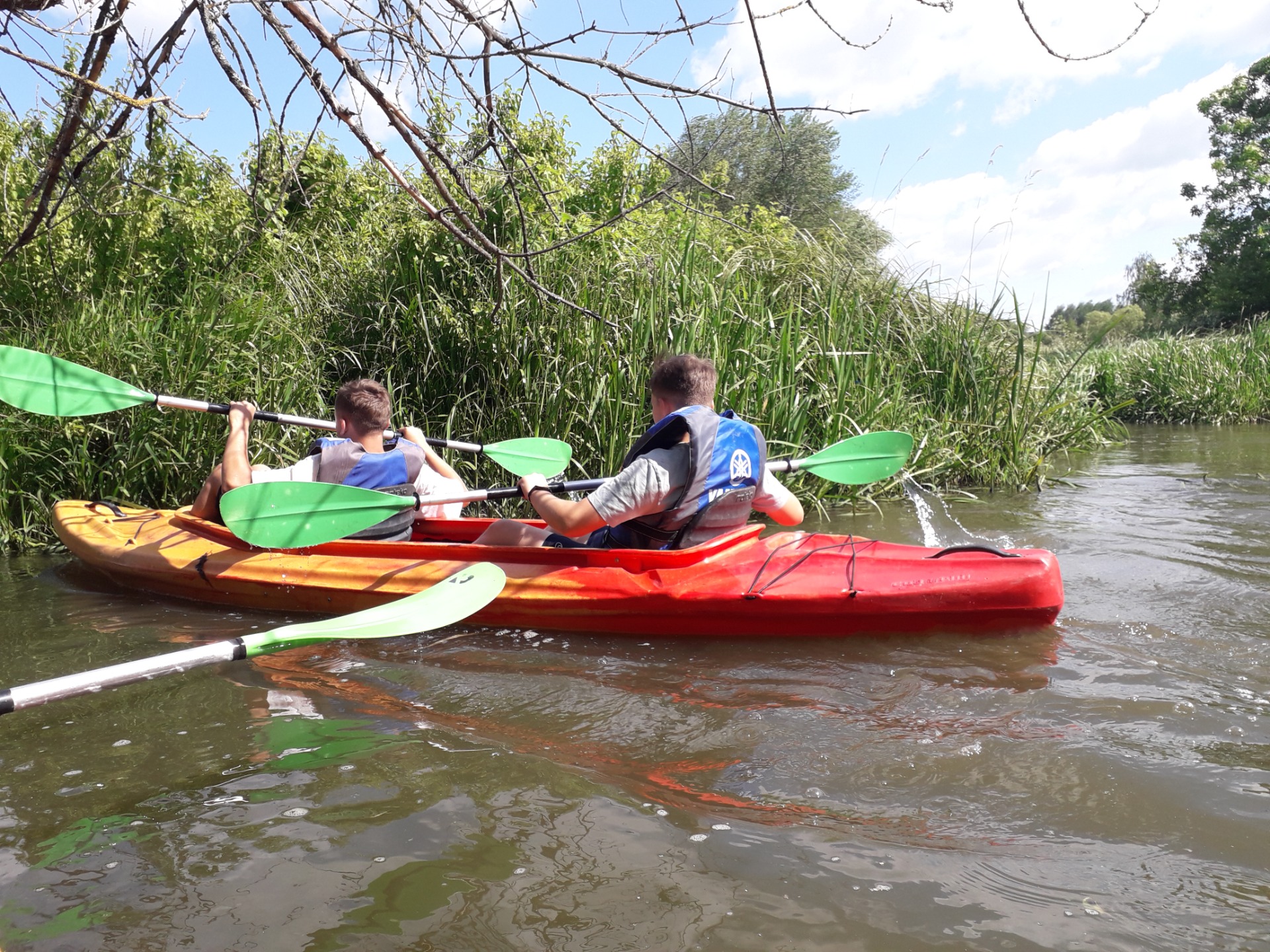 Dnia 25 czerwca 2025 roku klasa 7 wybrała się na wyjątkową wycieczkę, której główną atrakcją był spływ kajakowy rzeką Sanną. Wyjazd rozpoczęliśmy wcześnie rano – zebraliśmy się przed szkołą, skąd cała klasa wyruszyła na rowerach do Zaklikowa. Trasa rowerowa była malownicza i niezbyt wymagająca, a pogoda dopisywała – świeciło słońce, temperatura była przyjemna, a lekki wiatr umilał podróż. Po dotarciu do Zaklikowa zrobiliśmy krótką przerwę, a następnie spotkaliśmy się z instruktorem, który przeprowadził dla nas krótki kurs nauki obsługi kajaka. Dowiedzieliśmy się, jak prawidłowo wsiadać i wysiadać z kajaka, jak trzymać wiosło oraz jak manewrować na wodzie. Instruktor omówił także zasady bezpieczeństwa i sposoby reagowania w przypadku wywrotki. Dzięki temu czuliśmy się pewniej, zwłaszcza ci, którzy pierwszy raz mieli styczność z kajakami. Po szkoleniu rozpoczęliśmy spływ kajakowy. Trasa prowadziła z Zaklikowa do miejscowości Irena i obejmowała odcinek pełen zakrętów, przeszkód i pięknych widoków. Płynęło się bardzo przyjemnie, choć nie obyło się bez niespodzianek. Po około godzinie napotkaliśmy zwalone drzewo, które blokowało koryto rzeki. Konieczne było wyjście z kajaków i ich przeniesienie. Towarzyszyło temu wiele śmiechu, szczególnie gdy jedna z naszych koleżanek poślizgnęła się i wpadła do wody, gubiąc przy tym jednego klapka. Po krótkim relaksie wróciliśmy do Zaklikowa, skąd ponownie wyruszyliśmy na rowerach w drogę powrotną do domu. Cała wycieczka była niezwykle udana – dopisała pogoda, humory i atmosfera w grupie. Połączenie rowerowej wyprawy z nauką i spływem kajakowym okazało się świetnym pomysłem na aktywne zakończenie roku szkolnego. Te wspólne przygody z pewnością na długo zostaną w naszej pamięci.